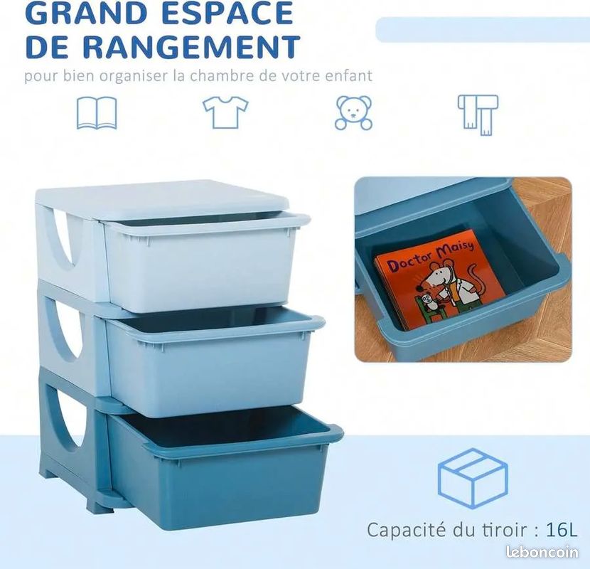 Tour De Rangement Enfant HOMCOM Organisateur De Jouets Pour Enfants Avec Tiroirs à 3 Niveaux, Boîtes De Rangement En Plastique, Coffre à Jouets Pour Chambre D'enfant, Crèche, Salon, Pour Garçons Et Filles tiroir interne : 33L x 31,5l x 15H cm., Charge max. Trois tiroirs offrent beaucoup d'espace de rangement pour les jouets et les objets préférés de toutes sortes. Avec ces boîtes de rangement de HOMCOM, ranger devient un jeu d'enfant L'organisateur de jouets épuré de HOMCOM optimise l'espace avec ses grands bacs amovibles, facilitant l'accès et la recherche pour les enfants. Idéal pour les maisons avec peu de place, il offre un rangement pratique et une surface facile à nettoyer TIROIRS ENTIÈREMENT AMOVIBLES : Accédez facilement aux jouets grâce aux tiroirs du coffre à jouets, entièrement amovibles pour permettre à vous ou à votre enfant de récupérer facilement l'objet désiré, puis de replacer le tiroir sans effort. Parfait pour les enfants de 3 à 6 ans. Armoire Enfants Rangement Armoire à Tiroirs HOMCOM Enfant 6 Niveaux Bleu - 75x37x57 Cm - Organisateur Jouets 3-6 Ans Tiroirs Rangement SPÉCIFICATIONS SUR LE RANGEMENT DES JOUETS POUR ENFANTS : Dim. Descriptions Longues:L'organisateur de jouets épuré de HOMCOM optimise l'espace avec ses grands bacs amovibles, facilitant l'accès et la recherche pour les enfants. recommandée (par niveau) : 10 kg ● Capacité du tiroir : 16 L ● Norme de sécurité : EN71-1-2-3 ● Réf. Idéal pour gérer l'augmentation des jouets. COMPACT AVEC GRANDS TIROIRS : Optimisez l'espace avec ce petit organisateur de jouets qui offre 3 tiroirs (16 l au total) pour stocker efficacement de nombreux objets. ADAPTÉ AUX PETITS : Avec sa hauteur de 56,5 cm, ce coffre à jouets est accessible aux enfants dès l'âge de trois ans, favorisant leur autonomie et facilitant l'accès aux jouets. FACILE À NETTOYER : Conçu pour simplifier la vie, ce meuble de rangement pour enfants en PP se nettoie rapidement, permettant d'éliminer les taches et les marques sans tracas, contrairement aux tiroirs en tissu ou en bois moins pratiques. Conçu pour la simplicité et l'efficacité.