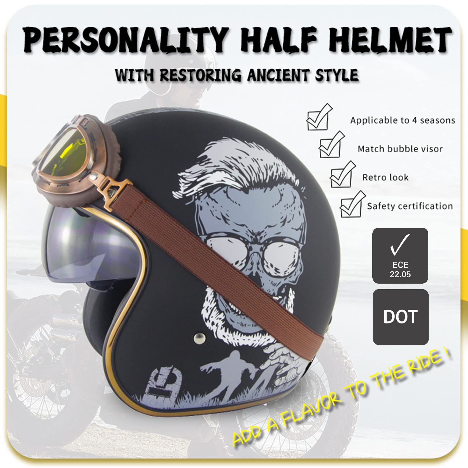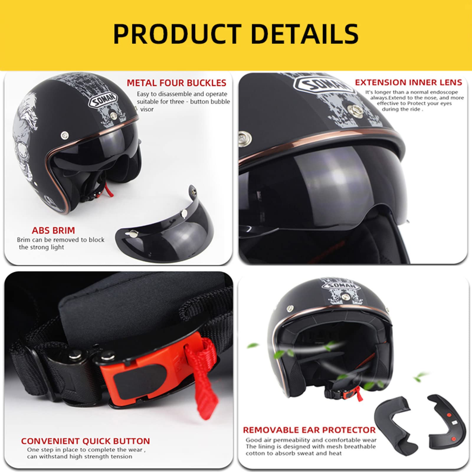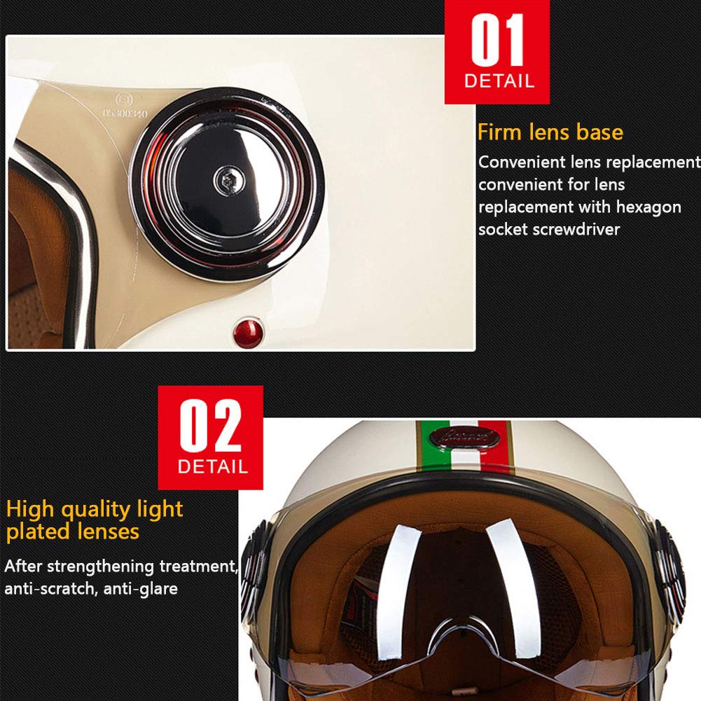 Pourquoi avez-vous besoin d’un casque de moto ? La moto est un moyen de transport relativement dangereux. Casque jet moto : Quel est le meilleur en 2025 Un accident peut avoir de graves conséquences. Respecter ou dépasser les normes de sécurité vous protégera des accidents et assurera votre sécurité ! Elle prolonge la durée de vie du casque, garantissant ainsi votre santé et votre confort à chaque sortie. Casque Rétro Scooter Cruiser Casque Jet Moto Vintage 3/4 Demi Casques Casque Moto Avec Lunettes Style Rétro Jet Casque Cyclomoteur Scooter Casque Pour Homme Et Femme Adultes Casque Demi-jet Vintage Homologué ECE2205 Pour éviter les mauvaises odeurs, il est important de contrôler la quantité utilisée. ✔ Design rétro : un casque de moto demi-bouclier 3/4, reflétant l'atmosphère rétro d'un casque de pilote des années 1950, avec une bonne ventilation et un large champ de vision, parfaitement assorti à votre moto de rue élégante, adapté aux croiseurs, voitures de tourisme, scooters et cyclomoteurs. ✔ Conception de boucle à dégagement rapide : ce casque de moto rétro est équipé d'une mentonnière souple et d'une boucle à dégagement rapide, ce qui vous permet de mettre ou de retirer rapidement le casque en cas d'urgence, économisant ainsi chaque seconde pour votre sécurité. ✔ Certification de sécurité : Ce casque est conforme aux normes de sécurité DOT FMVSS-218 / ECE 2205, ce qui en fait un choix idéal pour vous et votre famille. Rétro Casque à Face Ouverte Demi-Jet ,Fibre De Verre ✔ Matériau : Coque robuste en plastique ABS technique associée à une mousse de rembourrage haute densité. Casques de moto professionnels : respectent ou dépassent les normes de sécurité FMVSS-218, DOT et ECE-2205. · ☞ Excellent matériau