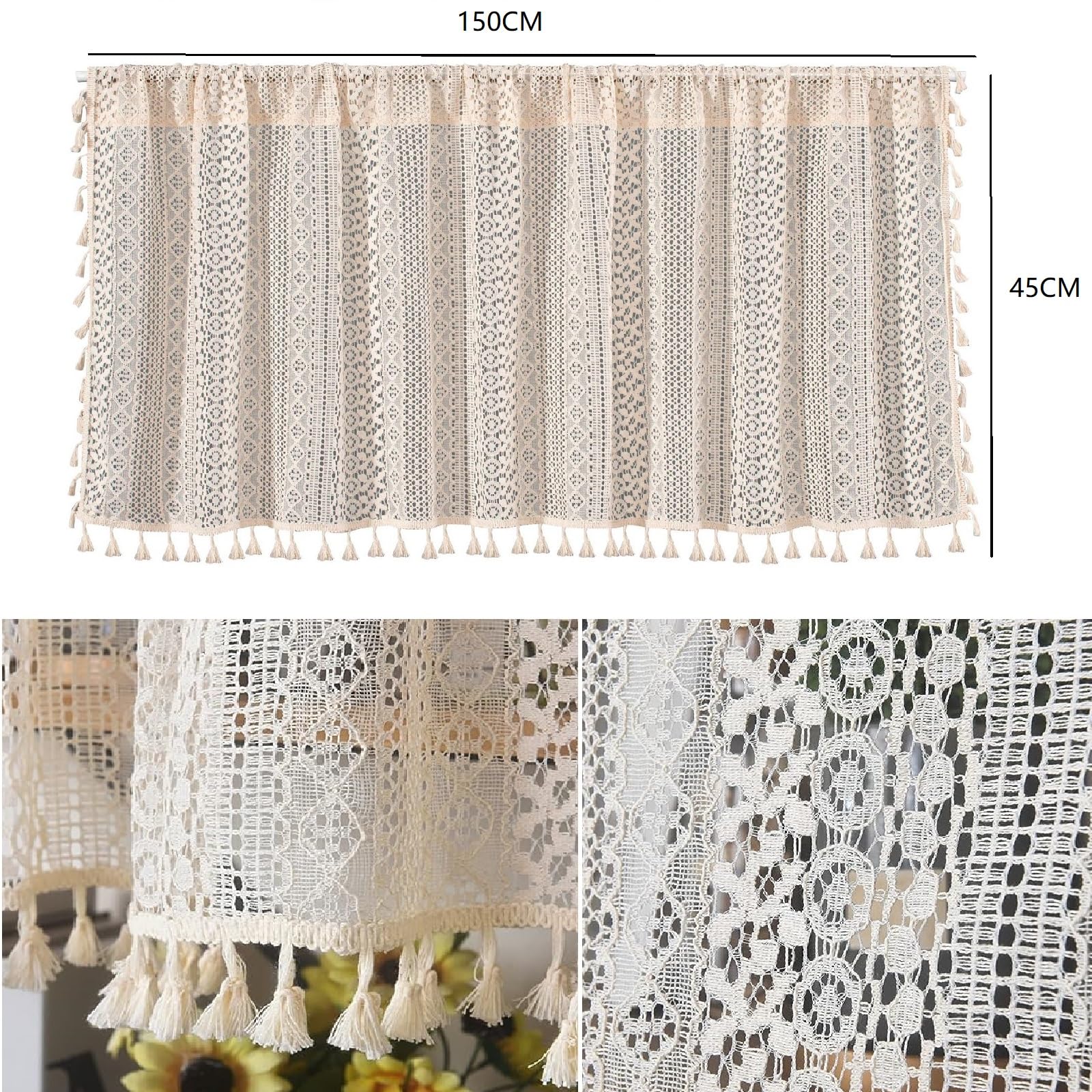 Les mesures étant prises à la main, les tailles indiquées peuvent varier de 2 à 3 cm. DIMENSIONS : la hauteur verticale est de 90 cm et la largeur horizontale de 200 cm. Multifonction : très beau rideau de bistrot élégant rideau de cuisine prêt à l'emploi pour votre cuisine, café, apprentissage, salon, chambre d'enfant. Les rideaux brise-bise - Une manière simple d’habiller votre maison Le paquet : 1 x rideau court Tolldek H x l : 90 x 200 cm - Rideaux brise-bise et stores courts pour salle de bain - Motif floral vintage bohème avec pompon - En voile beige - 1 pièce - En coton semi-transparent Rideau Vintage Tolldek H X L : 90 X 200 Cm - Rideaux Brise-bise Et Stores Rideau 90x200 Cm Motif Floral Bohème TOPICK Lot de 2 Rideaux Cuisine Dentelle Rideau Blanc avec otif de...