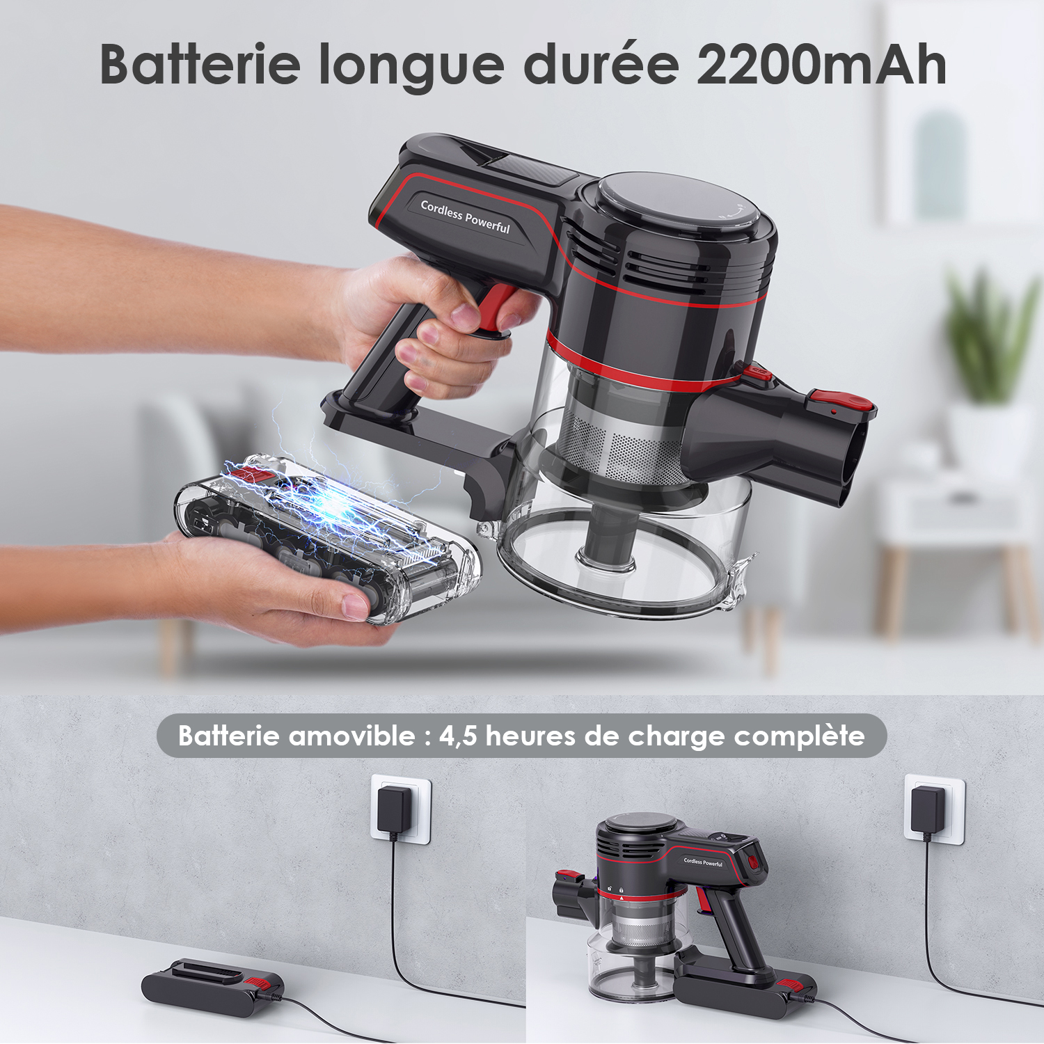 Changez facilement entre les modes d'aspiration (Faible, Moyenne, Haute) d'un simple toucher, pour répondre à tous vos besoins. Avis BuTure Aspirateur Balai sans Fil, 33KPA/450W pas cher 【Aspiration Puissante de 48 kPa pour un Nettoyage en Profondeur】Profitez de performances de nettoyage inégalées avec une puissance d'aspiration de 48 kPa. L'affichage haute définition garantit une lisibilité optimale. La liberté du sans-fil vous permet de nettoyer partout sans limites. Que ce soit pour une pause pendant le nettoyage ou son stockage, le design autoportant assure stabilité et gain de place, alliant puissance et praticité. Idéal pour les grandes maisons sans interruptions. Aspirateur balai sans fil - EZICLEAN - Cyclomax R12 Flex - 30 min - 200 W - 20 kPa - Gris 【Système de Filtration Cyclonique Multi-cônes Avancé】Le système de filtration cyclonique multi-cônes garantit une aspiration puissante et constante, tout en maintenant un intérieur plus propre et sain. 【Autonomie Jusqu'à 70 Minutes】Avec sa batterie haute capacité amovible, cet aspirateur offre jusqu'à 70 minutes de nettoyage continu sur une seule charge. L'aspirateur est équipé d'une brosse rotative anti-enchevêtrement innovante, réduisant jusqu'à 80% l'accumulation de poils d'animaux et cheveux sur le rouleau. L'aspirateur-balai est de plus en plus adopté par les ménages français. Simple et pratique, il séduit surtout par sa maniabilité et son utilisation sans fil. Mais ils ne sont pas tous aussi... XT1 Aspirateur Balai Sans Fil, 48 Kpa Et 70 Min Aspirateur Sans Fil Puissant Avec Technologie Cyclonique Et Anti Enchev Trement Aspirateur Balai Pour Les Poils D Animaux Tapis Sols Durs De 99 00 Eur 75 05 Eur Remise 24 【Technologie Anti-enchevêtrement】Dites adieu aux poils coincés !
