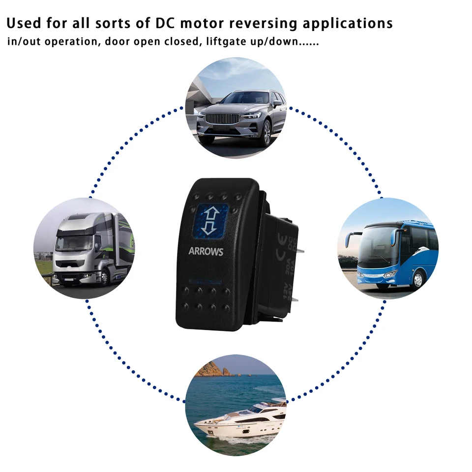 Interrupteur à bascule à polarité inversée 30A 12V DC, contrôle du moteur, prise d'alimentation RV DPDT, interrupteur momentané pour voiturette de golf pour 5ème langue de roue Interrupteur électrique Robuste Interrupteur à Bascule Momentané Avec Inversion De Polarité, Moteur 20A 12V DC, 6 Broches, Flèches Bleues (ON) OFF (ON), Interrupteur à Bascule à Réinitialisation Automatique Accessoire électrique Voiture Bateau Le boîtier ignifuge composé de matériaux de haute qualité garantit une sécurité et une durabilité accrues dans tous les environnements d'exploitation. Spécification Couleur : noir Matériau : alliage d'aluminium Nombre de connexions : 7 broches Tension/Courant : 15A 250V AC/ 20A 12V DC La livraison comprend 1x interrupteur à bascule en aluminium 4x vis de fixation 4x bornier bleu Il convient également aux appareils ménagers, aux distributeurs d'eau et aux moteurs, ce qui en fait un interrupteur polyvalent avec un large éventail d'applications. Le commutateur d'inversion de polarité DPDT robuste contrôle le mouvement haut/bas, dans le sens des aiguilles d'une montre/dans le sens contraire des aiguilles d'une montre des charges CC (par exemple moteurs, palans, grues, actionneurs linéaires, etc Construction robuste : avec des sorties nominales de 15A 250V AC et 20A 12V DC, cet interrupteur a une capacité de charge élevée et une durée de vie électrique de plus de 10 000 cycles. Rouge -12V 20A 7 broches treuil de voiture dans le treuil sur... La conception à encliquetage permet une installation rapide et facile sans outils supplémentaires. Large application : cet interrupteur à bascule convient à une grande variété de véhicules tels que les voitures, les camions, les bateaux et les motos.