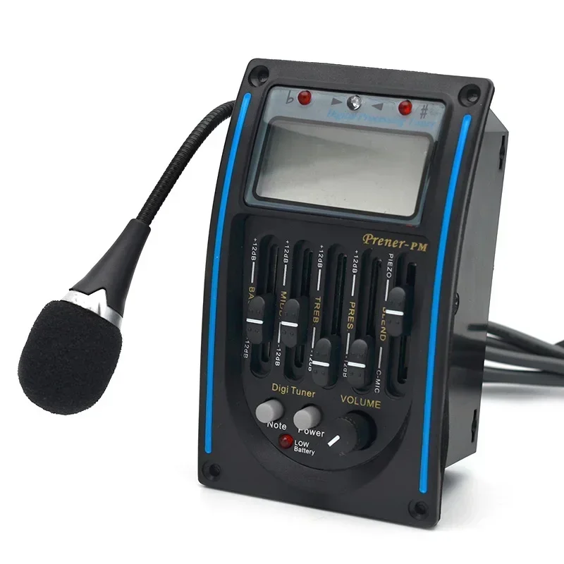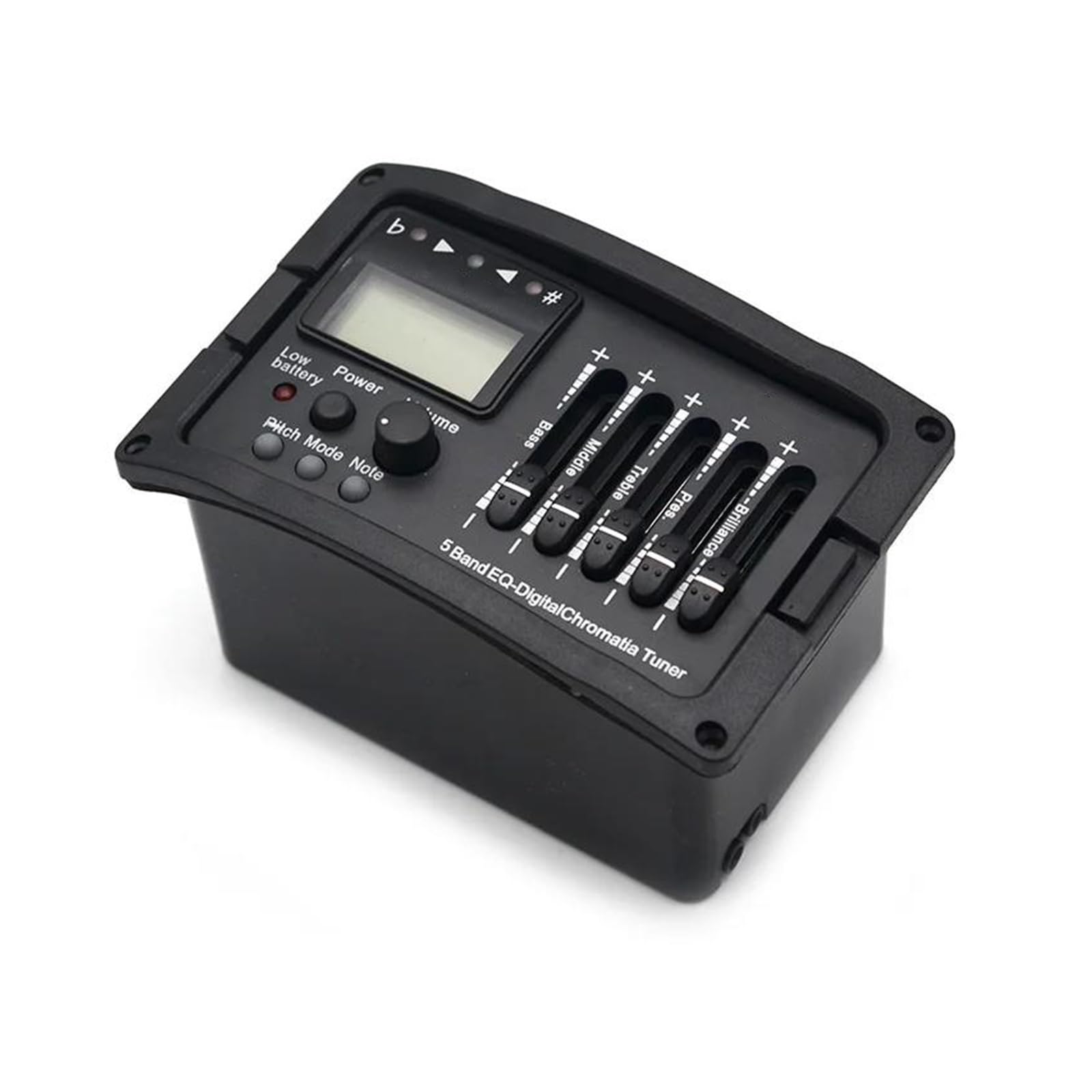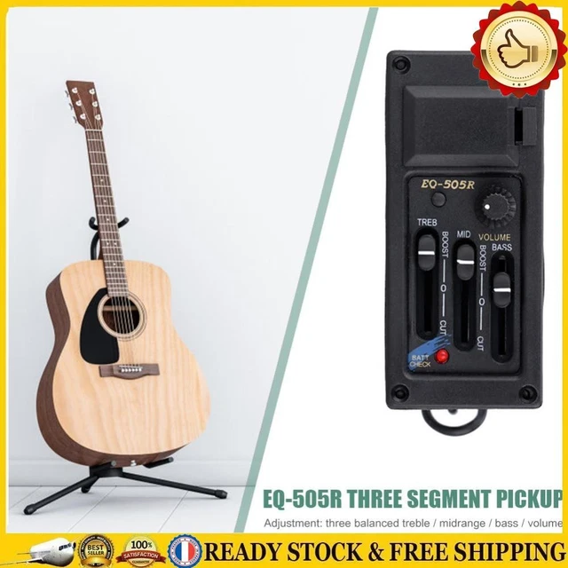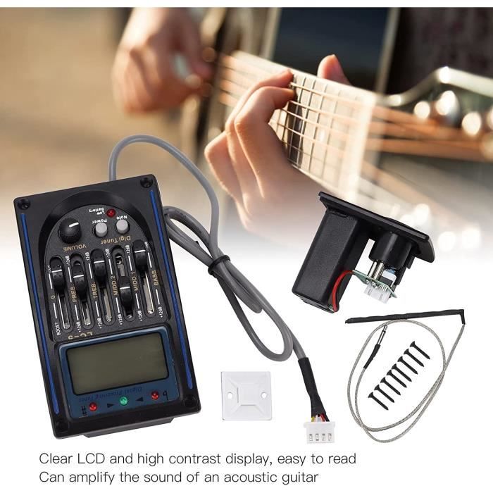 Accordeur intégré et micro piézo pré-câblé : comprend une barre de micro piézo de 35 cm et un accordeur LCD pour un calibrage de la hauteur en temps réel (précision de ± 0,5 centième). Ce système d'égaliseur pick-up à 5 bandes s'installe facilement dans votre guitare acoustique et il est indispensable d'électrifier et d'amplifier leur son Caractéristiques Annulation de l'inversion de phase : les sorties symétriques compatibles XLR minimisent le bourdonnement dans les systèmes de sonorisation. Se monte facilement sur la plupart des guitares acoustiques - aucune soudure ni expertise technique n'est requise. Utilisez les coussinets en coton fixes pour atténuer le retour lors des performances à volume élevé. Fixez la plate-forme de sortie (6,5 x 5 cm) à votre guitare, mandoline ou ukulélé en quelques minutes. Commandes antidérapantes : les curseurs d'égalisation nervurés garantissent des réglages de performance moyenne. Préampli Guitare Acoustique LCD 5 Bandes EQ LC-5 Equalizer Personnalisez votre son pour le fingerstyle, le strumming ou les performances en direct. Clarté de la scène : la plage de fréquences de 20 Hz à 20 kHz capture les harmoniques subtiles. Égaliseur de précision à 5 bandes pour un son de qualité studio : réglez les basses (60 Hz), les médiums (500 Hz), les aigus (2,2 kHz), la présence (8 kHz) et le volume avec des curseurs ergonomiques. Préampli guitare micro guitare acoustique amateurs de guitare 4 bandes... Préampli Guitare Acoustique Avec Accordeur Préampli Guitare Acoustique 5 Bandes Avec Accordeur LCD Micro Piézo Pré-câblé Montage Facile Composants résistants à la chaleur : fonctionnement stable dans des environnements jusqu'à 40 °C.