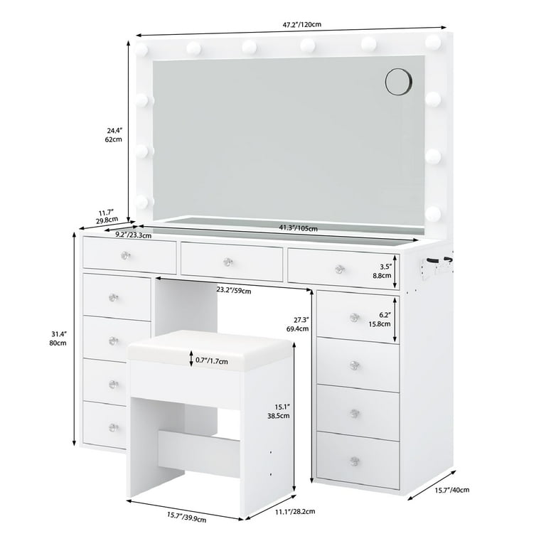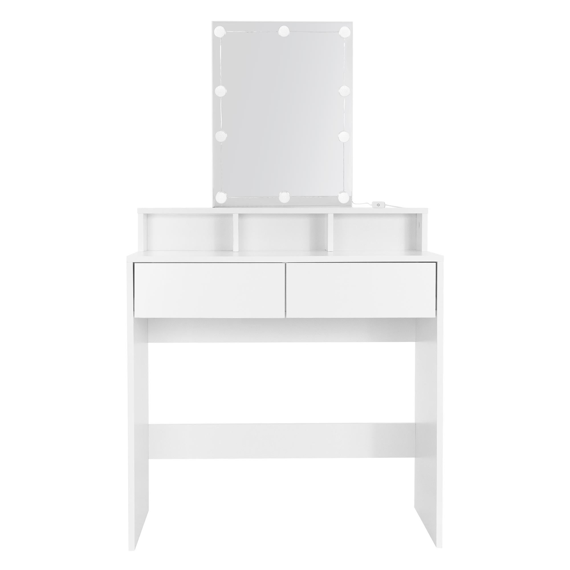 Comparatif : Les 4 meilleures coiffeuses avec miroir LED 2025 Miroir Coiffeuse Coiffeuse Avec Miroir Et LED Table De Maquillage MDF Avec 2 Tiroirs 80x40x140 Cm 86728252 Grand Miroir Tabouret Confortable Inclus : Le tabouret assorti est rembourré avec de la mousse ignifuge douce, et se glisse discrètement sous la coiffeuse, pour un espace toujours dégagé. Éclairage Hollywoodien à 3 Niveaux : Grâce à son miroir HD et ses 12 lampes LED, cette coiffeuse offre une lumière chaude, neutre ou froide. Tout est pensé pour votre confort quotidien. Coiffeuse Élégante avec station de charge,Table de Maquillage avec éclairage LED Grand miroir 11 Tiroirs,Blanc et Marron(Sans tabouret Offrez-la à votre fille, votre épouse ou votre petite-fille : un cadeau pratique et raffiné. Grand bureau adapté pour le maquillage et le stockage des cosmétiques quotidiens ou utilisé comme lieu de bureau temporaire. 11 tiroirs pour plus d'espace de rangement : 3 tiroirs principaux peuvent stocker des accessoires pour cheveux, de la poudre de bijoux, le dessus en verre pratique pour profiter ou trouver des bijoux et vos effets... En cas de doute, contactez directement le vendeur pour une solution rapide. Station de Charge Intégrée et Support pour Sèche-Cheveux: Dotée de 2 prises classiques et 2 ports USB, cette coiffeuse permet de brancher vos appareils électriques tout en rechargeant vos appareils mobiles.
