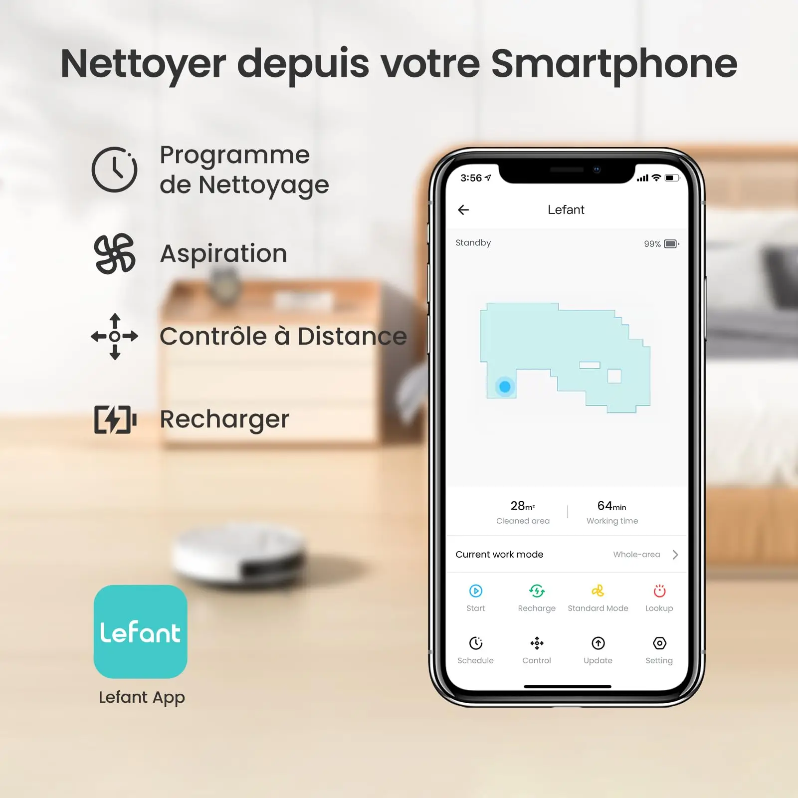 LEFANT Aspirateur Robot, Robot Aspirateur ince Silencieux Connecté avec WiFi/Bluetooth/Alexa Robot Aspirateur Intelligent Test Lefant M210 Pro+ : Aspirateur Robot Puissant Et Silencieux Robot Aspirateur Lefant 【6 Modes de Nettoyage】le aspirateur robot automatique peut être commuté de manière flexible entre différents modes via APP (①Nettoyage automatique ②Nettoyer des bords ③Nettoyer en point fixe ④Nettoyer en zigzag⑤Planifier le mode de nettoyage⑥Manuel) pour répondre aux différents besoins de nettoyage de la famille. 1 Évitement d’obstacles PSD 2 Freemove 3., 0 3 Enchevêtrements 0% 4 Nettoyage Efficace Lefant M210 Pro+, un robot aspirateur innovant alliant puissance supérieure, intelligence et polyvalence pour un nettoyage domestique simplifié. Avis Lefant M210: Aspirateur Robot Connecté WiFi/Alexa 2025 Doté de fonctionnalités avancées et d'un design pensé pour les intérieurs modernes, il devient l'allié idéal pour maintenir un environnement intérieur impeccable. Avec son corps compact et sa puissante buse sans brosse, cette version améliorée de mini aspirateur robot M210 Pro élimine facilement les poils et la poussière sous ou dans les crevasses des lits, canapés et autres meubles sans s'emmêler 【Forte Aspiration 4000Pa】La fonction balai est avantageuse pour ses 2 brosses latérales en caoutchouc pour nettoyer sol facilement la poussière et polis, et sa bouche d'aspiration centrale qui avec une puissance d'aspiration jusqu'à 4000Pa max pour un nettoyage stable et uniforme dans toute la pièce. 1 Contrôle de l’application 2 Nettoyer à tout moment 3 Connecter à l’application