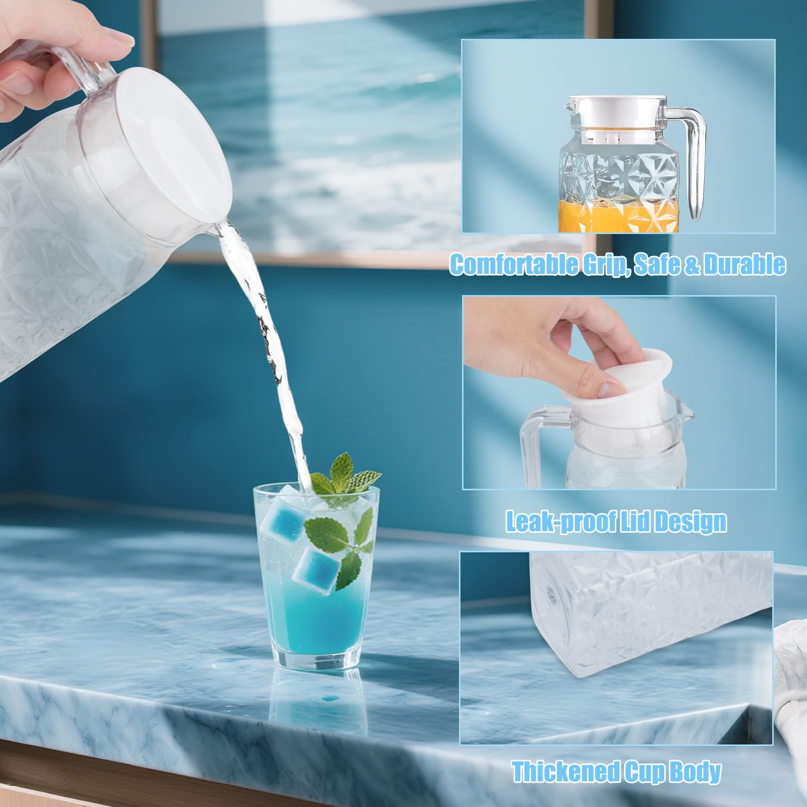 Grâce à sa construction anti-fuite, votre table reste propre et la carafe à eau transparente est facile à transporter. Lot de 2 carafes à eau de 1,1 l avec couvercle et poignées : carafe à eau transparente, en plastique transparent, sans BPA et incassable, pichet en acrylique pour thé glacé, sangria, limonade Caractéristiques du produit : Capacité : 1,1 l Matériau : PC de haute qualité (sans BPA, incassable) Poids : 170 g., Hauteur : 24 cm. Que ce soit à l'intérieur ou à l'extérieur, cette carafe à eau avec couvercle est le choix idéal pour toutes les occasions. La carafe à eau transparente peut être utilisée pour l'eau, le jus, le thé glacé ou même les boissons chaudes. Qu'il s'agisse d'eau, de thé glacé ou de boissons chaudes, la carafe à eau transparente permet un versement sans effort et précis. Ce matériau assure une longue durée de vie et un service neutre au goût. Achetez vos carafes à eau, brocs et pichets… Et faites vous livrer dans 3 jours en relais colis Diamètre : 7,5 cm Résistance à la température : de -20 °C à 120 °C. Lot De 2 Carafes À Eau De Chevet De 360 Ml Avec Gobelet Pour Table De Lot 2 Carafes Pratique Pichet à Eau En Plastique Transparent Avec Couvercle - 2 L - Carafe Incassable - Distributeur De Boissons - Bouilloire D'eau Froide Pour Thé Glacé, Limonade, Jus, Lait (958,2 G Carafe Incassable 1,1 Litre Versement facile : avec un bec spécialement conçu, la carafe à eau avec couvercle assure une distribution contrôlée du liquide. Contenu de l'emballage : 2 pichets à eau transparents (1,1 l). Contenu de l'emballage : le lot comprend 2 pichets à eau transparents, parfaits pour un usage quotidien. Couvercle anti-fuite et poignée confortable : la carafe à eau avec couvercle dispose d'un bouchon sécurisé qui empêche les gouttes et les déversements. La poignée ergonomique permet une manipulation confortable, même lorsque la carafe d'eau claire est remplie.