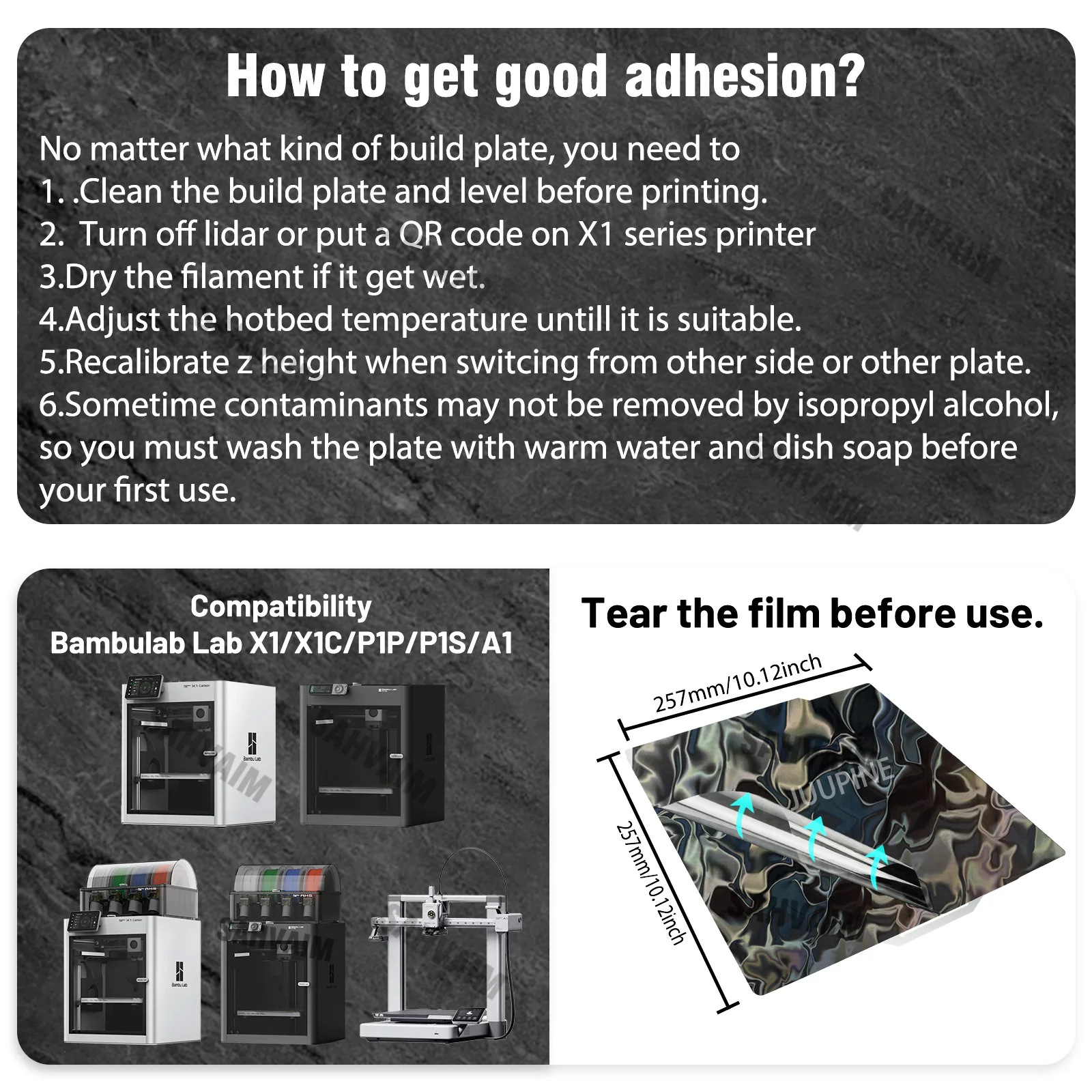 En fonction des paramètres recommandés pour vos consommateurs, il est recommandé que la température de la buse de la première couche soit de 10 °C plus élevée que celle des autres couches. Juupine-Plaque de construction H1H pour Bambu Lab X1c, P1s, A1, Bambu Carbon, 257x257 Pei Plate, Spring Steel Technologie d'étching récemment améliorée : ce filament en bambou est spécialement conçu pour les imprimantes 3D Bambu Lab. Il dispose de textures uniques sur les deux côtés, avec un motif flocon de neige sur un côté et un motif Vortex de l'autre côté Fabriqué en acier à ressort de 0,5 mm d'épaisseur : en utilisant une plaque en acier magnétique de 0,5 mm d'épaisseur et une dureté de 580HV pour le support, il a une forte force de rétention magnétique, ce qui peut limiter physiquement votre impression et éviter la déformation. La première vitesse de la couche est recommandée de 10 à 50 mm/s. Il a une bonne souplesse et élasticité, et même après plusieurs plis, il ne se déforme pas facilement. Comparé aux plaques de construction holographiques traditionnelles, il a une durée de vie plus longue et aucun souci de détachement du film, ce qui rend votre expérience d'impression 3D plus stable et fiable. Sec après le nettoyage. Le filament en bambou pour Bambulab A1/P1P/P1S/X1/X1C/X1E adopte un design innovant à texture double face (surface flocon de neige + surface torsadée), combiné avec des matériaux de haute qualité résistants aux températures élevées pour assurer un ajustement stable et une sortie de haute qualité sous divers matériaux d'impression. Bambu Lab P2s JUUPINE Plaque Pour Bambulab A1/X1C/X1E/X1/P1P/P1S, Plaque De Plateau Magnétique Impression 3D Résistance à haute température : la plaque de construction flocon de neige pour imprimante 3D en bambou peut résister à des températures élevées jusqu'à 200 °C. Juupine-Plaque de construction pour laboratoire Bambu A1, feuille de bambu bronchpei Pey Peo 257x257, tôle d'acier pour laboratoire X/s P1S H1H Phantom ; Produit... Nous vous recommandons différents filaments et leur Températures suggérées pour les utilisateurs : TPU : 30-35 °C ; PLA : 40-65 °C ; PETG : 50-80 °C ; ABS 80-120 °C ; ASA : 80-120 °C. Il est particulièrement important de noter : ne pas utiliser de nettoyants « acidiques, alcalins » pour laver (tels que savon, poudre de lavage, liquide de lavage, savon à vaisselle, etc. Il dispose de textures uniques sur les deux côtés, avec un motif flocon de neige sur un côté et un motif Vortex de l'autre côté. En sélectionnant « Plaque PEI texturée » dans le logiciel de découpe et nettoyage de la plaque de construction en bambou avant chaque utilisation, une excellente adhérence peut être achieve. Elle n'affecte pas l'impression du sable de la série Pi A1., Attention et comment nettoyer : notre plaque de construction texturée double face est adaptée aux imprimantes 3D avec une taille de plate-forme de 257 x 257 mm et est compatible avec Bambu Lab X1C/X1/X1E/P1P/P1S/A1., Veuillez vérifier le type d'imprimante avant d'acheter. Fermez le ventilateur soufflant au premier sol lorsque vous imprimez du PLA. Il est recommandé que la première couche du modèle de tranche soit de 0,2 mm. Ses caractéristiques faciles à nettoyer, de haute durabilité, ainsi que la fonction de nivellement automatique du code QR retenue, apportent aux utilisateurs une expérience d'impression pratique, efficace et à faible coût, ce qui est une combinaison parfaite de technologie et d'esthétique.