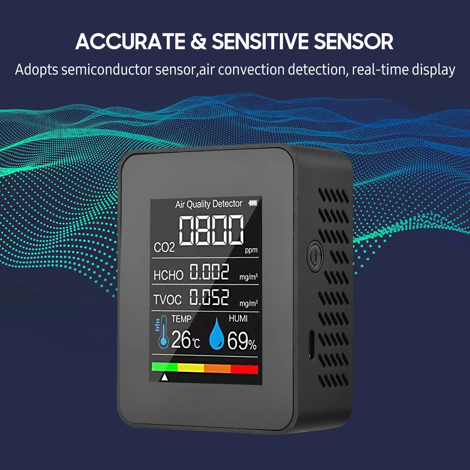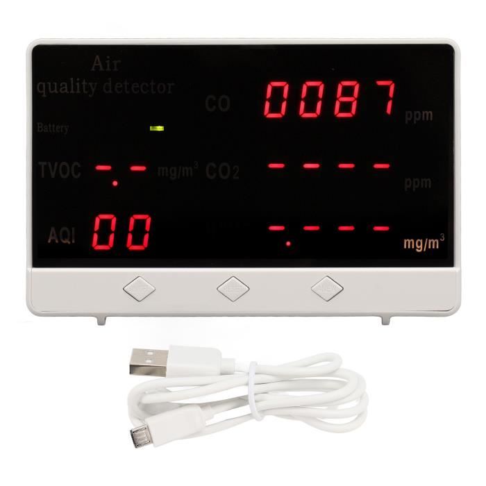 TEMPÉRATURE TESTEUR TCOV Mètre Hcho Moniteur Capteur De Pollution De L Testeur Humidité Testeur Qualité Air 5 En 1 - CO2, HCHO, TVOC, Température, Humidité - Affichage LED - Alarme - Blanc Testeur Sel Piscine Testeur Pollution Intérieure Écran numérique, facile à reconnaître et à lire. Spécifications : Type d'article : Détecteur de qualité de l'air Matériau du produit : ABS Informations sur la batterie : Batterie au lithium 1 200 mAh (livrée avec batterie intégrée) Mode d'affichage : Écran couleur et Écran rétroéclairé HCHO : 0 à 9,999 mg/m³ TVOC : 0 à 9,999 mg/m³ CO2 : 400 à 5 000 ppm Température : 0 à 50 ℃ Humidité : 20-90 % HR Comment utiliser : Appuyez et maintenez enfoncé le bouton de mise sous tension et le produit entrera dans l'état de préparation, lorsque la préparation est terminée, la valeur du test peut être affichée . protégez toujours vous et votre maison dans des conditions d'air saines. Le moniteur de qualité de l'air multifonction 5 en 1 peut détecter le CO2, le HCHO (formaldéhyde), le COVT, la température et l'humidité dans votre environnement de vie. Adoptant un capteur sensible, il fournit des données rapides et précises sur l'écran couleur numérique LCD BATTERIE LONGUE DURÉE : Avec sa batterie rechargeable intégrée de 1 200 mAh, le détecteur garantit des performances durables, ce qui en fait un excellent outil pour la surveillance continue de la qualité de l'air. APA_PM10 – Moniteur de Qualité de l’Air CO2, PM 2.5, PM 1.0, PM 10... PORTABLE ET PRATIQUE: Le détecteur de qualité de l'air est compact, facile à transporter et à ranger, facile à utiliser, avec de bonnes performances et une longue durée de vie. MULTIFONCTIONNEL : Le testeur de qualité de l'air détecte le CO2, le HCHO, le TVOC, la température et l'humidité.