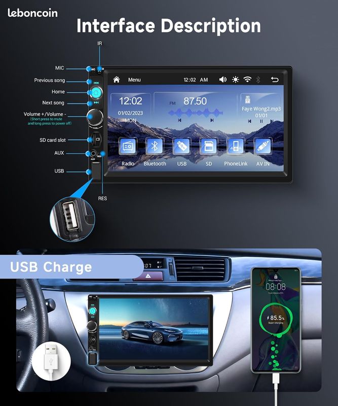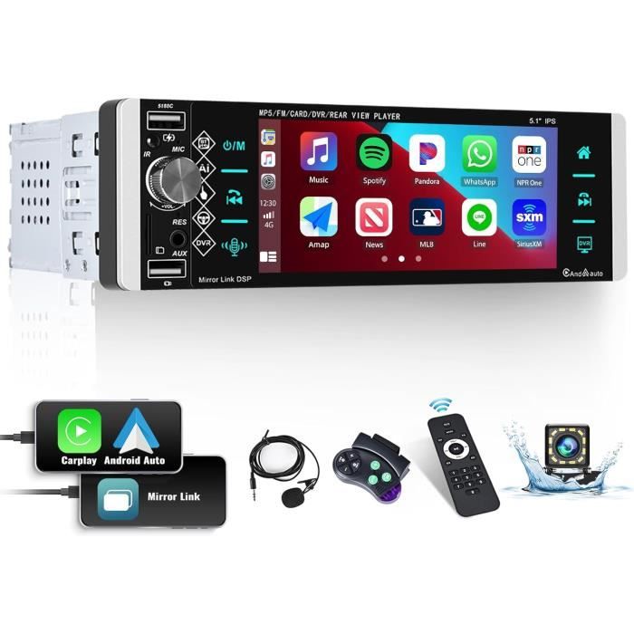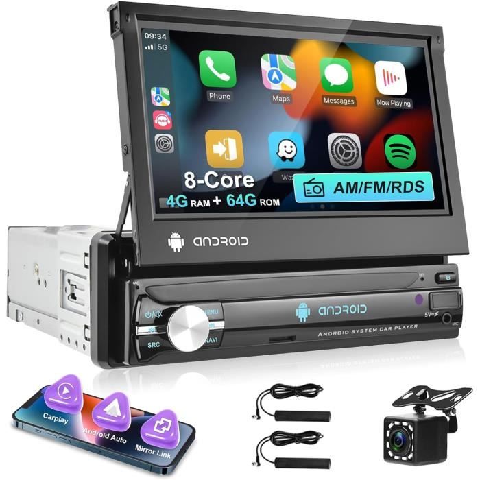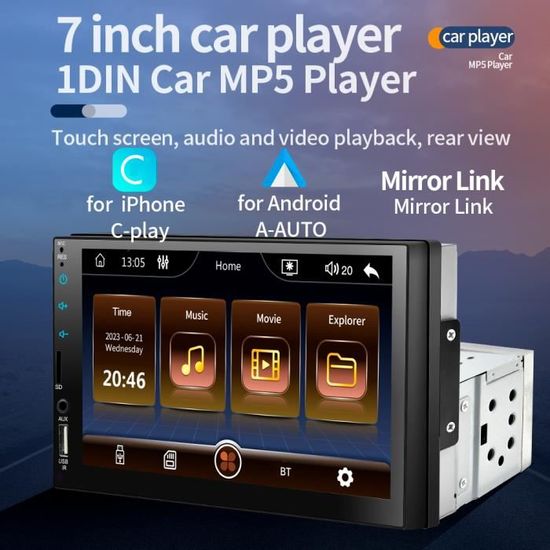Bluetooth&Caméra de Recul HD : cette autoradio android auto équipée du Bluetooth améliore la sécurité et le confort grâce aux appels mains libres et à la diffusion de musique en continu. Découvrez l'autoradio 1 Din 7 pouces HD : une technologie avancée avec Carplay sans fil et Android Auto, idéale pour une expérience de conduite connectée et sans stress Carplay et Android Auto sans Fil: L'autoradio 1 din se connecte automatiquement à Carplay/Android Auto dès que vous montez dans la voiture. Elle comprend une caméra de recul HD étanche avec vision nocturne, qui affiche automatiquement la vue arrière sur l'écran lorsque vous reculez. Si vous avez des problèmes de compatibilité, d'installation ou d'utilisation, n'hésitez pas à nous contacter à tout moment Veuillez vous assurer que l'emplacement réservé à l'installation dans votre voiture correspond aux dimensions spécifiées La fonction Mirror Link permet une connectivité transparente entre votre smartphone et le système audio de votre voiture. 4GB+64GB Autoradio Android 1 Din 8 Core avec Carplay sans Fil, Android De plus, l'égaliseur vous permet de personnaliser votre expérience d'écoute pour un plaisir audio optimal Vous pouvez facilement accéder à diverses applications téléphoniques sur l'écran tactile de l'autoradio: Contrôle vocal Siri/Goo-gle, cartes, musique, appels, messages, etc. Restez connecté à la musique, aux actualités et au trafic. Cet autoradio est compatible avec la plupart des modèles de voitures, notamment les plus anciens. Il est doté d'un écran tactile de 7 pouces réactif et rapide... Sans Fil Carplay Autoradio 1 Din avec Sans Fil Android Auto FM/AM/RDS Radio Bluetooth Mains Libres 5.1 Pouces Autoradio avec Mirror Link Bluetooth USB/ AUX/TF/EQ/DVR Commandes au Volant Caméra de Recul Vous pouvez également afficher l'écran de votre téléphone sur l'écran de la voiture pour faciliter la navigation et le divertissement, rendant votre conduite plus sûre et plus agréable