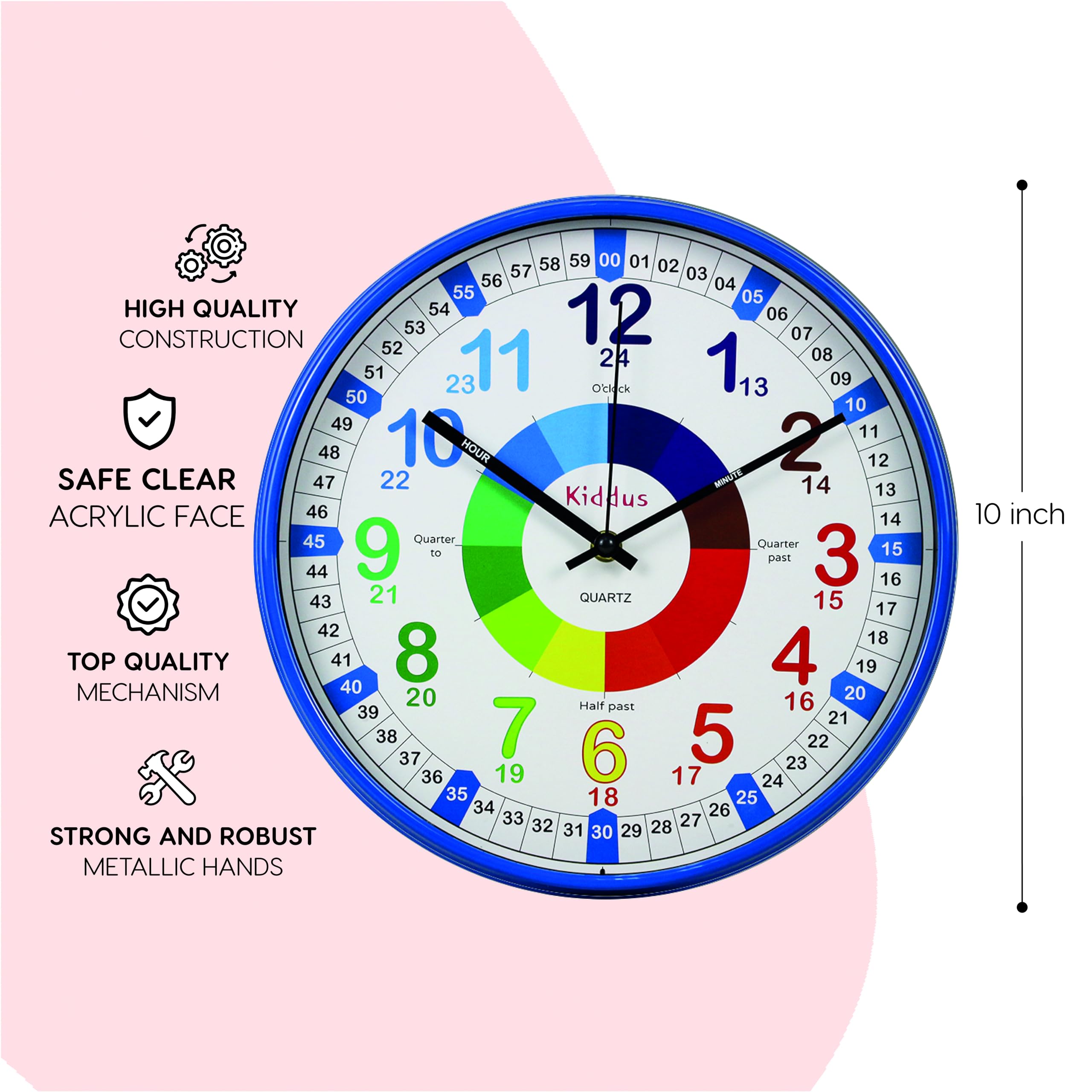 Finition de haute qualité Nos horloges éducatives présentent tous les chiffres des minutes de manière claire et simple. Votre enfant apprendra à lire et à raconter l'heure sans s'en rendre compte. Horloge Silencieuse Quart Kiddus Horloge Murale Éducative Pour Enfants, Garçon, Fille. Time Teacher Analogique Avec Exercices. Mécanisme En Quartz Silencieux Horloge Murale Enfant En outre, une feuille de travail avec des tâches spécifiques pour pratiquer l'heure avec votre enfant est incluse. Pink Time Teacher XL - Horloge Éducative pour Enfant Si vous avez des problèmes avec la montre, contactez-nous et nous vous aiderons. Chaque minute est représentée, ce qui facilite la lecture précise de l'heure, améliorant ainsi efficacement la compréhension du temps. Ce code couleur astucieux aide les enfants à associer visuellement les heures et les minutes, ce qui fait de l'apprentissage de la lecture de l'heure une expérience visuellement stimulante et amusante. Restriction de l'utilisation de substances dangereuses dans la fabrication d'équipements électriques pour protéger la santé et l'environnement. Format de l'heure 12h et 24h Achat sans souci : parce que nos produits sont soigneusement testés et fabriqués avec amour, nous croyons fermement en la qualité de nos produits. Outil éducatif interactif : en plus de marquer l'heure, notre horloge propose des exercices pour renforcer la compréhension des minutes et des heures, ce qui rend l'apprentissage amusant pour les enfants Apprendre à lire l'heure en toute simplicité : avec notre montre d'apprentissage, aucune connaissance technique n'est nécessaire. Qu'est-ce qui rend nos horloges murales uniques? Format de l'heure 12 et 24 heures. Horloges murales et montres-bracelets assorties Une feuille de travail avec des tâches spécifiques pour s'entraîner à l'heure avec votre enfant est également incluse. Mouvement fiable et silencieux : équipé d'un mécanisme à quartz de haute qualité sans tic-tac Emmenez l'éducation au temps partout où vous allez. Chiffres complets des minutes Cela permet d'enseigner l'heure de manière polyvalente. Nos horloges éducatives offrent l'option d'un format horaire de 12 ou 24 heures. Facile à accrocher au mur de la chambre d'enfant, de la salle de jeux, de la cuisine, de la salle de classe ou de l'école. Elle surveille l'utilisation des produits chimiques afin de garantir une utilisation sûre et de réduire les risques pour la santé et l'environnement. Choisissez la taille qui convient le mieux à votre espace Que vous souhaitiez mettre en valeur un coin spécial dans la chambre de vos enfants, ajouter une touche éducative à une salle de classe ou rehausser le décor d'une bibliothèque, d'une crèche, d'une salle de jeux, d'un couloir d'école, d'une académie de langues ou d'une salle de travaux dirigés, nous avons l'option parfaite pour vous. En tant que première montre pour les enfants qui apprennent à lire la montre, notre horloge d'apprentissage contient TOUS LES CADRATS DES MINUTES. C'est pourquoi nous offrons une garantie de remboursement inconditionnelle de 30 jours et une garantie de 12 mois. Pratique, utile et polyvalente Aide les jeunes enfants à apprendre à lire l'heure. Nos horloges sont une expérience mémorable et fonctionnelle. MOUVEMENT SWEEP FIABLE ET SILENCIEUX : équipé d'un mécanisme à quartz de haute qualité sans tic-tac.