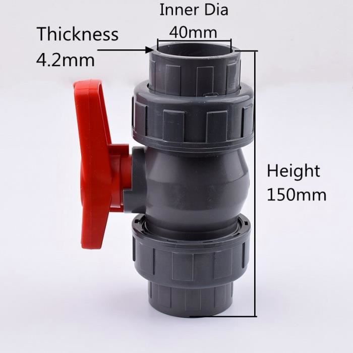 Robinet à Boisseau Sphérique Pvc Vanne Pvc à Boisseau Sphérique PN-10 50mm Robinet 1/4 De Tour Il peut résister à des conditions météorologiques difficiles et est adapté pour une utilisation à long terme. Plusieurs options de taille : disponible en différentes tailles, y compris 20 mm, 25 mm, 32 mm, 40 mm et 50 mm, ce robinet à boisseau sphérique offre une flexibilité pour répondre aux exigences spécifiques de plomberie La vanne à boisseau sphérique présente l’avantage d’être facile à utiliser, et préserve une étanchéité parfaite. Elle est disponible pour de nombreuses applications différentes, que ce soit en sanitaire ou chauffage Il fournit un joint fiable et étanche. Choisissez la taille adaptée à vos besoins. Raccord Pvc 40 A Visser Robinet à Boisseau Sphérique PVC PS10 à Matériau PVC : fabriqué en PVC, ce robinet à boisseau sphérique offre une excellente durabilité et résistance. Caractéristiques : *Les robinets à boisseau sphérique utilisent un disque sphérique pour contrôler le débit entre les tuyaux, les tubes ou les tuyaux. * Largement utilisé dans l'eau et les liquides. Douille coulissante : la vanne à boisseau sphérique en PVC dispose d'une douille coulissante pour une installation facile et une connexion sécurisée avec des tuyaux, des tubes ou des tuyaux. Contenu de l'emballage : 1 robinet à boisseau sphérique. Lorsque le trou de la boule s'aligne avec l'entrée et la sortie, le flux est autorisé, et lorsque la balle est pivotée à 90 degrés, le flux est bloqué. Débit contrôlé : avec un design à disque sphérique, cette vanne à boisseau sphérique contrôle efficacement le flux d'eau ou de liquide entre les tuyaux. * Le débit est autorisé lorsque le trou pénétrant dans la rondelle sphérique est en ligne avec l'entrée et la sortie de la vanne, et bloqué lorsque la bille est pivotée à 90 degrés horizontalement de sorte que le trou de la boule est perpendiculaire à l'orifice de la valve se trouve la valve.