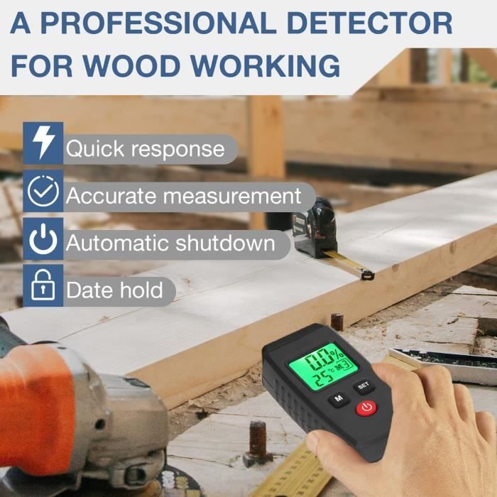 Plage de mesure : mur de plâtre : 0 ~ 25 % mur de briques : 0 ~ 43 % bois tendre : 0 ~ 75 % bois dur : 0 ~ 75 %. EN STOCK : Humidimètre pour bois WMT-10, détecteur d'humidité pour murs, humidimètre, humidimètre pour bois, prend en charge l'enregistrement et la journalisation des données, LinDuxe-K0263-250529030 pas cher. Livraison rapide partout en France * Affichage convivial : doté d'un écran couleur de 2,4, le WMT-10 fournit une interface lumineuse et facile à lire qui simplifie l'interprétation des résultats de mesure, améliorant l'expérience utilisateur pendant le fonctionnement. Système proactif : avec des alarmes sonores et visuelles intégrées, le WMT 10 avertit les utilisateurs lorsque les niveaux d'humidité ne sont pas sûrs, aidant à prévenir les dommages aux matériaux et à maintenir les conditions. Écran facile à lire : l'appareil dispose d'un écran couleur vive de 10,2 cm qui rend l'interprétation des mesures sans effort, améliorant la facilité d'utilisation pour les professionnels et les amateurs de bricolage. Contenu de l'emballage : * Testeur d'humidité [Applications] Avec une plage de mesure de 0 % à 75 %, cet outil est parfait pour évaluer l'humidité dans divers matériaux, y compris le bois tendre, le bois dur, le plâtre et les murs de briques, répondant à plusieurs besoins de projets. Cet outil avancé garantit une mesure précise de la teneur en humidité du bois, prenant en charge quatre modes de mesure distincts * Système d'alarme avancé : grâce aux alarmes sonores et de couleur intégrées, cet humidimètre avertit les utilisateurs lorsque les niveaux d'humidité dépassent les limites de sécurité, protégeant ainsi les matériaux contre les dommages potentiels et assurant des conditions optimales pour la préservation du bois. Humidimètre pour bois Humidimètre à Bois à Induction sans Broches Humidimètre WMT10 Bois Plâtre Humidimètre Détecteur à Induction Non Destructif Pour Matériaux En Bois Tendre Et En Bois Dur 96747380 Humidimètre Professionnel Alarme Mémoire Plage de mesure maximale : 0 ~ 75,0 %., Plage d'erreur : ± 0,5 %. Dimensions : 21,6 x 9,9 x 4,4 cm., Couleur : noir., Écran : 2,4. Profondeur maximale de détection : 17 mm. Taille du capteur : 40,5 x 40,5 mm. Température de fonctionnement : 0 ~ 40 ℃.