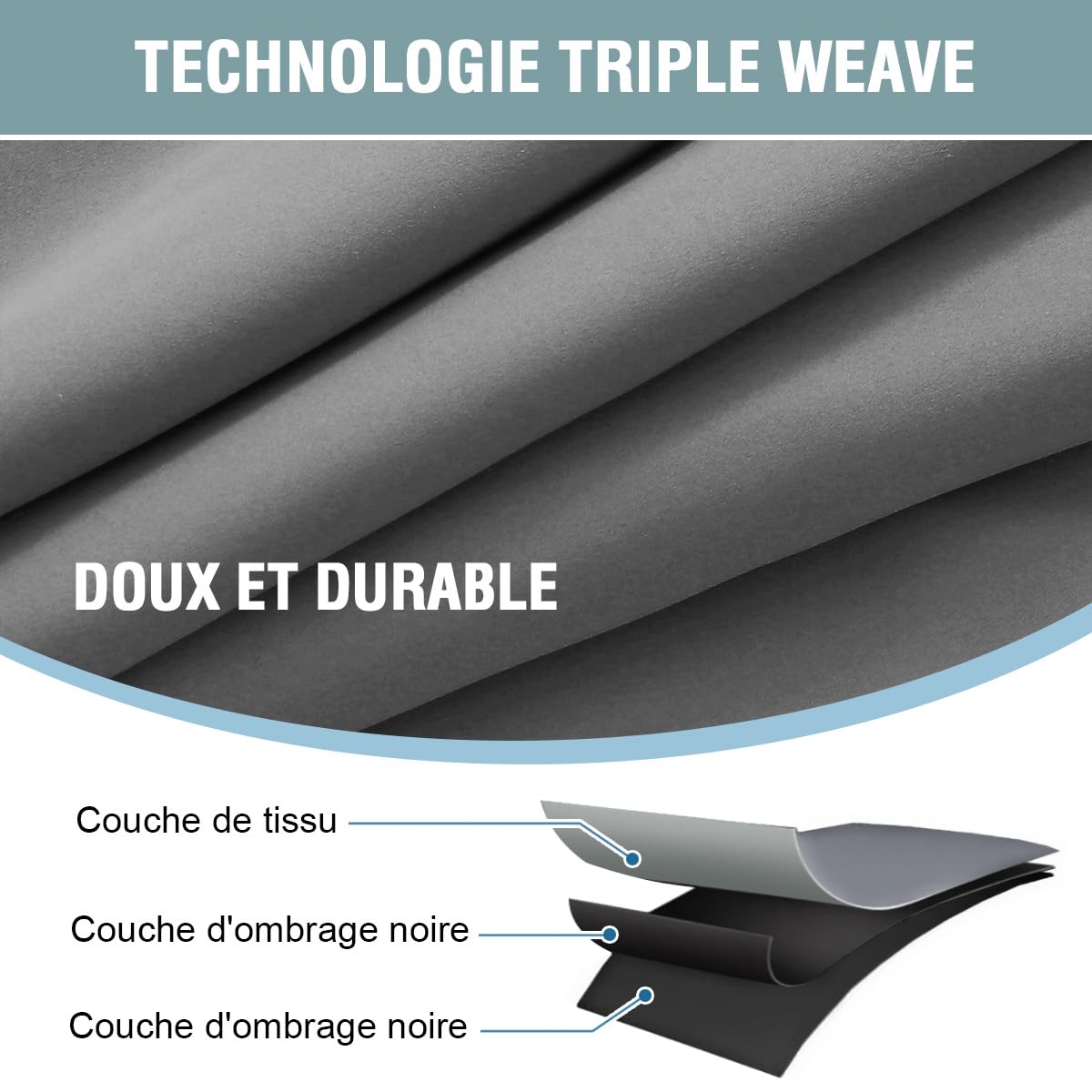 Rideaux Occultants 100% Lumière BellaHills 100% Rideaux Occultant 2 Panneaux Tenture,Double Rideaux Occultant Et Thermique,pour Maison Salon Et Chambre,140x245CM,Gris Clair Rideaux Thermiques Chaque panneau mesure : 117 x 137 cm, 132 x 214 cm, 132 x 240 cm, 140 x 145 cm, 140 x 175 cm, 140 x 225 cm, 140 x 240 cm, 140 x 260 cm. 100 % occultant et protection contre le bruit : les rideaux occultants BellaHills empêchent la chaleur de s'échapper et empêchent la lumière du soleil de... Économies d'énergie : Les rideaux occultants protègent de la chaleur estivale et du froid hivernal pour équilibrer la température ambiante, réduire les factures d'énergie et atténuer les bruits extérieurs Entretien facile : Lavable en machine pour un entretien facile. Deux panneaux par paquet, s'adaptent parfaitement aux tringles à rideaux standard ou décoratives. BellaHills Rideau Opaque Épais 100% Gris Clair Plissé, 140x240cm - Thermique et Anti-UV pour Appartement/Chambre, Dressing,2 Panneaux Paire vendue : Plusieurs tailles disponibles pour ces rideaux de salon. Ils offrent une occultation totale et bloquent la lumière du soleil et les rayons UV, créant un environnement sombre pour un sommeil de qualité. Économies d'énergie : Les rideaux occultants protègent de la chaleur estivale et du froid hivernal pour équilibrer la température ambiante, réduire les factures d'énergie et atténuer les bruits extérieurs. Installation polyvalente – Compatible avec les tiges, les rails, les crochets ou les broches, idéal pour différents styles de fenêtres et les rénovations de location. Nos rideaux sont certifiés GLOBAL RECYCLED STANDARD. Repasser à basse température si nécessaire. Ne pas blanchir ; utiliser uniquement de l'eau de Javel sans chlore si nécessaire. Grâce à ces rideaux, vous profitez d'un espace privé et d'une intimité optimale.