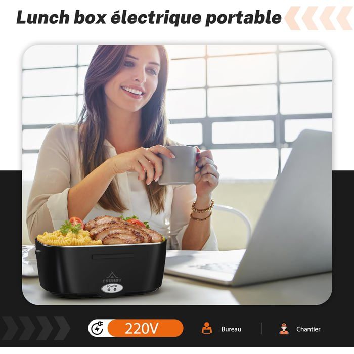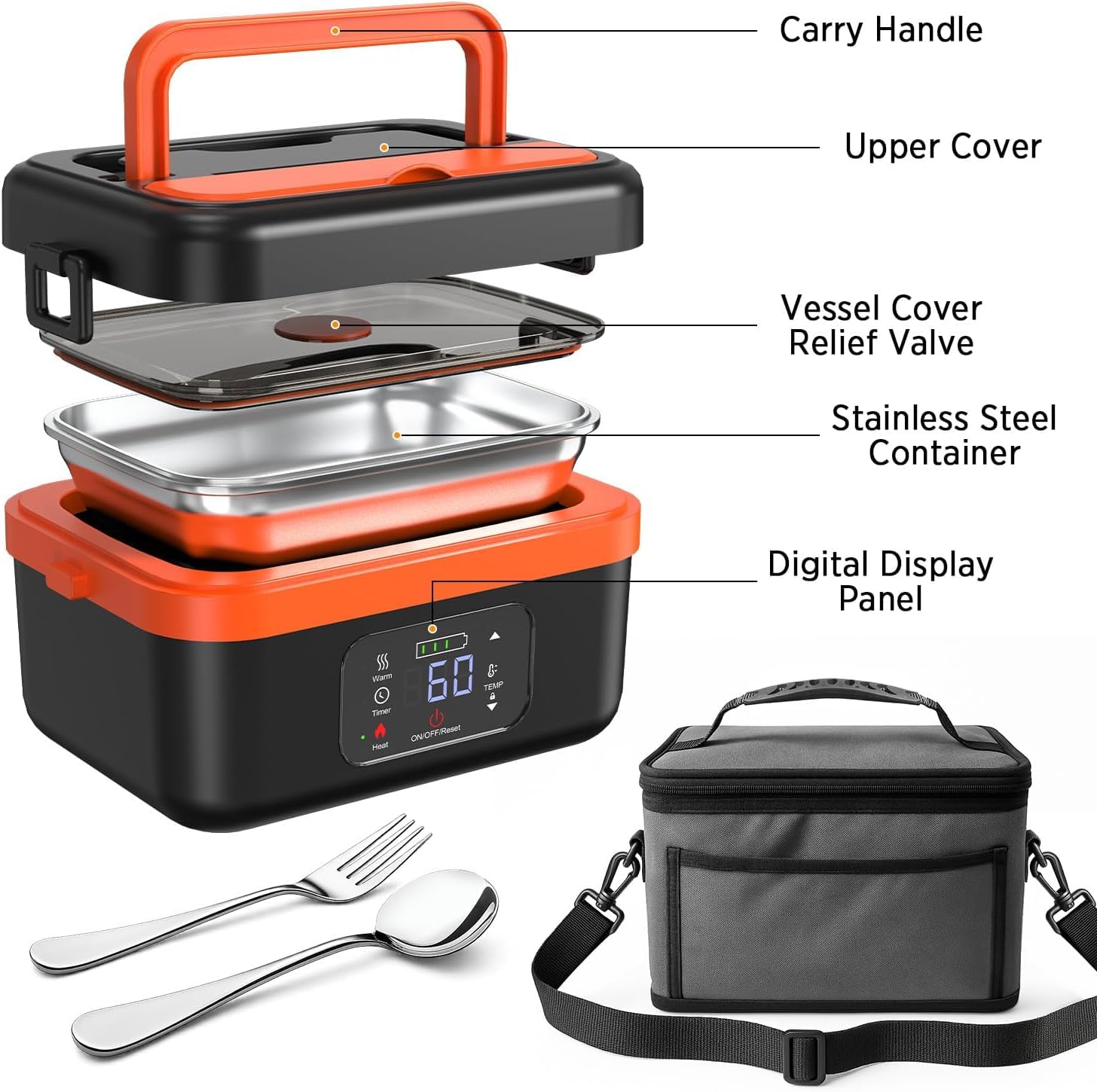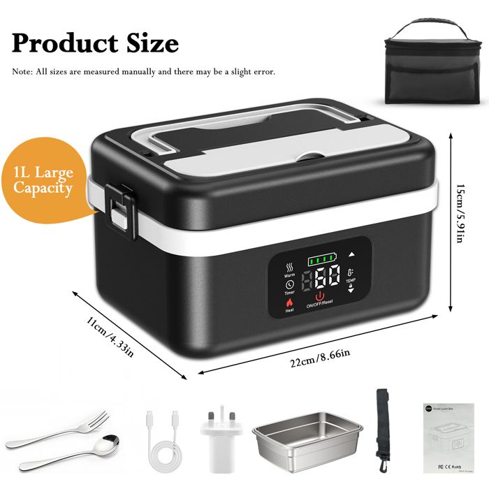 Gamelle Chauffante, Lunch box Chauffante avec Chauffage Programmable, 4*4000mAh Rechargeable Batterie, Minuterie, Boite Chauffante Repas à Séparateurs Amovibles, pour Voyage et Bureau Lunch Box Chauffante Batterie, pratique pour bébé, camping et navettes - qui a dit qu’un repas chaud devait attendre ? Petite capacité rime ici avec efficacité : portions pour enfant, collations, ou assiettes modestes pour adulte Une fois la cuisson terminée, la boîte à lunch passe automatiquement en mode maintien au chaud, économe en énergie, pour conserver vos aliments à la température idéale jusqu'à leur dégustation. Elle passe également au lave-vaisselle pour un nettoyage rapide et facile. Tous ceux qui souhaitent savourer un repas chaud fait maison sans micro-ondes ni prise électrique apprécieront ce cadeau pratique ! Gamelle Chauffante Batterie Lunch Box Chauffante Electrique, Boîte Chauffante Repas 24V 12V 220V 1 Gamelle Isotherme Chauffante Rechargeable USB Batterie grande capacité de 16 000 mAh : Cette boîte à lunch portable est équipée d'une puissante batterie rechargeable de 16 000 mAh offrant jusqu'à 70 minutes de chauffage après 4 heures de charge. Compacte et légère, grâce au sac isotherme inclus, elle permet de transporter facilement des repas chauds, avec élégance et praticité. Cadeau idéal pour les professionnels : Cette boîte à lunch chauffante est un cadeau idéal pour les routiers, les électriciens, les employés de bureau, les étudiants et les amateurs de plein air. Au travail, en déplacement ou à l'extérieur, ne craignez plus que vos aliments refroidissent. Lunch Box Chauffante Electrique Gaelle Chauffante 1.5 L Boîte Grande capacité de 1 L : Cette boîte à lunch chauffante de 1 litre est conçue pour satisfaire vos petites faims. Gamelle Chauffante 12V 24V 220V, Boîte À Lunch Chauffée 60W, Lunch Box...