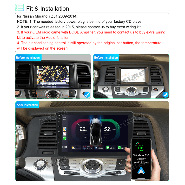 Connectez-vous au WiFi ou au point d'accès, utilisez des cartes en ligne et téléchargez des données cartographiques hors ligne, vous pouvez également télécharger les applications que vous souhaitez à partir du magasin. Android 14 Autoradio Sat Navi pour N-issan Murano Z51 (2008-2014) Lecteur multimédia à écran Tactile 9 Pouces avec sans Fil Carplay GPS Navigation FM RDS Bluetooth 5G-WiFi SWC DSP,M700s Contenu de l'emballageÉcran hôte×1Câbles et cadres nécessaires à l'installation×1La caméra de recul 4LED et l'outil de démontage (1 pièce) et le microphone externe sont nos cadeaux pour vous (affichage de l'image principale)Paramètres du produit :Système d'exploitation Android 14., 0Configuration :2G 32G / 2G 64G / 3G 32G / 4G 64G / 6G 128G / 8 128G / 8G 256GProcesseur : puce 8581/8 cœurs 4* A55 @ 1,6 GHz 4* A55 @ 1,2 GHz, puce 30240 DMIPS----7862/2* A75 @ 2,0 GHz 6* A55 @ 2,0 GHz, 54k DMIPSRadio stéréo à 8 cœurs Ventilateur de refroidissement intégréRésolution maximale : 1024 * 600 / 1280 * 720Écran : Écran multi-touch haute définition IPS / QLEDRéseau d'écran : 5GWIFI/ USB/ HotspotFormat de support numérique : Mp3/Mp4/WMA/JPEGCaractéristiques du produit : Carplay sans fil/Android Auto/Bluetooth 5., 0 (musique et mains libres) 5GWiFi/4G/vidéo 1080P/USB/écran tactile extra large/image dans l'image/multilingue/écran partagé/commande au volant/connexion miroir/DVR/RDS/DSPAccessoires de support : TMPS / DAB / OBD / DVR etc. * Expérience visuelle et auditive incroyable : L'écran tactile capacitif IPS / QLED haute définition 1024 * 600 / 1280 * 720 peut vous donner un excellent plaisir visuel. Caméra de recul/MIC/outil de démontage (1 pièce) (cadeau). Le tuner FM/AM fournit également de nombreux contenus créatifs et diversifiés pour répondre à vos préférences d'écoute. * 2025 Dernière version Android 14 Autoradio : Double Din Autoradio Stéréo pour N-issan Murano Z51 (2008-2014) Remarque : Veuillez vous assurer que vous avez la bonne lunette de cadre de radio et l'adaptateur de prise de câble de voiture d'origine avant d'acheter. 4+64G] 9 Android 14 Autoradio de voiture pour Nissan Murano Z51 2008 * Navigation GPS et point d'accès WiFi : autoradio Stéréo avec carte hors ligne installée, vous pouvez utiliser la navigation hors ligne. Rappel chaleureux : l'installation d'un équipement nécessite certaines compétences et connaissances. Avec la commande vocale S-iri, vous pouvez contrôler l'appareil d'un mot ou d'un toucher, très pratique. 12.1 Qualcomm pour Infiniti EX30 2008-2017 Autoradio Stéréo Carplay Mise à Niveau Écran Style... Autoradio 9 Pouces Murano Z51 Pour Nissan Murano Z51 2008-2014 Autoradio Lecteur Multimédia écran 9 Pouces Murano 2008-2014 Si vous n'êtes pas sûr qu'il convienne, vous pouvez d'abord envoyer la photo de la console centrale de la voiture par e-mail au vendeur, qui vous fournira un service en ligne 24 heures sur 24., *Prend en charge CarPlay sans fil et CarPlay filaire : la façon la plus intelligente, la plus sûre et la plus amusante d'utiliser votre i-Phone dans la voiture.