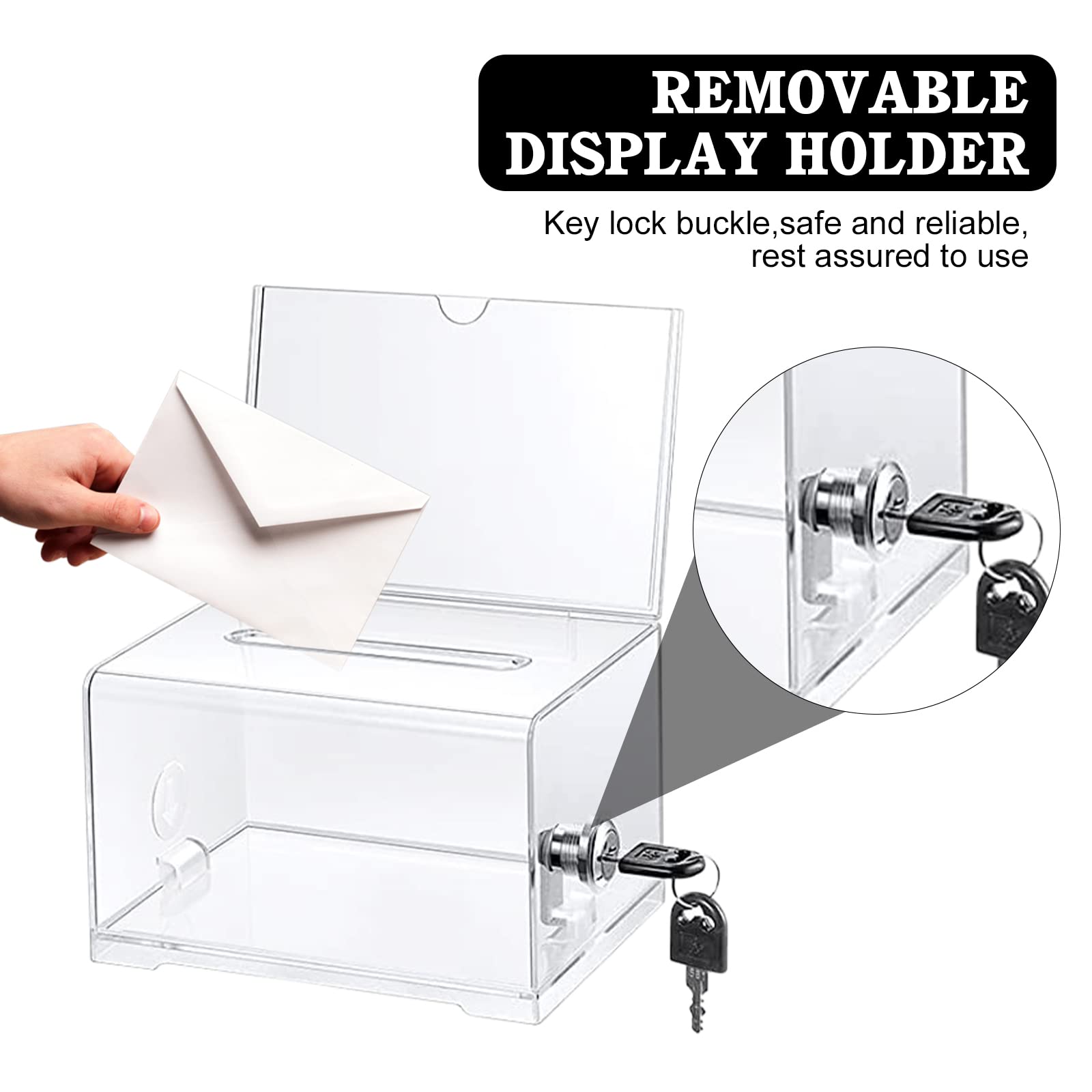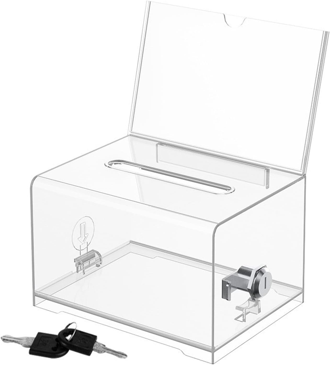 Boite à Clé Sécurisée,Key Lock Box,Coffre Fort à Clés Boîte Urne Transparente Acrylique Avec Serrure Lntyq 4PCS Poignées De Fenêtre Verrouillable à Clé En Aluminium Blanc Boîte Transparente 15.7x11.5x10.2cm Polyvalent : non seulement adapté pour les dons, mais aussi pour collecter des cartes de visite, des billets pour des enquêtes, des concours ou d'autres événements. Caractéristiques du produit : ● Couleur : noir. Porter une clé: il est équipé d'une serrure et d'une conception de clé pour assurer la sécurité des objets dans la boîte de donation. Acrylique, Boîte à Dons, Caisse à Monnaie Verrouillable Pour Cartes De Visite Pour Votes, Jeux Au Sort, Compétitions Base stable : le fond est conçu pour empêcher la boîte de vaciller ou de basculer pendant l'utilisation et augmenter la stabilité. La Boîte à Dons En Acrylique Peut être Personnalisée Pour Une Variété D'événements Différents, De Sorte Que Vous Pouvez Facilement Saisir Le Thème Des... Facile à nettoyer et à entretenir : la surface est lisse et sans couture, ce qui la rend facile à nettoyer. ● Matériau : acrylique ● Poids du colis : 385 g ● Dimensions du produit : 15,7 × 11,5 x 10,2 cm ● Dimensions de l'emballage : 18 × 13 × 11,8 cm Contenu de la livraison : 1 boîte en acrylique., Remarque : 1., En raison des effets de l'éclairage pendant la prise de vue et des différents réglages du moniteur, les couleurs du produit sur l'image peuvent différer légèrement de la couleur du produit livré., 2., En raison de la mesure manuelle, il peut y avoir une erreur de 1 à 2 mm.