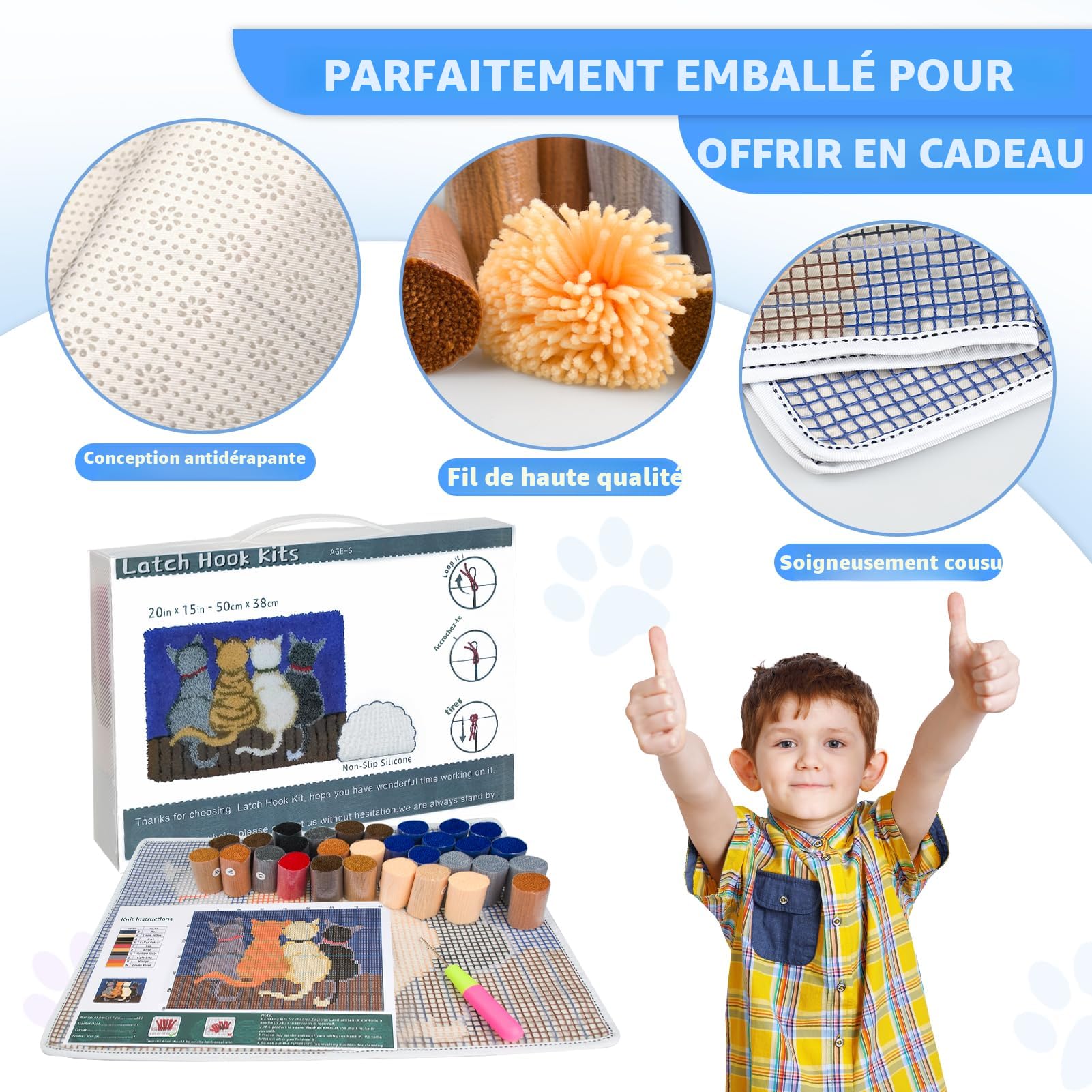 En seulement 3 étapes (boucle,crochet et traction),créez le tapis à motifs. Apportez créativité et personnalisation à votre décoration intérieure avec ce kit de tapis à crocheter DIY pour adultes UN NOUVEAU LOISIR VOUS ATTEND ! Ce bricolage amusant de broderie est polyvalent. Le tapis à crochet à loquet DIY peut être un cadeau d'anniversaire ou de Noël ou d'Halloween pour les enfants,un cadeau pour les parents,un cadeau pour les amis et un cadeau pour les couples. 【Super cadeau】 Créez vos propres cadeaux pour exprimer vos bénédictions sincères ! Contenu : 1 tapis à broder 1 crochet 1 instructions de fabrication en anglais 1 fils prédécoupés de différentes couleurs en quantité suffisante Comment commencer mes premiers kits de tapis à crocheter ? 1., Insérer le crochet dans la grille., 2., Pliez le fil à broder en deux et crochetez-le avec une aiguille à crochet., 3., Sortez le fil à broder de la grille horizontale., Grille 4., Le crochet accroche le fil à broder., 5., Tirez le fil à broder sur la grille et faites-le sortir de la boucle., 6., Disposez et serrez le fil à broder., Attention : 1., Ce kit d'accessoires pour crochet à loquet est un produit non fini,vous devez le terminer vous-même., 2., Veuillez prévoir une légère marge d'erreur de taille en raison des mesures manuelles., 3., Toute variation de couleur ou de détail est due à la fabrication artisanale de cet article. Kit de tapis à crochet - France 【Toile pré-imprimée】Ce kit de tapis à crocheter est imprimé avec un motif en couleur précis et des instructions faciles à suivre,ce qui rend le travail au crochet très facile et amusant pour les enfants,les adultes et les débutants. Apportez créativité et personnalisation à votre décoration intérieure avec ce kit de tapis à crocheter DIY pour adultes. Dimensions : 52x38cm/20x15in. Avec une toile pré-imprimée, des instructions (français non garanti), du fil et un crochet, vous pouvez commencer immédiatement. Nous vous avons équipé de 3 crochets à poignée en bois de haute qualité, afin que vous puissiez profiter du plaisir de l'artisanat avec votre famille Tapis Loquet DIY Motif Hiboux Kit Tapis à Crochet à Loquet, Latch Hook Mat Kit (Neuf Avec Emballage D Loisir Créatif Adulte 【Kits de tapis à crocheter】Nos kits de tapis à crocheter contiennent tous les outils nécessaires à la création de tapis.