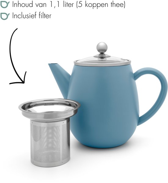 Attention : veuillez noter que le vernis peut endommager en cas d'utilisation intensive. Pour préserver la beauté et la fonctionnalité de votre théière, voici quelques conseils utiles : - Évitez le lave-vaisselle, mais rincez à l'eau tiède après utilisation - Séchez doucement avec un chiffon doux. - Séchez doucement : utilisez un chiffon doux pour sécher l'extérieur de la théière et éviter les rayures. Notre produit Duet® Eva Bleu glacier - Théière 1.1 L Bredemeijer est à seulement 63,90 € (livraison offerte). Découvrez entièrement notre catégorie Théières... Filtre à thé amovible en acier inoxydable inclus - Convient pour le thé en vrac et les herbes fraîches. Astuce pour régler le couvercle Le couvercle est-il un peu trop serré ou trop lâche ? Ne vous inquiétez pas. Attention : votre théière Bredemeijer est conçue avec un souci du détail et de l'artisanat, et la magnifique couche de vernis ajoute à son aspect élégant. Bredemeijer Théière Riga simple paroi avec filtre 0,8 L L'Eva est fabriqué à partir de matériaux durables de haute qualité qui dureront des années. En outre, il est facile à nettoyer et passe au lave-vaisselle. Le bouton et la poignée chauffent au maximum à la main. Effet optimal avec un minimum de 90 % de remplissage. Taille compacte de 0,5 l - Convient pour 2 à 3 tasses de thé. Veuillez noter que la couche de peinture peut endommager. Grâce au bec spécialement formé, vous pouvez verser sans effort, sans gouttes. Ustensile de cuisine GENERIQUE Bredemeijer 1464 solo verona théière Le filtre est à mailles fines, donc pas de résidus de thé dans votre tasse. Elle fait partie de la gamme Duet Classic – appréciée pour son design intemporel et sa fonctionnalité bien pensée. Design minimaliste avec un look intemporel - Fait partie de la gamme Duet Classic - Esthétiquement sobre et durable. Construction à double paroi - Garde le thé au chaud jusqu'à 60 minutes, ce qui garantit que le goût du thé est préservé. Théière Isotherme Avec Filtre Inox Théiere Duet Eva 0,5L Brillant Théière Pour Thé En Vrac Filtre Inox - Mettez le couvercle un peu moins serré: Cela empêche le couvercle de frotter sur les bords et d'endommager la couche de peinture. Filtre à thé amovible en acier inoxydable inclus Convient pour le thé en vrac et les herbes fraîches. La théière verse en douceur et contrôlée.