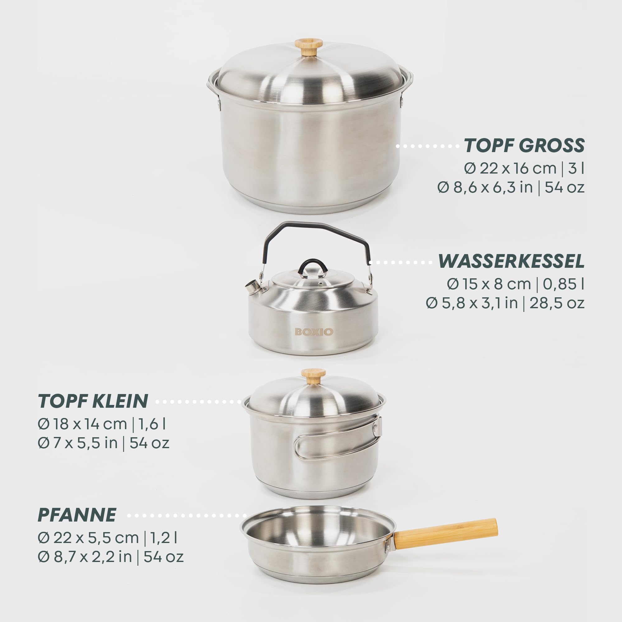 Vaisselle de Caping 4 Pièces Enseble de Batterie de Cuisine de équipement Camping Induction BOXIO - Cookware : Poêle De Camping Et Casseroles En Acier Assiettes Camping Avec nos accessoires de camping, vous obtenez chez BOXIO tout pour la vaisselle de camping : assiette, couverts, gobelets, bol, réchaud à gaz et bien sûr l'ensemble de casseroles assortis – parfaitement assortis La poêle, les casseroles et la bouilloire peuvent être empilées et donc rangées pour économiser de l'espace. Inclus : poêle Ø 22 cm (1,2 l), grande casserole Ø 22 cm (3 l), petite casserole Ø 18 cm (1,6 L), bouilloire Ø 14,5 cm (0,8 l), protège-feutre et aimants – Votre batterie de cuisine de camping complète en acier inoxydable pour les déplacements Le BOXIO Cookware est un set de casseroles en acier inoxydable qui s'intègre parfaitement dans l'espace de rangement du BOXIO Cook. La poêle, les casseroles et la bouilloire peuvent être empilées et donc rangées pour économiser de l'espace Le set de cuisine de camping est empilable de manière compacte, conserve ainsi la chaleur et s'intègre parfaitement dans le BOXIO Cook. Le pack COOK MAX est le set de cuisine ultime pour les déplacements. Le pack combine un réchaud à gaz puissant avec un set de cuisine de 4 pièces, de la vaisselle et des couverts pour 4 personnes Tous les éléments en acier inoxydable passent au lave-vaisselle et peuvent être facilement nettoyés même en déplacement – vous obtenez ainsi vos gadgets de camping propres sans grand effort Le compagnon idéal pour les aventures en plein air, Vanlife et le camping.