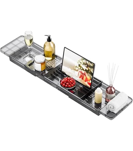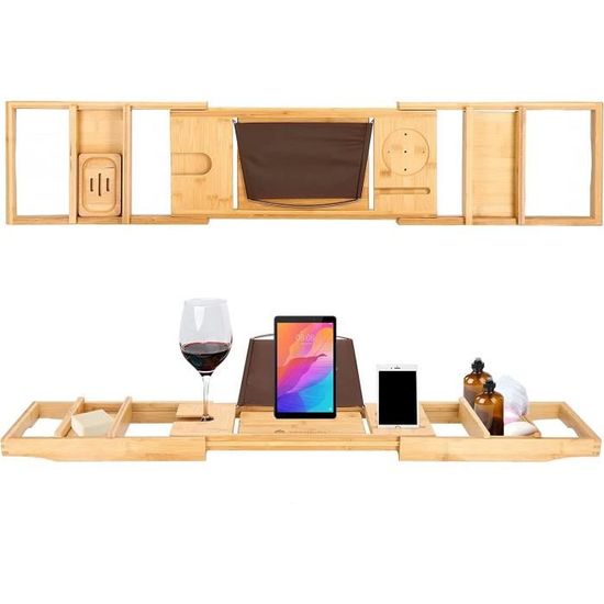 Style Simple : Cette étagère de salle de bains a une apparence simple et généreuse, un schéma de couleurs classique, qui peut rehausser la beauté générale de la salle de bains lorsqu'elle est utilisée, et convient aux styles d'habitation modernes Liberté D'expansion et de Contraction : La longueur du support peut être réglée librement, la plage de réglage est de 56 à 80 cm, ce qui permet de s'adapter facilement aux différentes tailles de baignoires ou de douches, et d'éviter ainsi les problèmes liés à l'incohérence des tailles Stockage Efficace : La surface spacieuse de l'étagère permet de ranger facilement le gel douche, le shampoing, le nettoyant pour le visage, le savon, les téléphones portables, les tablettes, les livres, les bougies d'aromathérapie, etc Plateau Baignoire Extensible 56-80 Cm Plateau De Baignoire Plateau De Baignoire En Bois De Bambou Plateau De Tablette Baignoire Ajustable Livre Téléphone Plateau de baignoire en bambou de luxe - Plateau de bain extensible et antidérapant avec livre/tablette et porte-verre à vin - Excellente idée cadeau pour les EXTENSIBLE ET FLEXIBLE] Ce pont de baignoire est extensible et peut être ajusté de 70 à 95,6 cm pour s'adapter parfaitement à différentes tailles de baignoires Plateau de caddie de bain en bois extensible, plan... - Grandado