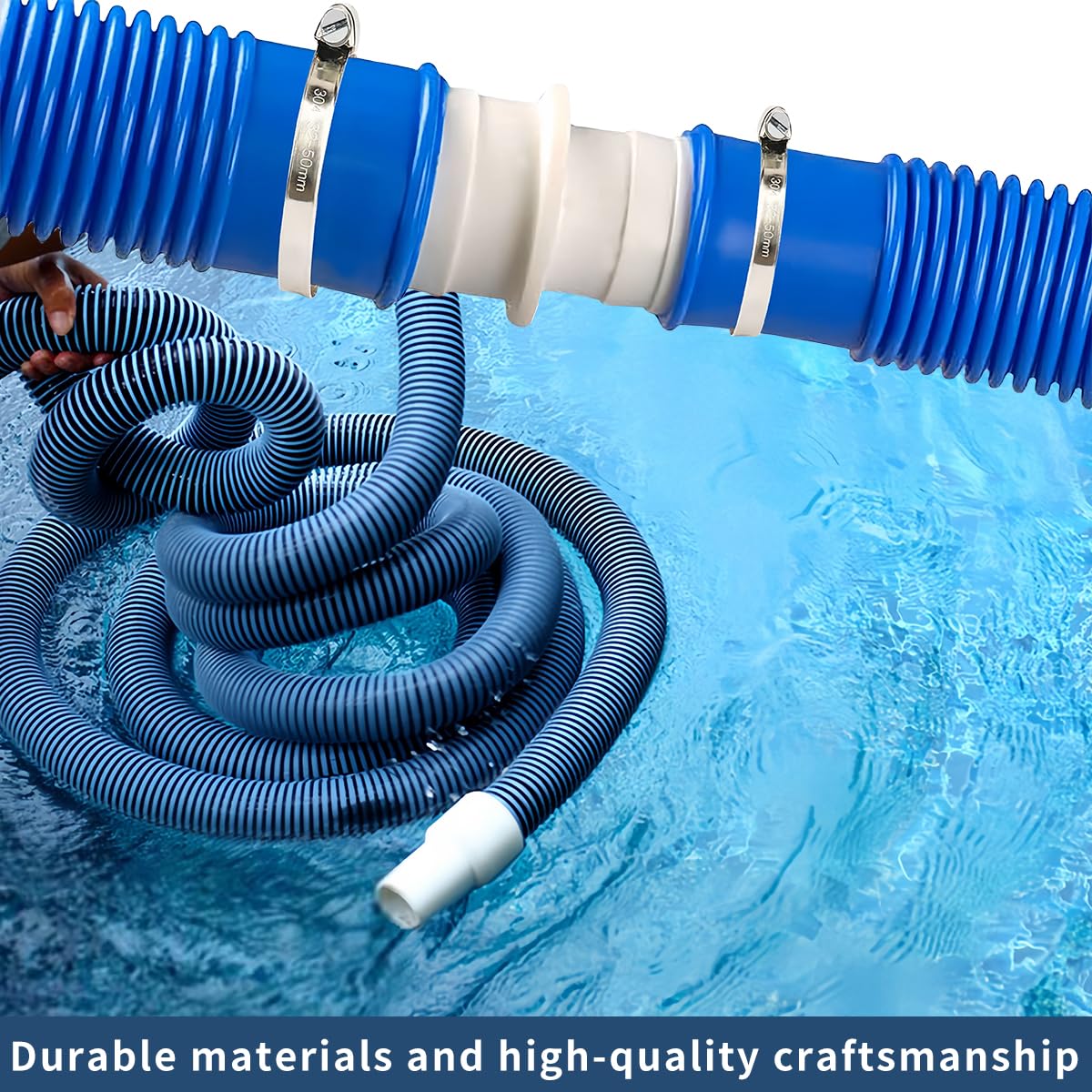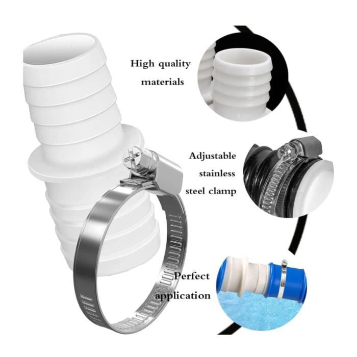 Avez-vous une nouvelle pompe ou un nouvel aspirateur de piscine avec différentes tailles de raccordement ? Ce raccord de tuyau est la solution idéale et économique pour connecter des tuyaux d'un diamètre extérieur de 32 mm et 38 mm, sans avoir à acheter un nouveau tuyau coûteux pour créer une connexion sûre et étanche. Raccords de tuyau de piscine en plastique durable avec colliers de serrage en acier inoxydable. Connectez et rallongez les segments de tuyau Spécifications: - Kit complet pour une utilisation sans souci : ce kit de raccordement de piscine contient tout ce dont vous avez besoin pour une connexion stable de la piscine. 8 colliers de serrage en acier inoxydable. Utilisation polyvalente : l'adaptateur de tuyau de piscine est idéal pour connecter et rallonger les tuyaux pour pompes de filtrage, aspirateurs de piscine, pompes submersibles, oasis, aquariums et autres appareils et peut être utilisé aussi bien à l'intérieur qu'à l'extérieur. Kit Raccordement Pompe Filtre Piscine LOT De 2 Raccords/adaptateurs Pour Tuyau Poolomio® Avec Colliers De Serrage En Acier Inoxydable - Convient Aux Tuyaux De Piscine ?32 Et 38 Mm Connexion étanche Haute Pression Vous n'avez pas besoin d'acheter des pièces supplémentaires et vous pouvez commencer l'installation immédiatement. Matériaux durables : l'adaptateur est fabriqué en plastique robuste, les pinces sont en acier inoxydable de haute qualité, de sorte qu'elles peuvent être utilisées pendant une longue période même sous charge continue et dans des environnements chimiques. 【Installation facile】 Il suffit de brancher le tuyau et de le fixer avec les pinces fournies - L'installation est pratique et rapide et l'appareil est prêt à l'emploi. Dimensions : Convient aux tuyaux de diamètre extérieur : 32 mm, 38 mm., Conversion : 32 mm à 38 mm. Kit adaptateur de tuyau de piscine - SSS - 2PCS - Blanc - Colliers de Contenu de l'emballage : 4 raccords de tuyau. 9 mètres Tuyau Piscine 32 mm Bleu PVC Souple. Qualité