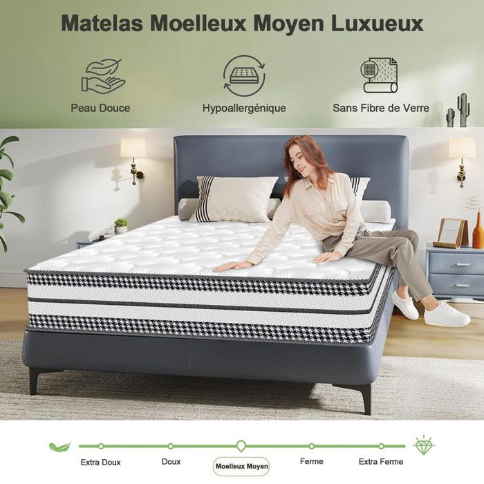 Il est fabriqué en mousse HR durable. Novilla Matelas 90x200, 20 cm, Memoire de Forme, Mousse en Fibre de Bambou, Réversible à Deux Faces Utilisables, Sommeil ais, Certifié Oeko-TEX, Excellent Confort et Respirable La surface ondulée et les millions de bulles de mousse assurent une meilleure adaptation au corps. Possibilité de changer de côté selon les préférences et le poids de l'utilisateur. La structure du tissu assure une ventilation et une circulation d'air optimales à l'intérieur du matelas. Matelas Roulé Livraison Facile FDM HOME MAX Matelas 90x200 Cm Épaisseur 24 Cm Matelas à Ressorts Ensachés Fermeté H3 H4 Deux Faces 7 Zones De Confort Couche De Coco Housse Lavable OEKO-TEX Hypoallergénique Matelas Confort Ergonomique Livré Roulé Qualité testée pour les substances nocives selon la norme Oeko-Tex Standard 100., Confort supérieur grâce à une mousse profilée HR (haute résilience) et une mousse thermoplastique Visco à mémoire de forme. Housse en jersey – Cette housse de matelas matelassée est fabriquée à partir de matériaux hypoallergéniques de première qualité. Elle contribue à prolonger la durée de vie de votre matelas, offrant une douceur, une fraîcheur et un confort exceptionnels. 7 zones de confort - Grâce à ses 7 zones de confort, le matelas épouse parfaitement les formes de votre corps et offre un excellent soutien de la colonne vertébrale. Matelas PREMIUM 90X200, Viscoélastique, Fermeté Haute, Confort Maximum Hauteur 32 Cm Phantasus 93880434 La haute résilience et l'élasticité de la mousse HR haute résilience garantissent une reprise rapide de la forme initiale et une grande durabilité. A retenir : Matelas à ressorts ensachés 7 zones Mousse Mémoire Forme · Dimensions du couchage : 90 x 200 cm · Type de matelas : Ressort · Epaisseur du matelas...