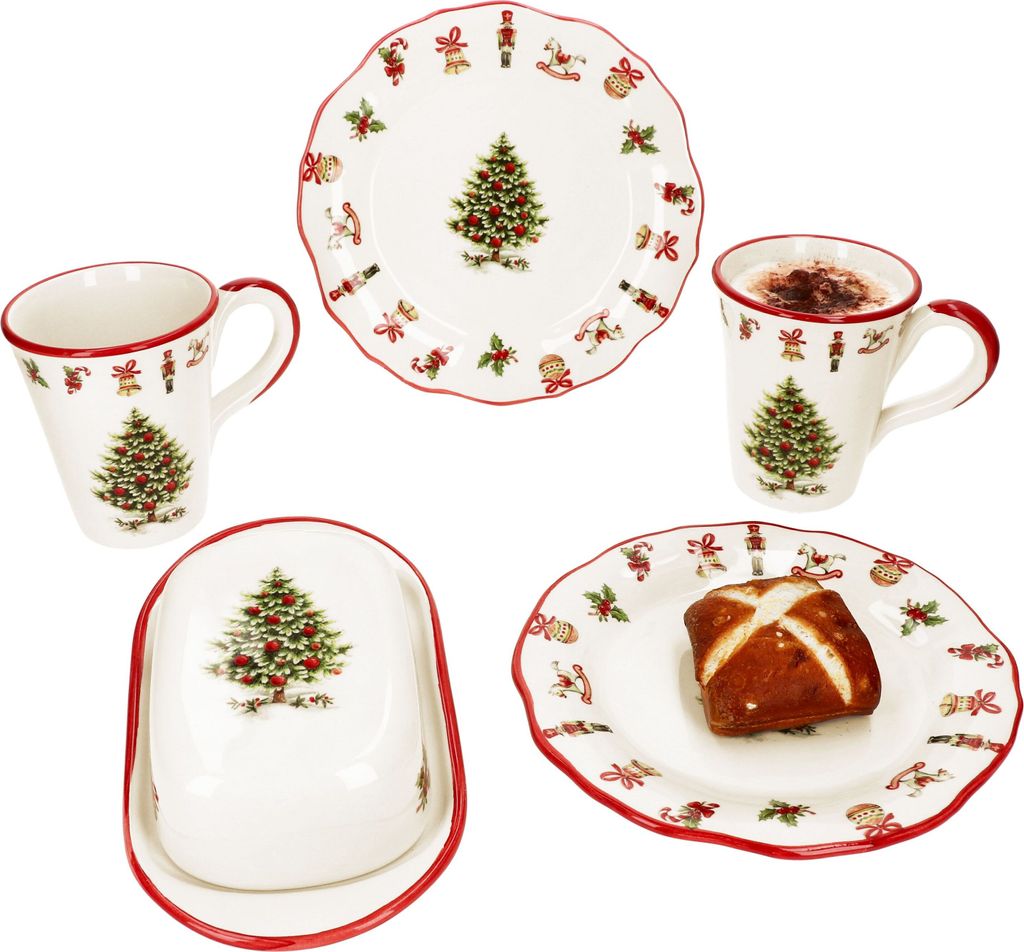De plus, toutes les pièces du kit passent au lave-vaisselle et au micro-ondes. Le matin, servez du pain, des petits pains ou des croissants à une personne spéciale dans l'assiette décorée, placez le beurre dans la jolie boîte et profitez de cette jolie tasse de thé, cacao, café, cappuccino ou latte macchiato. Toutes les pièces sont ornées d'un sapin décoré de boules rouges. Le service est idéal pour 2 personnes lors des fêtes et fabriqué en céramique de qualité supérieure. Le large bord de l'assiette a une forme ondulée. Service à café - MAMBOCAT - Noël - 18 pièces - 6 tasses - Faïence 2 assiettes à petit-déjeuner | Chacune : diamètre 21,5 cm, miroir Ø 13,5 cm, hauteur 2,3 cm, 370 g. MamboCat Set de petit-déjeuner 5 pièces Maestro Natale - 1 beurrier, 2 tasses à café de 340 ml et 2 assiettes à petit-déjeuner pour Noël, la Saint-Nicolas ou l'Avent 8PCS Assiettes Plates,Assiettes à Salade,Assiettes à Dessert, Assiettes... Vaisselle De Noel MamboCat Maestro Natale Service à Repas 5 Pièces I Vaisselle Vaisselle Noël Crème Rouge Motifs Festifs La vaisselle italienne est fabriquée en céramique fine et est donc très robuste, durable et convainc par ses exigences de qualité élevées. Utilisez les gobelets en un tour de main confortable à deux, par exemple par exemple pour les boissons hivernales telles que le vin chaud, le punch aux œufs ou les pinces à feu. Service petit-déjeuner de Noël Maestro Natale 5 pièces pour 2 personnes avec beurrier en céramique - 1x 15/19, 2x 32/12 et 2x 965/21. Marque: MamboCat L'ensemble est dans un ton de base de couleur crème. Contenu de l'emballage : 1 x beurrier | Total : longueur 21,5 cm, largeur 12,8 cm, hauteur 6,2 cm, 570 g Profitez de cet ensemble de petit-déjeuner harmonieux Maestro Natale de 5 pièces et apportez une ambiance festive à votre table. Dimensions de chaque boîte : longueur 21,5 cm, largeur 12,8 cm, hauteur 6,2 cm | (assiette) Ø 21,5 cm, hauteur 2,3 cm | (tasse) Ø 10 cm, longueur avec anse 14 cm, hauteur 12 cm | Passe au lave-vaisselle et au micro-ondes