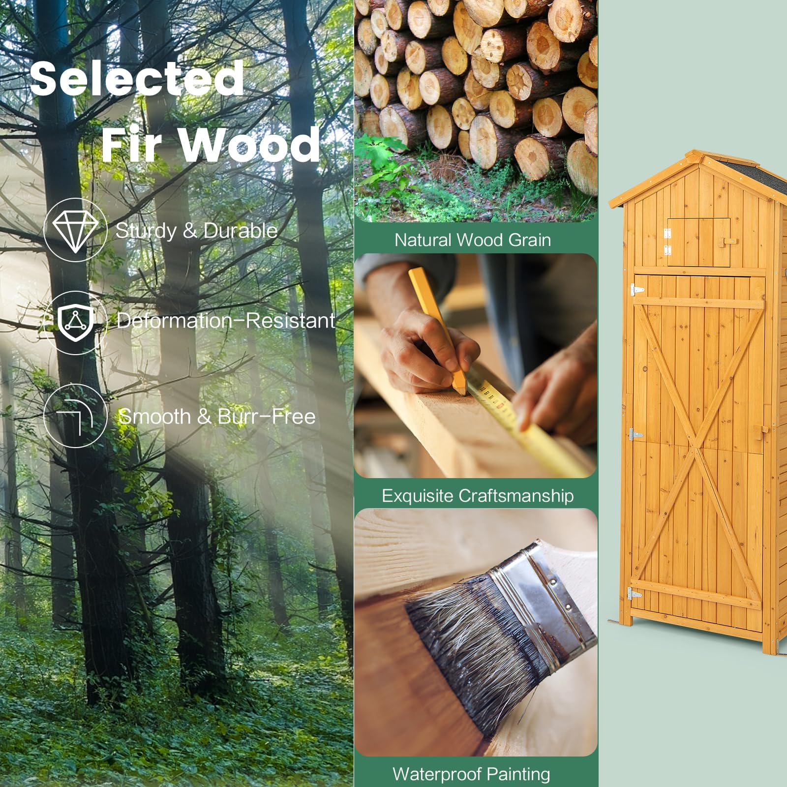 GRAND ESPACE DE RANGEMENT : Cette boîte à outils de jardin dispose d'une grande capacité de rangement pour toutes sortes d'outils et d'équipements afin de garder votre jardin bien rangé et organisé. Pour ranger tous tes outils de jardin, cette armoire HOMASIS en sapin massif est idéale ! Dimensions 87x47x160cm, avec 2 étagères amovibles et réglables pour t'organiser comme tu veux Cet abri pour outils de jardin offre un vaste espace de rangement. SERRURE DE PORTE DE SÉCURITÉ : La cabane à outils est équipée d'une serrure de porte robuste qui permet de garder les objets stockés en sécurité et d'empêcher l'intrusion de petits animaux. La conception des pieds à haut support empêche les objets de se mouiller. Le cadre en bois est stable et fiable, et est finement traité pour assurer une surface lisse et sans bavures pour faciliter le nettoyage et l'entretien. Toit incliné imperméable : équipé d'un toit incliné imperméable en asphalte, il empêche efficacement l'eau de pluie de s'infiltrer et convient à une utilisation en extérieur. Armoire de jardin en bois, abri de jardin résistant aux intempéries... Que vous soyez un jardinier amateur ou professionnel, cette boîte à outils est un compagnon essentiel pour votre jardin. Abri De Jardin Bois TRIGANO 4 M² Avec Porte Simple Et Panneaux Robustes Pour Prot Ger Et Organiser Votre Mat Riel Ext Rieur Toit Incliné Imperméable Abri De Jardin En Bois Robuste Avec étagères Et Toit étanche Bleu Cabane Rangement Jardin CONSTRUCTION EN BOIS SOLIDE : Cet abri de jardin est fabriqué en bois massif de haute qualité, robuste et durable. Elle vous permettra de ranger et d'organiser votre jardin tout en l'embellissant et en le rendant plus pratique. Construction en bois massif de haute qualité, solide et durable. Conception étanche, toit incliné pour un drainage rapide, empêchant l'accumulation d'eau. Verrous de porte sécurisés pour un rangement sûr des outils Design élégant, s'intègre à l'environnement extérieur, beau et pratique à la fois Grande capacité de stockage, répond aux besoins de divers outils, propre et bien rangé Facile à ouvrir et à fermer, la poignée en métal est plus pratique à utiliser Spécifications : Couleur : naturel Matériau : bois d'épicéa, asphalte, métal Dimensions : 140 x 50 x 162 cm (L x l x h x h) Capacité de charge de chaque étagère : 20 kg Capacité de charge de l'étagère inférieure : 60 kg Poids net : 31 kg Pièces détachées : 1 x Abri pour outils de jardin 1 x Instruction