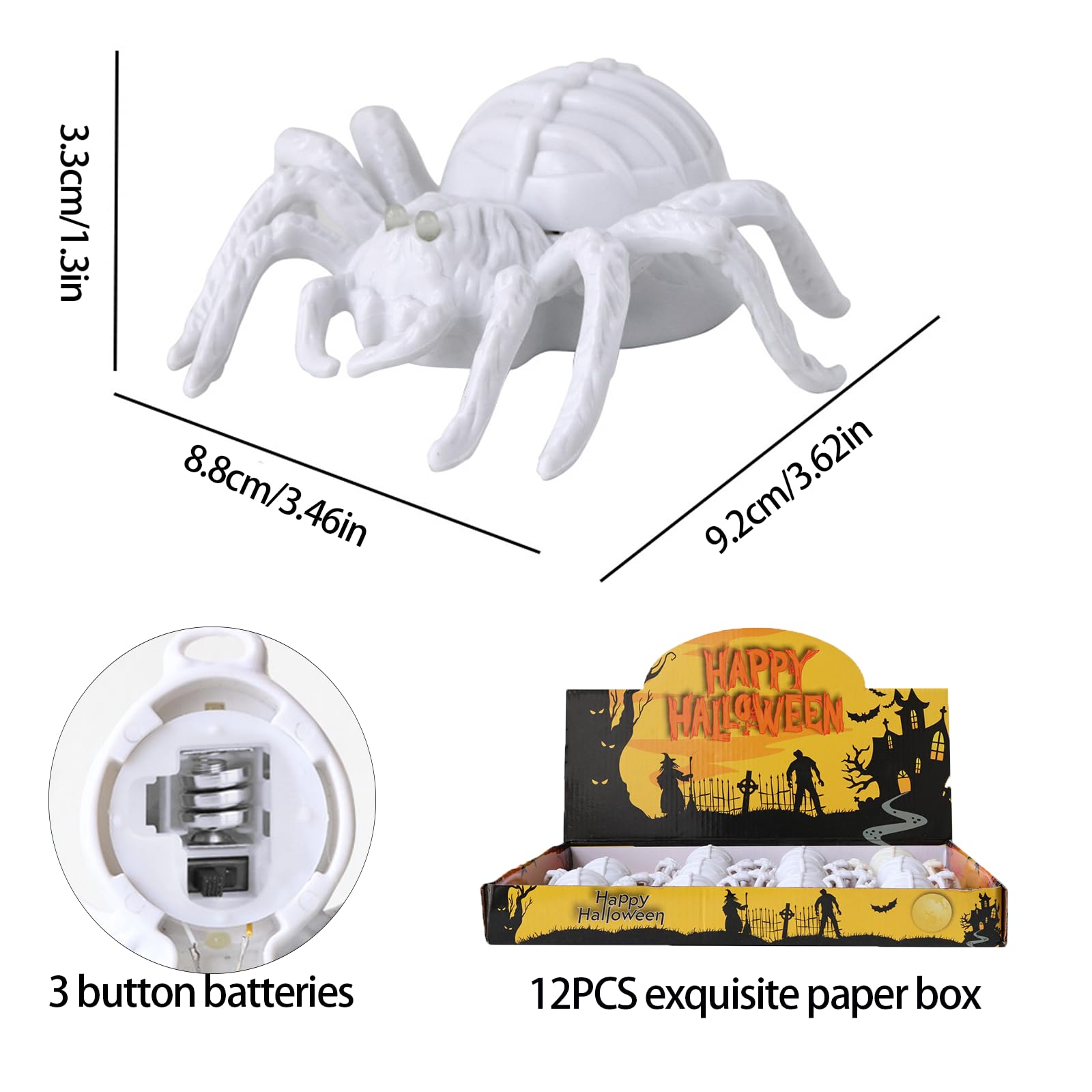 🕷️Matériaux De Haute Qualité : ces lanternes araignées d'halloween sont fabriquées en plastique de haute qualité avec une surface lisse et des motifs d'araignées clairs. Petits prix et livraison gratuite dès 25 euros d'achat sur les produits JINGTOPS. Commandez 12 Pièces Araignée Lumineuse Halloween Decoration Interieur Exterieur,Araignee Lanterne Déco Halloween Extérieur Alimenté Batterie,Araignée Bougie Chauffe Plat LED Deco Table Jardin Description du produit Nom du produit : Bougies araignées Halloween, Lanternes citrouille Halloween Ces lanternes araignées d'Halloween émettent deux couleurs de lumière. ces guirlandes lumineuses réalistes en forme d'araignée brillent dans le noir et s'harmonisent parfaitement avec les toiles d'araignée et autres décorations d'halloween pour votre maison hantée ou votre fête. elles constituent également un excellent cadeau d'halloween pour les enfants ou les amis. 🕷️Nombreuses Utilisations : ces bougies chauffe-plat en forme d'araignée sont idéales pour décorer une fête d'halloween, mais aussi pour décorer une table de chevet, une table, une fenêtre, une chambre, une cheminée ou un jardin. 🕷️Lanterne Araignée Halloween : ce lot comprend 12 lanternes araignées réalistes, chacune avec des lumières bicolores. Bougeoir en forme d'araignée | Bougies chauffe-plat scintillantes d' Halloween à piles, bougeoir LED effrayant pour table de fête d'Halloween, décoration d'intérieur effrayante 🕷️Bougies Led Halloween Faciles à Utiliser : les bougies led araignées fonctionnent avec des piles bouton et ne nécessitent pas de flamme nue. Couleur : Blanc Matériau : Plastique de haute qualité Dimensions : 9,2 x 8,8 x 3,3 cm Contenu : 12 x bougies chauffe-plat araignées d'Halloween Alimentation : Piles bouton (incluses) Utilisation : Nuit d'Halloween, défilés de lanternes, fêtes d'Halloween, décorations de table d'Halloween Décorations intérieures et extérieures idéales pour les fêtes d'Halloween, les maisons hantées d'Halloween, les fêtes de la Toussaint, les raves ou toute autre occasion parfaites pour les décorations d'halloween, à l'intérieur comme à l'extérieur, ou lors de fêtes, pour épater vos amis. Lanterne du Père Noël 1 pièce, lanterne de Noël avec bougie LED, adaptée à la décoration de la maison de Noël, lumière chaude (piles incluses Déco Maison Hantée Jardin Fête Halloween Toile D'araignée Lumineuse Pour Halloween - 250 LED - Décoration D'halloween D'extérieur Avec Grande Araignée Bougie Araignée à Piles Effet Lumineux elles émettent une lumière effrayante et inquiétante dans l'obscurité, créant un effet effrayant.
