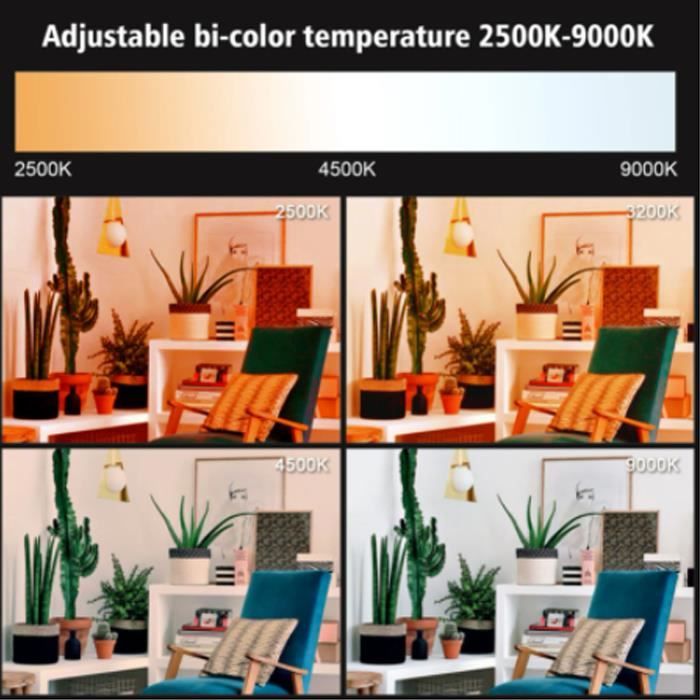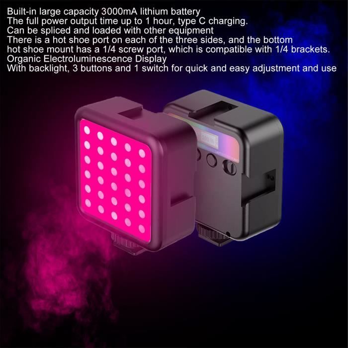 L'écran LCD peut afficher avec précision la température de couleur, la luminosité, etc. Lumières de Photographie RVB, Appareil Photo LED Rechargeable Température de couleur 2500-9000K] Éclairage en couleur à 360°, 20 modes de scène, luminosité 0-100% réglable, convient pour la photographie de nature morte, la vidéoconférence, l'éclairage, la photographie de portrait, etc 【Facile à utiliser】 Avec un trou fileté de 1/4 pouce et un adaptateur de sabot froid en bas, vous pouvez installer la lumière d'appoint sur des appareils photo reflex numériques, des caméscopes, des trépieds, etc. 183g / 6,5 oz Nombre de puces de lampe : 73 pièces (22 pièces en blanc + 23 pièces en jaune + 28 pièces en RVB) Indice de rendu des couleurs : 95+ Température de couleur : 2500-9000K Puissance : 6W Angle d'éclairage : 120° Flux lumineux : 800LX/0,3 m Port de charge : port de type C Interface fixe : support de sabot froid, support de sabot froid, trou de vis 1/4 pouce Batterie : Batterie au lithium 3,7 V 2000 mAh intégrée Liste des colis : 1 x lumière de remplissage 1 x câble de charge 1 x manuel 1 x pince RGB LED Luière Caéra,VIJI LED luière vidéo avec 3 Chaussures Froides, ini Lape vidéo... 【Capacité de 2000mAh】Batterie intégrée avec une capacité de 2000mAh et un port de charge de type C, elle est rechargeable. Comment utiliser : 1., Appuyez longuement sur le bouton d'alimentation pour allumer et éteindre la machine., 2., Appuyez brièvement sur le bouton d'alimentation pour changer de mode., 3., Tournez le bouton CT ou le bouton DIM pour régler la couleur ou la luminosité en fonction de vos propres besoins. Lampe Led Rechargeable 2000mah Lampe Vidéo RVB, Lampe De Caméra LED, éclairage De Photographie Portable Couleur, Lampe De Panneau à Intensité Variable 2500K-9000K, Rechargeable 3000mAh, 26 Effets D'éclairage Lampe Photo Rvb Portable
