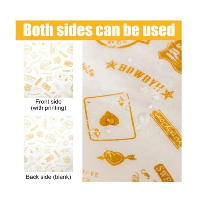 Feuilles Sulfurisées Lot 100 Tocnvoe - 100 Papier Emballage Alimentaire, 28x34cm, Carrés Noirs Blancs, Durable, Résistant à L Papier Sulfurisé Air Fryer Le papier est facile à couper et peut être utilisé de manière flexible comme doublure pour les paniers à provisions ou les boîtes à pain. PAPIER ANTI-GRAISSE POLYVALENT 50 pièces emballages de cuisson de... 100 Feuilles Blanc Papier Emballage Alimentaire, 35x24.7cm, Anti Graisse Papier Cuisson, Fromage WrapPapier Fromage Sulfurisé pour Hamburgers, Sandwichs Imperméable et Résistant à l'huile : la couche intérieure du feuilles cuisson pizza est dotée d'un revêtement hydrofuge qui bloque complètement l'huile et l'eau, garantissant ainsi l'absence de fuites lors de l'emballage d'aliments gras. Il peut également être utilisé sans danger pour la cuisson au four, à la vapeur, au grill et au micro-ondes, grâce à sa résistance à la chaleur pouvant atteindre 230 °C. STOBAZA Lot de 100 feuilles de papier d'emballage alimentaire Le placer à l'intérieur des récipients réduit la fréquence de nettoyage et élimine les soucis liés aux éclaboussures d'huile. Matériau Haut de Gamme : le papier alimentaire est fabriqué à partir de papier enduit de silicone de haute qualité, garantissant la sécurité et le respect de l'environnement pour un contact direct avec les aliments. Conçu avec soin, il offre une alternative économique au film plastique et aux récipients en plastique Il est facile à découper à la taille souhaitée pour n'importe quelle utilisation, se plie de manière compacte pour un rangement peu encombrant et offre une grande praticité. Chaque lot contient 100 feuilles, ce qui est suffisant pour les besoins quotidiens. Pratique à Utiliser : le Papier D'emballage Alimentaire est un choix idéal pour une utilisation nomade et comme doublure de plateau, protégeant efficacement les aliments de la graisse et empêchant les taches dans les boîtes à lunch. Grâce à sa haute résistance à l'huile, la graisse ne s'infiltre pas à travers le papier. Sa texture résistante et épaisse résiste aux déchirures, aux pliures et aux roulages, et préserve l'intégrité des aliments.