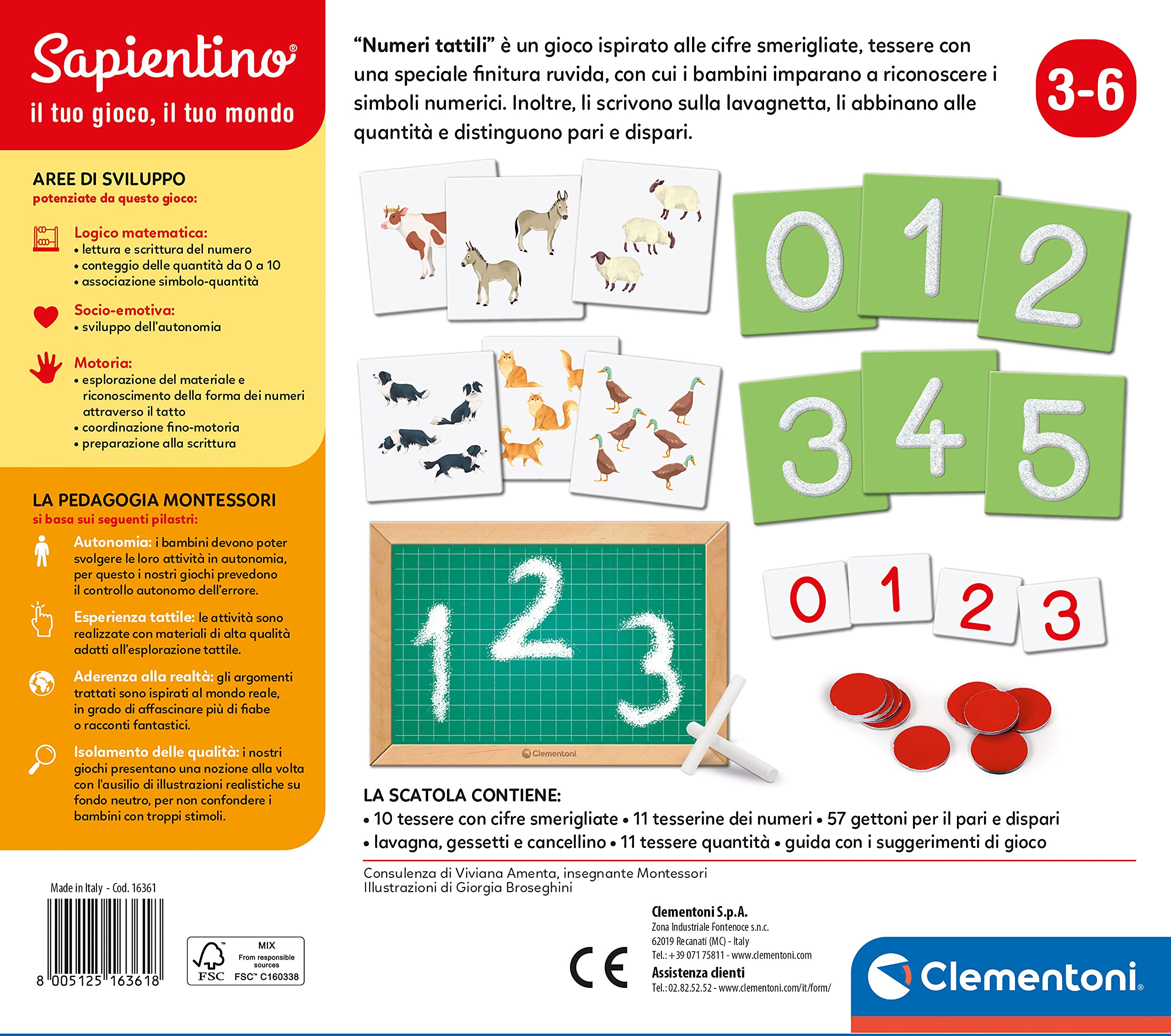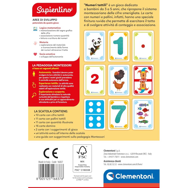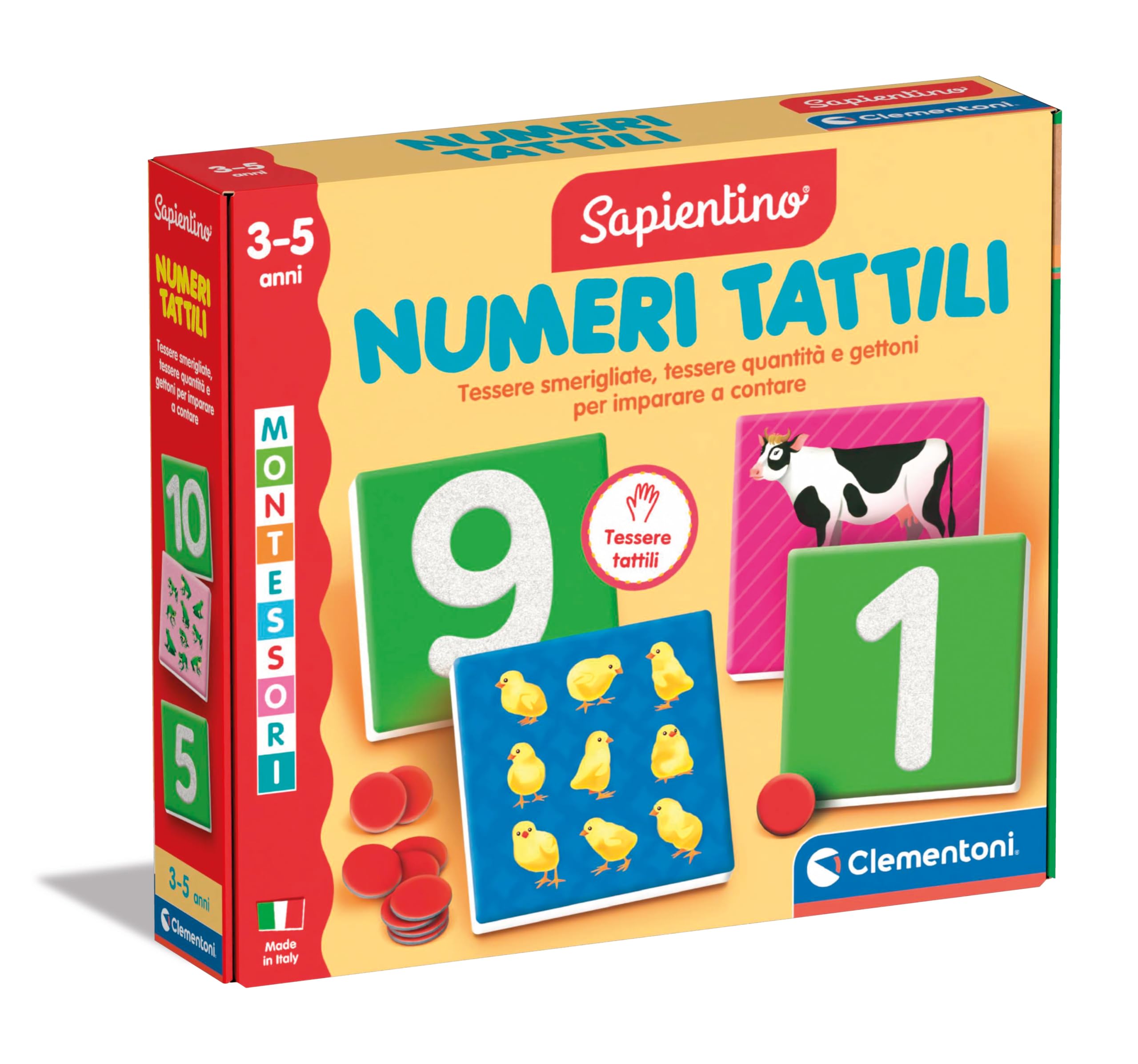 Les Chiffres Tactiles Montessori de Clementoni est un jeu éducatif conçu pour les enfants de 3 à 5 ans, basé sur la pédagogie sensorielle. Jeux éducatifs Montessori Clementoni Les Chiffres Tactiles, Montessori, Contient 22 Cartes, 55 Jetons Et 1 Guide, Fabriqué En Italie, Multicolore - 52796 Jeux Montessori 3 Ans Il permet d’apprendre à reconnaître les chiffres grâce à des cartes rugueuses et à associer ces chiffres aux quantités représentées par des cartes illustrées et des jetons rouges. JEU MONTESSORI CHIFFRES POUR ENFANTS 3–5 ANS : Activité sensorielle avec cartes rugueuses pour apprendre à reconnaître les chiffres par le toucher. STIMULE L’EXPÉRIENCE TACTILE ET LA LOGIQUE : Basé sur l’exploration sensorielle, ce jeu développe la motricité fine, la reconnaissance des formes et l’association visuelle. Un jeu basé sur la perception tactile pour aider l'enfant à reconnaître les chiffres selon la méthode Montessori. Contient 10 cartes avec des chiffres rugueux... Il pourra également distinguer les chiffres pairs et impairs, ordonner des suites numériques et faire ses premières associations mathématiques. Développe l’autonomie, la logique et l’observation selon la pédagogie Montessori. Adapté aux enfants en maternelle pour découvrir la numération de façon autonome et sensorielle. Le jeu contient 11 cartes avec chiffres rugueux, 11 cartes quantité illustrées, 55 jetons et un guide complet avec suggestions d’activités. Favorise l’éveil autonome et respecte les normes pédagogiques et environnementales. Conçu pour favoriser l’apprentissage autonome, il s’intègre dans un cadre éducatif structuré et bienveillant. Les chiffres tactiles - Montessori| Maroc – Eveil Montessori
