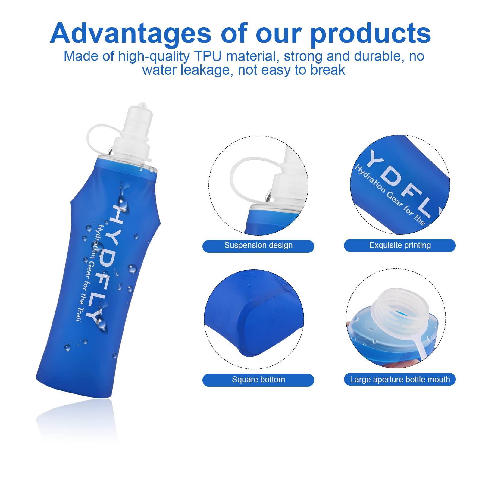 Le couvercle et la bouteille d'eau douce sont reliés par une corde petite mais solide. Bouteille D'eau Souple Pliable Sans Bpa Avec Anneau De Suspension, Bouteille D'hydratation Légère En Tpu Pour Course À Pied, Marathon, Cyclisme, Randonnée 500 Ml Bouteille d'eau 250/500ML, bouteille légère pliable bleue, sacs d'eau portables en silicone sans BPA pour le sport, le vélo, la randonnée, les garçons, la bouteille d'eau douce préféréeSoft Flask Gourde souple unisexeGourde Souple, Flasque Running en TPU, Gourde Pliable Unisexe, Sans BPA, Bouteille d'eau Pliable Réutilisable, pour Course à Pied, Randonnée et EscaladeSoft Reservoir Gourde Souple, Accessoires d'hydratation UnisexesBouteille Pliable, Bouteilles d'eau Pliable Ensemble, Gourde Pliable, Bouteilles d'eau Pliables pour Voyager, Randonnée, AventuresCaractéristiques:1., Pratique à porter : Il est flexible et pliable, qui peut être porté avec vous. Gain de place : la bouteille d'eau douce a une structure compacte, une longue durée de vie et est durable. Il est largement utilisé dans la randonnée, le fitness, le vélo, l'alpinisme, le camping, etc. Grand cadeau de sport : c'est un excellent cadeau pour la famille, les amis, les collègues, en particulier les amis qui aiment un mode de vie sain et aiment le sport. Spécification:Matériau : TPUTaille:A : 22*6 cm/8,58*2,34 pouces (250 ml)B : 25,5*7 cm/9,95*2,73 pouces (500 ml)Couleur bleueListe de colisage:1 * sac d'eau douceNoter:1., température suggérée : 0℃-40℃2., Suggestion de : ne pas stériliser à la vapeur la bouilloire en évitant de déformer. BOUTEILLE D'EAU DOUCE sans BPA et insipide en TPU sport parfaite pour Plus d'avantages : la bouteille d'eau douce a un couvercle, qui peut garder la bouche en silicone propre. Il est facile à , léger et pratique., 2., Fabriqué en matériau TPU, le corps de la bouteille bleu foncé projette une lumière blanche en arête de poisson sous la lumière du soleil, ce qui vous donne envie de boire de l'eau et de reconstituer en temps voulu le corps dont vous avez un besoin urgent d'eau pendant l'exercice., 3., Le corps de la bouteille a une texture givrée, qui vous fait vous sentir plus à l'aise et vous donne une sensation naturelle, de chaud et de fraîcheur., 4., Opération simple : l'eau sort de la bouche en silicium, il vous suffit donc de la mordre lorsque vous buvez de l'eau., 5., C'est un excellent cadeau pour la famille, les amis, les collègues, en particulier les amis qui aime un mode de vie sain et l'amour du sport. (Température d'utilisation recommandée : 0 - 40 ) Le corps de la bouteille bleu avec des motifs en arête de poisson blanc lui donne une belle apparence. Quelle est la eilleure gourde pliable voyage ? – Trip & Fun Gourde Course à Pied Randonnée Shapeheart Gourde Souple 300 Ml Running Et Sports, Compatible Ceinture Flasque Running TPU Ne contient pas de phtalates.