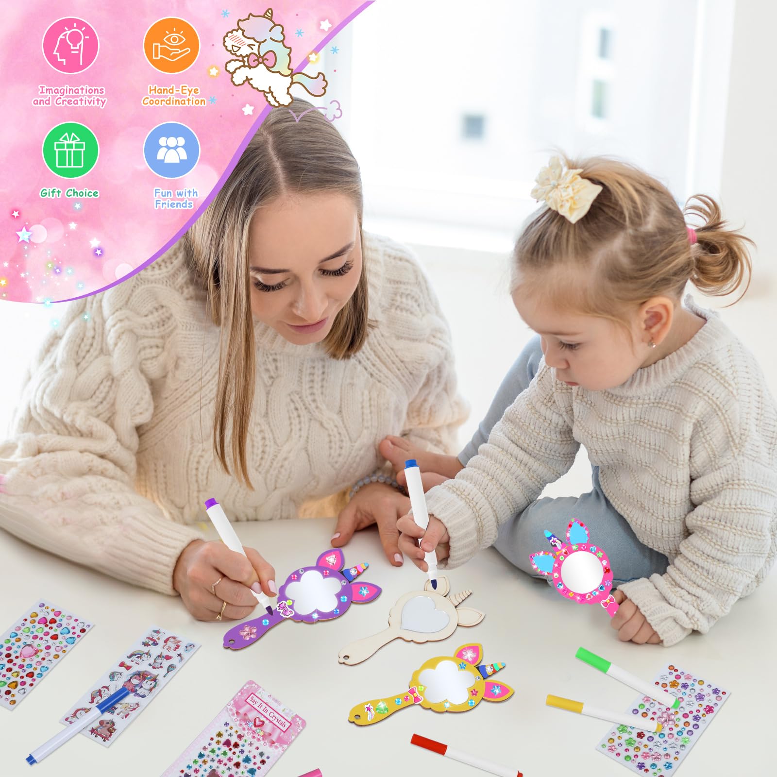 Ils se sentiront fiers et accomplis lorsqu'ils auront terminé leur projet. La surface du miroir est très claire et difficile à casser, assurant la sécurité des enfants. Nos produits sont emballés dans de jolies boîtes cadeaux et peuvent être offerts directement en cadeau, idéal pour les filles de 2 à 12 ans. Disponible pour les fêtes d'anniversaire d'enfants, les fêtes scolaires, les bas de Noël, les œufs de Pâques Jouet Pour Enfant Petite Fille Cadeau D'anniversaire Maison destiné... 【Jouets de fête pour enfants】12 miroirs licorne et de nombreux accessoires, parfaits pour les activités de bricolage en famille, les fêtes d'anniversaire, les fêtes scolaires, les projets de classe et les clubs d'artisanat, etc. Licorne Jouet pour Fille 3 4 5 6 7 8 9 Ans | 3 en 1 Jeux Exterieur Créez leur propre miroir licorne unique ! 【Cadeaux pour filles de 3 à 12 ans】Toutes les petites filles ne peuvent pas résister au charme des licornes. Jeux Enfant 5 Ans Cadeau Fille 4-12 Ans, Crayons De Couleur Enfant Licorne Jouet Fille 3-12 Ans Idée Cadeau Fille 4-12 Ans Activites Manuelles Pour Enfants Malette Dessin Enfant 3-10 Ans Cadeau 3 Ans Fille 【Jouets créatifs】En concevant leur miroir licorne, les enfants peuvent stimuler leur créativité et leur imagination, développer leur coordination œil-main, leur motricité fine et leurs capacités de résolution de problèmes. 【26 pièces de décoration de licorne】 Ce kit de bricolage comprend 12 miroirs de licorne en bois, 8 stylos aquarelle de différentes couleurs, 3 autocollants en diamant et 3 autocollants de licorne en trois dimensions. 【Qualité et sécurité】Ce miroir licorne en bois DIY est fabriqué en bois importé et la surface du miroir est en acrylique spécial.