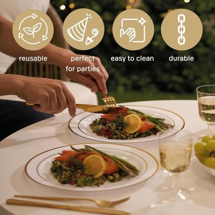 Lot 40 Assiettes 26cm MATANA 40 Assiettes En Plastique Blanc Avec Motif Doré Pour Mariages Assiette Doré Parfait pour toutes les occasions : qu'il s'agisse d'un mariage, d'un anniversaire, d'un baptême, d'un barbecue, d'une fête de Noël, d'un pique-nique, d'une fête de jardin, d'une réunion de famille ou d'un événement d'entreprise, ces assiettes en plastique dorées conviennent à toutes les occasions. ATANA Lot de 20 assiettes de fête en plastique transparent de 26 c... Lot de 40 assiettes en plastique blanches avec bord doré, réutilisables, en plastique dur, 26 cm, pour mariages, anniversaires, fêtes. Design élégant : nos assiettes en plastique blanc de qualité supérieure avec bordure dorée sont conçues pour ajouter une touche élégante à n'importe quel événement. Design Élégant Vous pouvez les utiliser pour une variété d'événements, y compris les baptêmes, Noël et plus encore. Leur design intemporel s'adapte à une variété de thèmes et de décorations. 8 Assiettes creuses carrées plastique réutilisables blanc 18 cm Que vous serviez un plat principal ou une sélection d'entrées, ces assiettes en plastique réutilisables répondront à vos besoins. Lot de 40 assiettes en plastique blanches avec bord doré, réutilisables, en plastique dur, 26 cm, pour mariages, anniversaires, fêtes Design élégant : nos assiettes en plastique blanc de qualité supérieure avec bordure dorée sont conçues pour ajouter une touche élégante à n'importe quel événement. Le design est élégant et élégant et s'adapte à une variété de décorations de table. Pour garantir la longévité, les assiettes en plastique dur doivent être lavées exclusivement à la main et ne doivent pas être utilisées au micro-ondes ou au lave-vaisselle. Réutilisable et facile à nettoyer : ces assiettes en plastique réutilisables sont respectueuses de l'environnement et conçues pour plusieurs utilisations. Réutilisable : prend en charge le nettoyage rapide après la fête, économise du temps et est respectueux de l'environnement, il suffit de laver et de sécher avec du savon et de l'eau chaude, empilable, ne prend pas en charge le lavage en machine, le micro-ondes et le four Le design est élégant et élégant, ce qui les rend assortis à différentes décorations de table. La bordure dorée ajoute une touche de luxe et de sophistication, ce qui les rend idéales pour les occasions formelles.