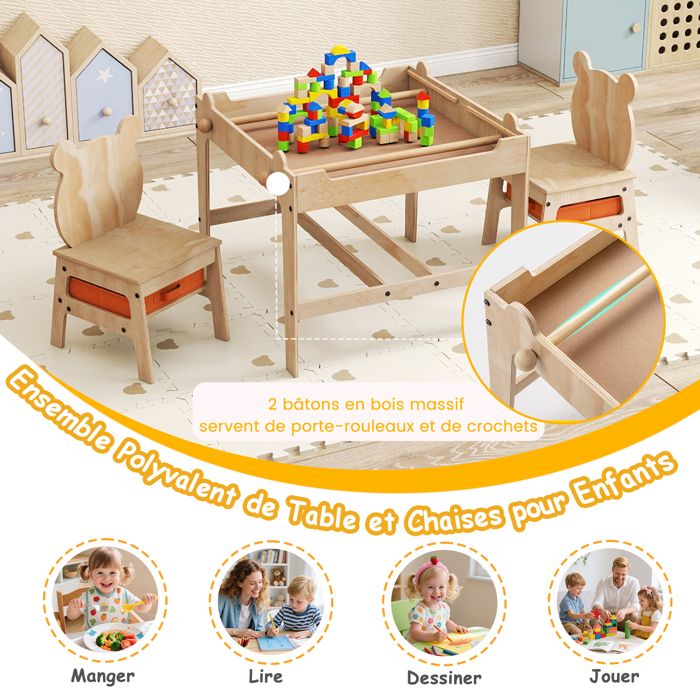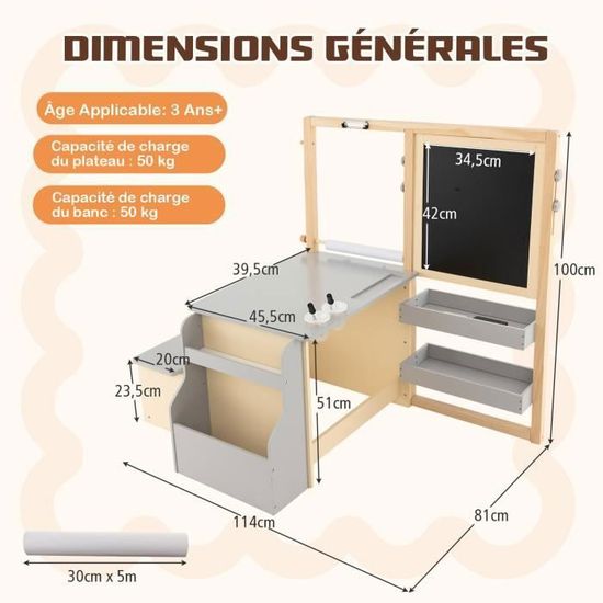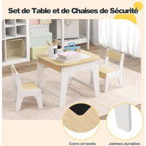 Ensemble Table et 2 Chaises pour Enfant Table d'activité Imprimé Alphabet 796914 Tableau Enfant COSTWAY Table Enfant 120x60cm Et 4 Chaises Avec Plateau Graffiti & Hauteur Ru00e9glable, Table U00e0 Dessin Enfant En Bois Avec Design Peu Encombrant, Charge 50/50kg Pour Maison, Garderie, U00c9cole ( Naturel 【Facile à nettoyer】Les surfaces lisses et imperméables permettent un nettoyage facile—il suffit de les essuyer avec un chiffon humide pour que l'ensemble reste comme neuf et prêt pour la prochaine aventure de votre enfant. Assemblage nécessaire Spécifications : Couleur : Blanc + Gris / Blanc + Naturel Matériau : MDF Dimension de la table : 61,5 x 61,5 x 48 cm (L x l x H) Dimension de chaque chaise : 30,5 x 28,5 x 53 cm (L x l x H) Dimension du siège : 27 x 26 x 26,5 cm (L x l x H) Dimension du bac en tissu : 25 x 25 x 10 cm (L x l x H) Âge recommandé : 3+ ans Poids net : 17,5 kg Livraison : 1 x Table 2 x Chaises 2 x Bacs en tissu 1 x Manuel d'utilisation 【Construction solide】Conçu en pensant à la sécurité de votre enfant, cette table et chaises multi-usages répondent à des normes élevées, garantissant qu'il est fabriqué à partir de matériaux sûrs pour les enfants et d'une structure stable pour une utilisation à long terme. Cet ensemble comprend 1 table et 2 chaises adaptées aux garçons et filles de 3 à 6 ans. La table dispose de 2 plateaux réversibles, avec un tableau noir d'un côté et un tableau blanc de l'autre, permettant aux enfants de dessiner ou d'écrire 【Détails bien pensée】Les chaises confortables sont conçues avec des dossiers ergonomiques pour cultiver une bonne posture assise. SoBuy KMB75-K-W Table Enfant avec 2 Chaises,Table Réversible à Double... Les coins arrondis anti-collision évitent les égratignures et les ecchymoses. Un côté du plateau est une tableau noir pour dessiner, tandis que l'autre offre une surface lisse idéale pour lire ou manger.