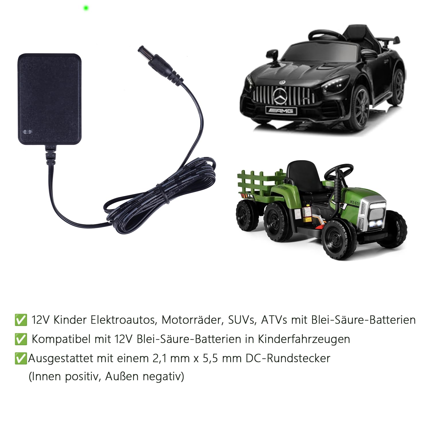 Ce chargeur 12V 1A est spécialement conçu pour les voitures électriques, les motos, les vus et les VTT pour enfants et est spécialisé dans la charge des batteries plomb - acide 12V. Il n'est pas compatible avec les jouets utilisant des batteries lithium - ion Longueur du câble : 1,93 m ; Connecteur : 5,5 mm x 2,5 mm (diamètre extérieur x diamètre intérieur) ; veuillez vérifier attentivement la fiche avant de commander. Chargeur Sécurisé LED Voiture Jouet Chargeur Voiture Electrique Enfant 12v : Top 10 En 2025 | Le Chargeur 12V 1A Batterie Enfant 1., Chargeur de batterie pour véhicule electrique enfant est compatible avec la plupart des véhicules électriques pour enfants, tels que les motos électriques, les SUV, les VTT et les petites voitures., 2., Chargeur de batterie 12 V pour enfants offre une charge sûre et efficace, et dispose d'un voyant lumineux pour vous informer de l'état de charge., 3., Compact et puissant, Chargeur de batterie pour véhicule electrique enfant est doté d'une prise parfaitement adaptée pour une connexion facile et sécurisée à votre appareil. Un atout supplémentaire. [Matériau durable] Chargeur voiture electrique enfant est fourni avec un câble robuste de 1,1 mètre et est compatible avec une variété d'appareils 6 V. Le chargeur de voiture électrique 12 V pour enfants est un appareil puissant, sûr et polyvalent, conçu pour recharger une large gamme de véhicules électriques 12 V. Qu'il s'agisse d'une moto, d'un SUV, d'une jeep ou d'une voiture de course pour enfants, ce chargeur offre une solution rapide et efficace pour maintenir la batterie de votre... LALAHO Voiture Véhicule électrique Enfant,avec télécommande à 2,4 GHz,2 Sortie : 12 V CC, 1 A, pour une charge efficace et rapide de la batterie. [Compatibilité universelle] Chargeur voiture electrique enfant est compatible avec la plupart des véhicules électriques 12 V pour enfants, y compris les petites voitures, les motos, les SUV, les véhicules tout-terrain, les VTT, les quads et les tracteurs. Spécifications : Nom du produit : 12 V 1 A Chargeur de batterie 12 V pour enfants Matériau : Boîtier en polycarbonate, fil de cuivre pur Couleur : Noir Dimensions : 9 x 7 x 4 cm Poids : 70 g Application : Convient à tous les véhicules électriques pour enfants 12 V Contenu de l’emballage : 1 x Chargeur voiture electrique enfant Remarque : Avant d’acheter, veuillez vous assurer que ce chargeur est compatible avec votre véhicule électrique.