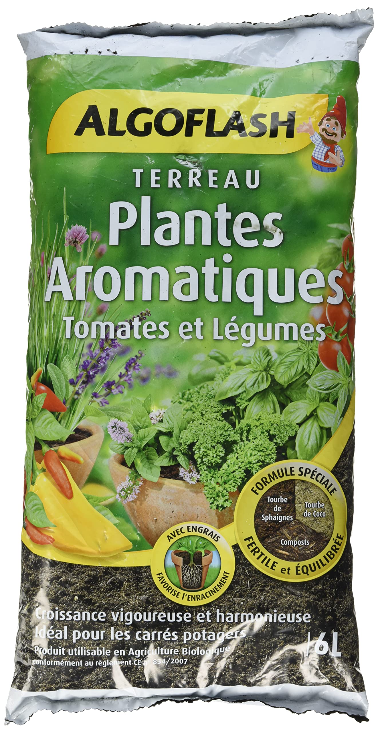 Utilisable en Agriculture Biologique, avec engrais pour favoriser l'enracinement, Fabriqué en France Description du produit Terreau à base d’éléments nutritifs recommandé pour favoriser une croissance harmonieuse et vigoureuse ainsi qu’intensifier le développement des racines, Idéal pour toutes variétés de plantes aromatiques (persil, ciboulette, menthe…) et des légumes et fruits en pot (tomates, poivrons, courgettes, fraisiers…) ; Prêt à l’emploi:Utilisation facile et rapide, Doses d’emploi à l’arrière de l’emballage, Pour repiquage et surfaçage, Périodes idéales pour planter vos végétaux : entre octobre et avril ; Utilisable en Agriculture Biologique, avec engrais pour favoriser l'enracinement, Fabriqué en France ; Formule à base de Tourbe de sphaignes, tourbe de coco, compost de matières végétales en mélange, ENGRAIS NF U 42-001 ; Contenu: 1 x Terreau Plantes Aromatiques, Tomates et Légumes en pot, 6 L, ALGOFLASH, ATAROM6, Dimensions (L x P x H): 24 x 5 x 35 cm Contenu du coffret Sac 6 L Prêt à l’emploi:Utilisation facile et rapide, Doses d’emploi à l’arrière de l’emballage, Pour repiquage et surfaçage, Périodes idéales pour planter vos végétaux : entre octobre et avril Sac A Plantation Agloflash Terreau Plantes Aromatiques, Tomates Et Légumes En Pot, Utilisable En Agriculture Biologique - 6L Terreau Algoflash Acheter Algoflash Terreau Plantes Aromatiques, Tomates et Légumes, 6L Utilisable en Agriculture Biologique*, il est particulièrement recommandé pour la culture des plantes aromatiques (persil, ciboulette, basilic …), des légumes (sable, radis …) et légumes-fruits (tomate, piment, poivron, courgette, …) en pot et dans les carrés potager ALGOFLASH Engrais Longue Durée pour Tomates et Légumes, Jusqu'à 30m², 2 kg, POTA2N
