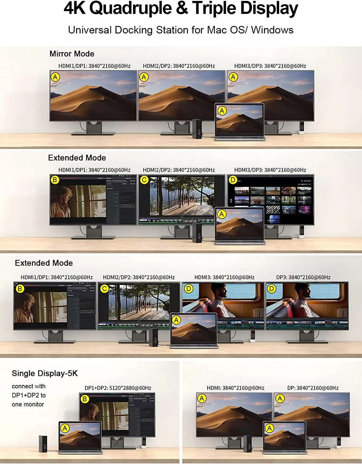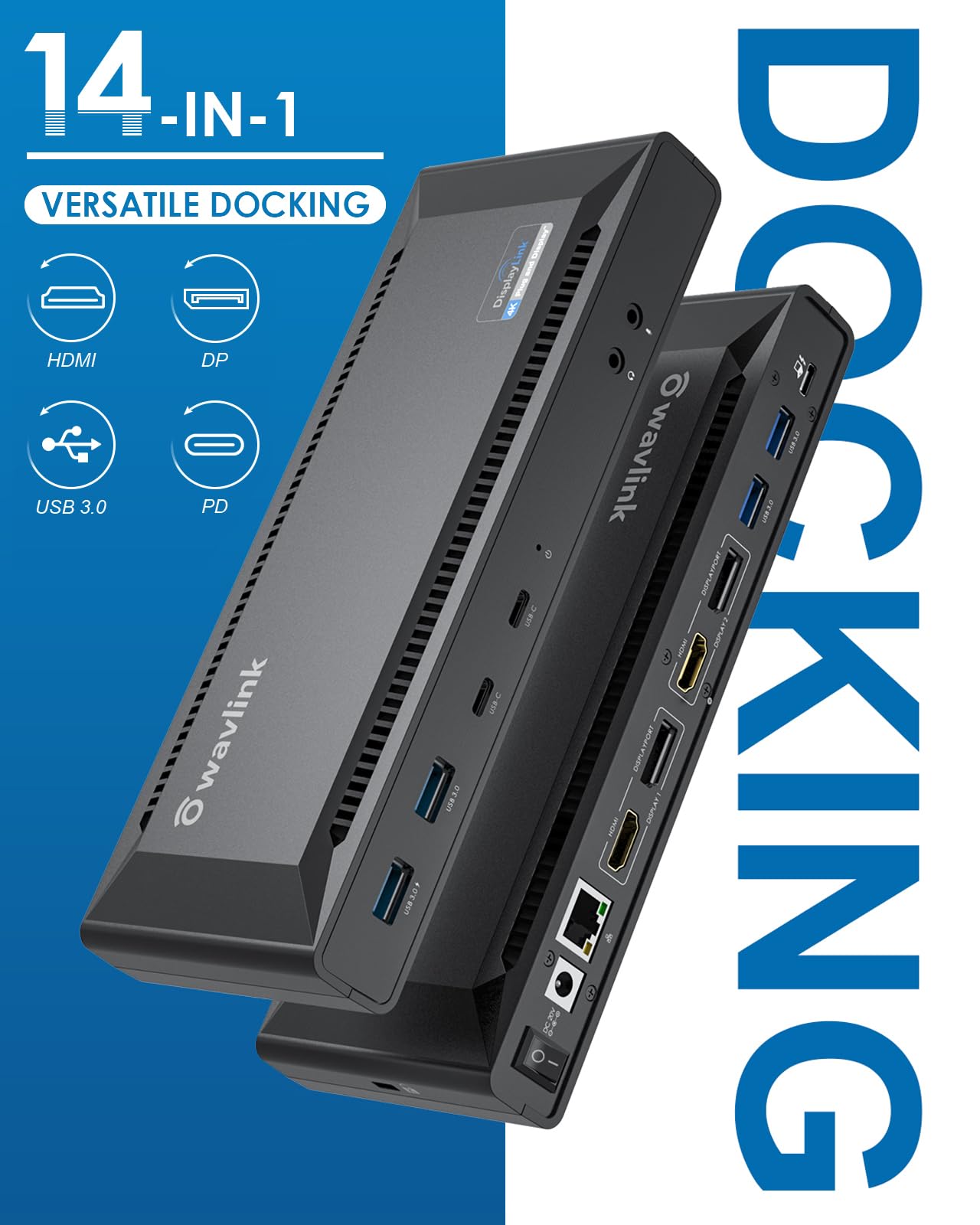 Station Accueil 15 En 1 WAVLINK Station D'accueil USB-C DisplayLink Premium : 4 X HDMI 2.0, Quad 4K @ 60 Hz Pour M1/M2/M3 Mac & Windows, Station D'accueil 15 En 1 Avec Chargeur 100 W, LAN 2,5 Wavlink Station D'accueil Fentes pour lecteurs de cartes SD et TF Vous pouvez consulter facilement des vidéos ou des photos instantanément sur vos PC/ordinateurs portables et transférer des fichiers volumineux en quelques secondes avec une vitesse maximale pouvant atteindre 312 Mo/s. Veuillez suivre les instructions pour télécharger le dernier pilote DisplayLink depuis le site officiel avant utilisation. (Le câble Kensington n'est pas inclus). 【Alimentation efficace】 Comprend un bloc d'alimentation de 160 W avec une charge de 100 W (port hôte USB-C) pour ordinateurs portables Charge rapide PD 30 W (port USB-C avant) pour smartphones/tablettes Remarque : le terminal doit prendre en charge le PD. Design durable : boîtier en aluminium avec silhouette fine – Ajustement optimal pour les configurations professionnelles et de jeux. Ports haute vitesse : 5 ports USB-A/C 3., 2 (10 Gbps) pour les transferts de flash SD/MicroSD (312 Mo/s) pour un accès direct aux médias LAN 2,5 G (2,5 × plus rapide que Gigabit) pour un streaming et des appels vidéo fluides Station d'accueil 15 en 1 : la station d'accueil Premium offre : 4 x HDMI 2., 0 | LAN 2,5 G | USB-C 3., 2 (10 Gbps + PD30 W) | 2 x USB-C 3., 2 (10 Gbps) | 3 x USB-A 3., 2 (10 Gbps) | fente SD 4., 0 (312 Mo/s) | MicroSD 4., 0 SC. Transfert de données ultra-rapide 10Gbps Cette station d'accueil dispose de cinq ports USB 3., 2 haute vitesse, dont deux USB-C et trois USB-A, tous prenant en charge des vitesses de transfert allant jusqu'à 10 Gbps. WAVLINK Station d'accueil USB-C DisplayLink Premium Un avantage supplémentaire : l'un des ports USB-C offre une charge aval de 30 W, permettant d'alimenter facilement vos appareils mobiles pendant que vous travaillez. WAVLINK- USB 3.0 o USB C a HDI Dual Splitter Pantalla Extendida para... Compatible Systems:Windows 11/10, Mac OS 11., x-15., x or later, Chrome OS, Ubuntu, Harmony. 2,5 fois plus rapide que le Gigabit 2500Mbps Ce port LAN offre une connexion filaire stable et époustouflante aux nouveaux ordinateurs portables Type-C/Thunderbolt qui manquent de port RJ45, tout en étant rétrocompatible avec les réseaux 10/100/1000 Mbps. Quad 4K @ 60Hz offre un texte cristallin, des images vives et une densité de pixels plus élevée. Orifice pour câble de sécurité Fente de sécurité Kensington latérale Prend en charge la connexion d'un câble de sécurité Kensington, qui protège les appareils et les données importantes contre le vol pour garantir la sécurité de vos biens/vos données. Sur Mac, la rotation de l'écran et le mode fermé ne sont disponibles qu'à partir de macOS 12., x et supérieur. Le dock est auto-alimenté et doit être connecté à l'adaptateur secteur pour fonctionner normalement. En plus de quatre ports HDMI 2.0 pour jusqu'à quatre écrans UHD 4K (3840 x 2160 @ 60 Hz), elle offre de nombreux ports supplémentaires – y compris 100 W Power Delivery, 2,5 G LAN, USB 3.2 Type-A/C, USB-C PD (30 W) et lecteur de carte SD/MicroSD Mode rotation et mode fermé Sous Windows, la rotation de l'écran et le mode fermé (clamshell) sont tous deux disponibles. Ce dock est compatible avec les ordinateurs portables Thunderbolt 4/5 avec un taux de transfert de données maximum de 10 Gbps, ne pouvant atteindre 40 Gbps.