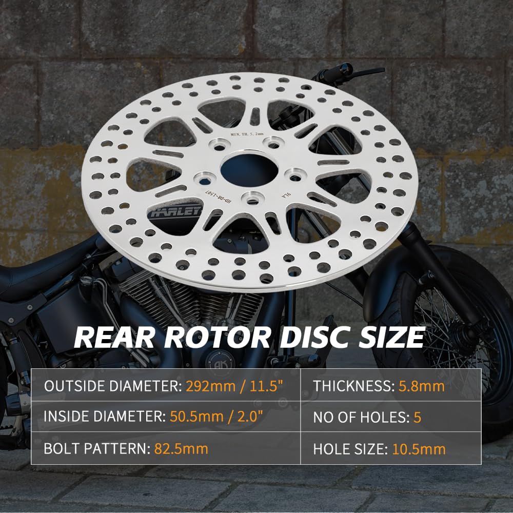 Disque De Frein Avant Harley Davidson XLH 883 Sportster, Fat Boy Super Glide Springer Softail 1340 O292 Mm Braking Freinage Amélioré Dissipation Thermique Harley-Davidson- Disque De Frein Arrière Seismic - Harley-Davidson Big Disque Frein Harley Softail -Le rotor du disque de frein de moto est facile à utiliser et à installer, sans opérations compliquées. Disque de frein arrière :Diamètre extérieur 292 mmDiamètre intérieur 56 mmÉpaisseur 5,5 mmQuantité de trous 5Taille du trou 10,5 mmCirconférence du trou 82,5 mmListe de colisage:1x disque de freinRéduire l’évanouissement des freins, minimiser la déformation et assurer la longévité du rotor. Pratique et pratique : le disque de frein de la moto vous permet de freiner rapidement à grande vitesse, une efficacité de travail plus élevée apporte plus de sécurité, de commodité et de praticité. Disque et visserie de disque de frein ARRIERE des BigTwin Evolution Softail, Dyna et FXR et Sportster de 1992 à 1999 (sauf FLT, FLHT, FLHR et FLHS). Les disques OEM 41791-79A utilisent des vis fraisées La fonction principale d'un disque de frein de moto est de fournir un effet de freinage, aidant le véhicule à ralentir ou à s'arrêter., -Matériau : Acier Wag 52512031k kit frein a disque mecanique arriere etrier levier avec -Il y a de nombreux trous sur la planche pour utiliser pleinement le flux du vent, augmenter l'effet de dissipation thermique, fournir une force de freinage stable, suffisante et contrôlable et améliorer considérablement la sécurité, l'efficacité et la sécurité de conduite. Augmentez les performances de freinage sur route et sur piste.