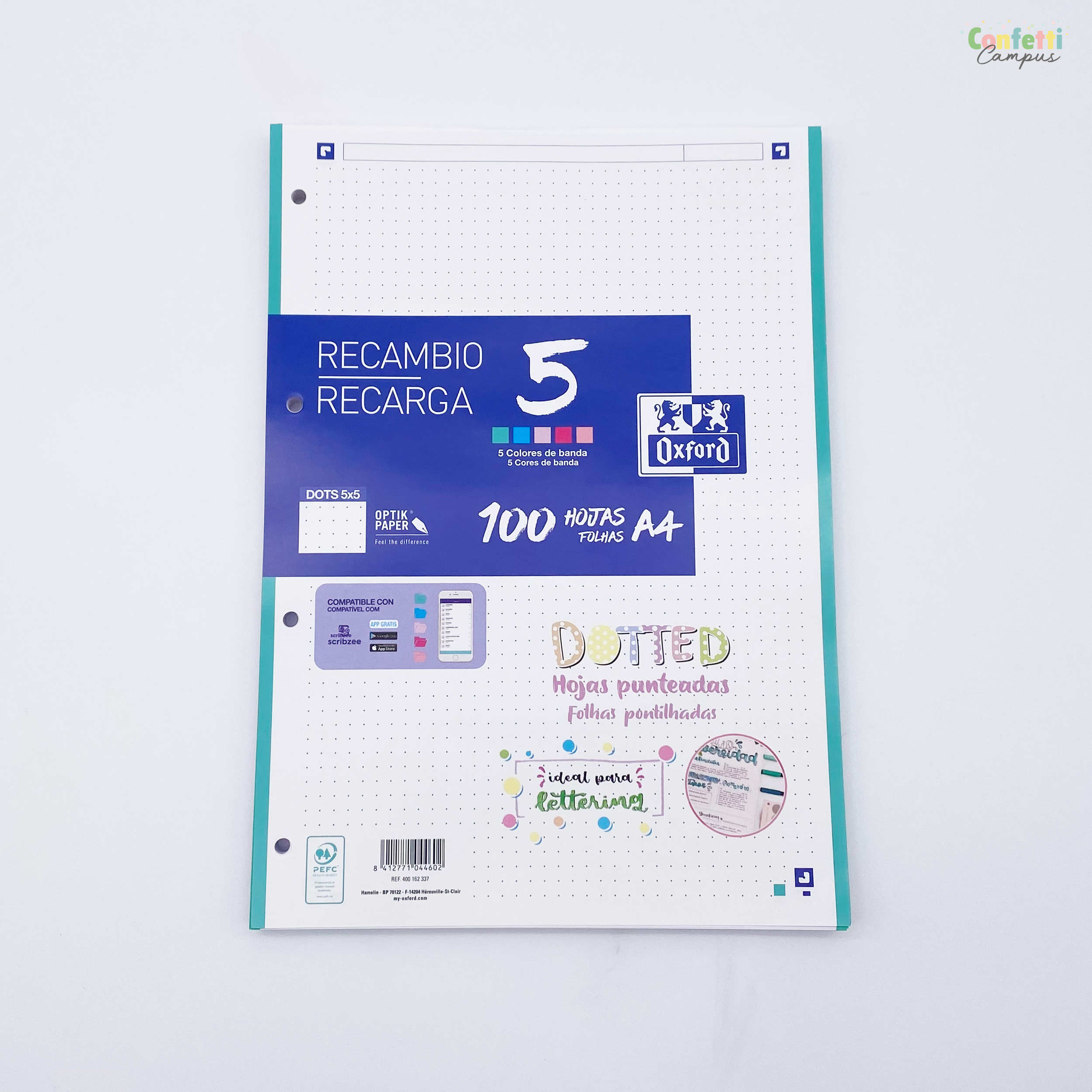 CAHIER OXFORD OFFICE ESSENTIALS RELIURE INTÉGRALE COUVERTURE SOUPLE A5 100 PAGES 90G QUADRILLÉ 5MM Recharge de 100 feuilles A5 quadrillées 5 mm - Oxford Lot de 100 feuilles détachées , Format A5., Quadrillage 5 x 5 mm Format de feuille : A5 Nombre de pages : 100 Grammage du papier : -80-90 g/m² Type de réglure : quadrillé 5 x 5 Ce produit est certifié EU Ecolabel et est fabriqué en France. Passez votre commande dès maintenant Feuilles Quadrillées A5 Oxford OXFORD - Feuilles Simples Perforées 300 Pages 5x5 Avec Marge - 90g - La Papier Optik 90g/m² Sans Transparence 4 couleurs de quadrillage pour séparer par matières , 6 perforations.