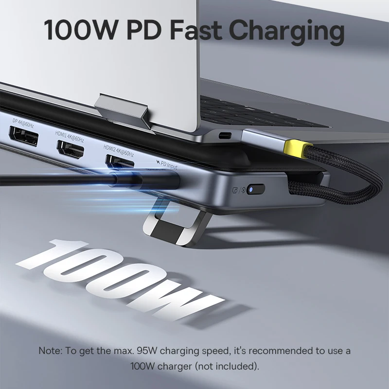 【Qualité d'image parfaite au pixel près】Résolution jusqu'à 4K@60Hz lors de l'utilisation d'un seul des trois ports entre DP et HDMI, avec les 2 autres inactifs. 【Multitâche 4K simultanée avec 3 moniteurs】Cette station d'accueil USB C est dotée de 2 ports HDMI et d'un port DP, tous trois prenant en charge la sortie 4K pour une résolution parfaite au pixel près. 【Rembourrage en silicone adhérent】La hub usb c Baseus pour MacBook est rembourrée de silicone souple empêchant votre ordinateur portable de glisser tandis que les coussinets à l'arrière l'empêchent de se déplacer. Baseus USB C to HDMI Adapter, 4K@60Hz USB C Docking Station, 7 in 1 USB C Hub with 3 USB-A, PD 100W, TF/SD Card Reader, Compatible for iPhone 15/Mac/Dell/Acer/HP/ASUS/Steam Deck/Rog Ally 【Position ergonomique d'utilisation】Placez docking station pour ordinateur portable usb c sous votre ordinateur portable comme un support de position de frappe ergonomique qui est convivial pour vos mains et tous les ports peuvent toujours être utilisés en même temps. Hub 12-en-1 : PD 100W, 2 HDMI 4K, 1 DP, Ethernet, 3 USB3.0, 1 USB C, SD/Micro SD, audio 3,5 mm. Position ergonomique USB-C Hub 11 In Baseus Station D'accueil USB C, 12 En 1 Dual 4K60Hz HDI Et Displayport Spacemate 11 Port Cette station d’accueil Baseus USB-C est également conçue pour accompagner la mobilité. Légère, compacte et résistante, elle s glisse facilement dans un sac ou une sacoche sans alourdir vos déplacements