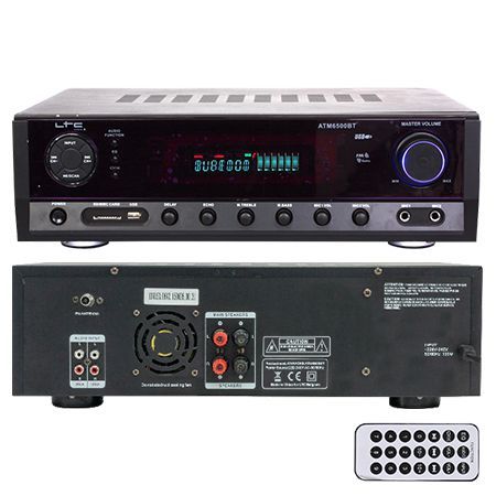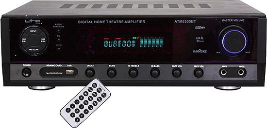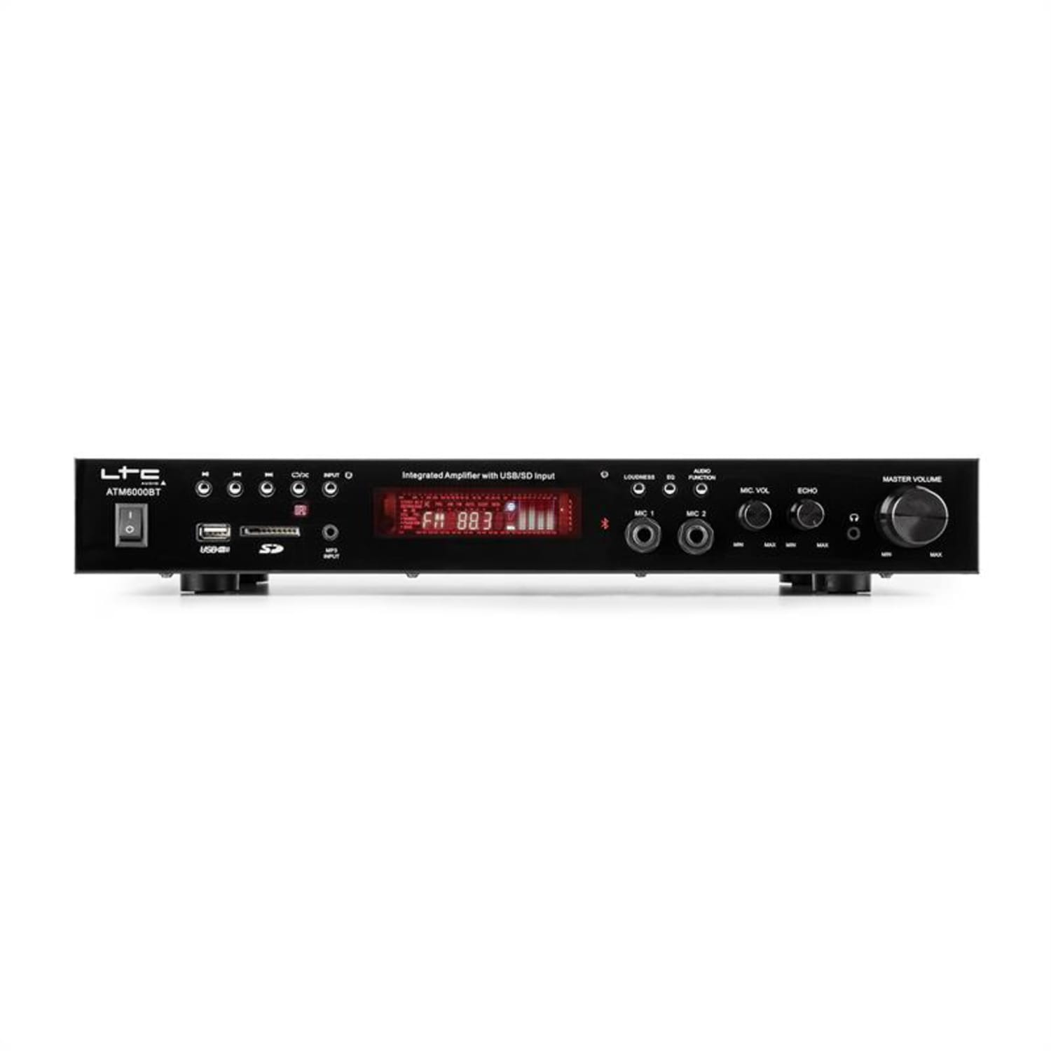 FONCTIONNALITÉS : Cet amplificateur possède un large panel de connectivité avec notamment Bluetooth, USB, SD et entrée AUX. Ecran avec affichage dynamique des fréquences LTC ATM6500BT HI-FI STEREO VERSTÄRKER 2x50W MIT BLUETOOTH & KARAOKE Amplificateur Hi-Fi polyvalent avec tuner FM intégré, avec lequel vous pouvez profiter pleinement de votre musique préférée à partir d’un support USB, SD, MP3 & Bluetooth, avec la possibilité de brancher des enceintes surround supplémentaires Contrôlez le avec la télécommande incluse. ATM6500BT - Systèmes karaoké complets SON : Avec une puissance de 2x50W, un réglage du volume, des balances, des graves et des aigus, cet amplificateur s’adaptera à vos envies. ÉCRAN : Avec l’écran LCQ qui permet une clarté de lecture, trouvez une petite place pour profiter de tout ce que cet amplificateur apportera à votre quotidien. Ampli Home Cinéma Réglage Basses Aigus Ampli Hifi LTC MFA1200-BT - 100W - Bluetooth USB - 2 Micros - Noir Ampli Karaoké Ampli Compact Fonctionnalités Multiples Réglages des graves et aigus des microphones, Entrée USB & SD ATM6500BT AMPLIFICATEUR HIFI 2 x 50W AVEC TUNER FM, FONCTION BLUETOOTH & KARAOKE Amplificateur polyvalent avec tuner FM intégré qui vous permet de profiter pleinement de vos musiques préférées sur vos médias USB, SD ou smartphone via la liaison Bluetooth. Si vous branchez un ou deux microphones, vous pouvez même organiser des soirées Karaoké en famille ou entre amis., Tuner FM, Fonction Bluetooth