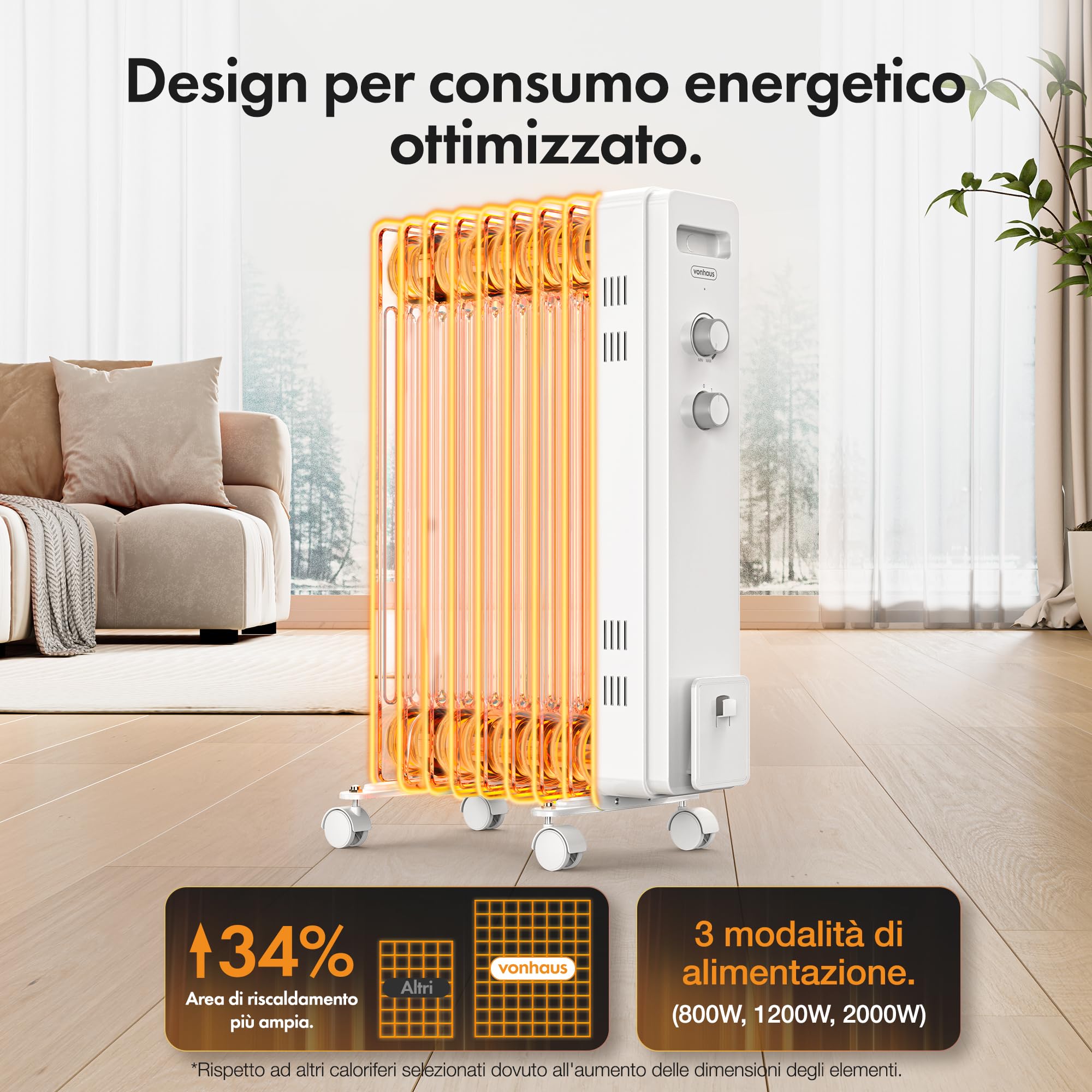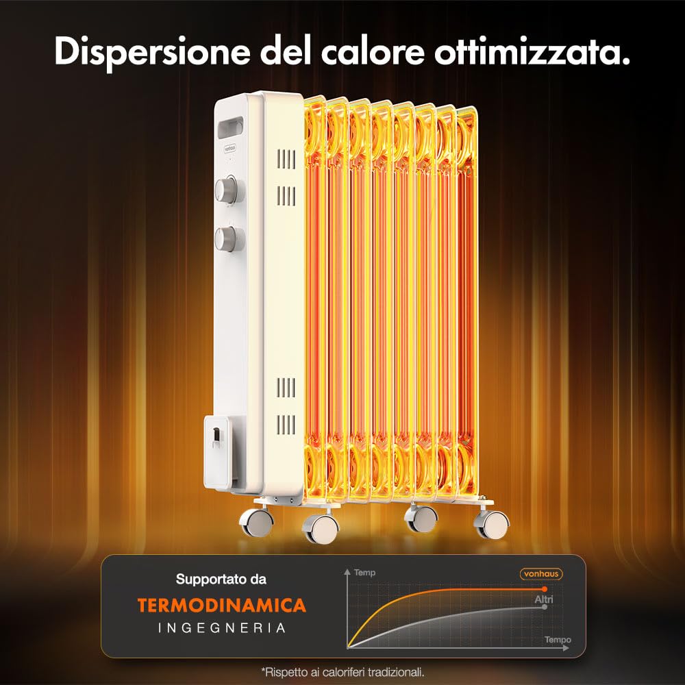 Chauffage D'appoint Sécurité Basculement Radiateur Bain D'huile Teesa Radiateur électrique à Huile TSA8036 2000 Thermostat Réglable Chauffage Radiateur bain d'huile noir 2 000 W avec thermostat | Chauffage portable Notre radiateur à bain d'huile transformera votre espace en un havre de chaleur en seulement 10 minutes, avec un minimum de gaspillage d'énergie. CONCEPTION À 9 AILETTES : obtenez une chaleur optimale avec le chauffage bain d'huile économique noir, doté de la technologie ThermoDynamic. Le radiateur s'éteint et se rallume automatiquement pour conserver la température idéale. Le range-câble maintient le câble de 1,5 m à portée de main. Restez au chaud cet hiver grâce à notre radiateur à bain d'huile conçu avec une technologie innovante. NOTRE PROMESSE : fondée en 2009, VonHaus vous offre un confort optimal toute l'année. THERMOSTAT RÉGLABLE : ce radiateur bain d'huile électrique de 800 W/1 200 W/2 000 W est doté d'un thermostat à bouton rotatif pour un confort sur mesure. Votre maison, chauffée à votre façon. Radiateur Bain d'huile Condor | 11 éléments | 2500W CBH1125C2NB Radiateur bain d'huile à 9 ailettes | Chauffages à l'huile Restez au chaud cet hiver grâce au radiateur bain d'huile 9 ailettes de VonHaus. Chauffages d'extérieur Couvertures & coussins chauffants électriques Rowenta Intensium BU2620 Radiateur bain d'huile, 2 000 W, Huile caloporteuse, Surface de la pièce 25 m², Pose libre, Vertical, Poignée de transport, Fabriqué en France 9 offres à partir de 81,73 € Détails du produit La conception à 9 ailettes augmente la surface, améliorant l'efficacité du chauffage. Investissez dans votre confort et votre bien-être. Ses ailettes offrent une surface accrue et 5 canaux d'huile. Réglez le thermostat et la puissance de sortie pour trouver le niveau de chaleur idéal. Si le radiateur est renversé à plus de 45 °C ou surchauffe, il s'éteint automatiquement. Conception pratique Conçu pour une utilisation facile. CHAUFFAGE BAIN D'HUILE ÉCONOMIQUE : les trois réglages de puissance (1 000 W, 1 500 W, 2 500 W) de ce chauffage d'appoint à bain d'huile vous permettent de faire des économies Avec ses puissances de 800 W, 1 200 W et 2 000 W, obtenez la chaleur optimale pour n'importe quelle pièce jusqu'à 25 m². Radiateur portable avec range-câbles, poignée et 4 roulettes pivotantes à 360 °.