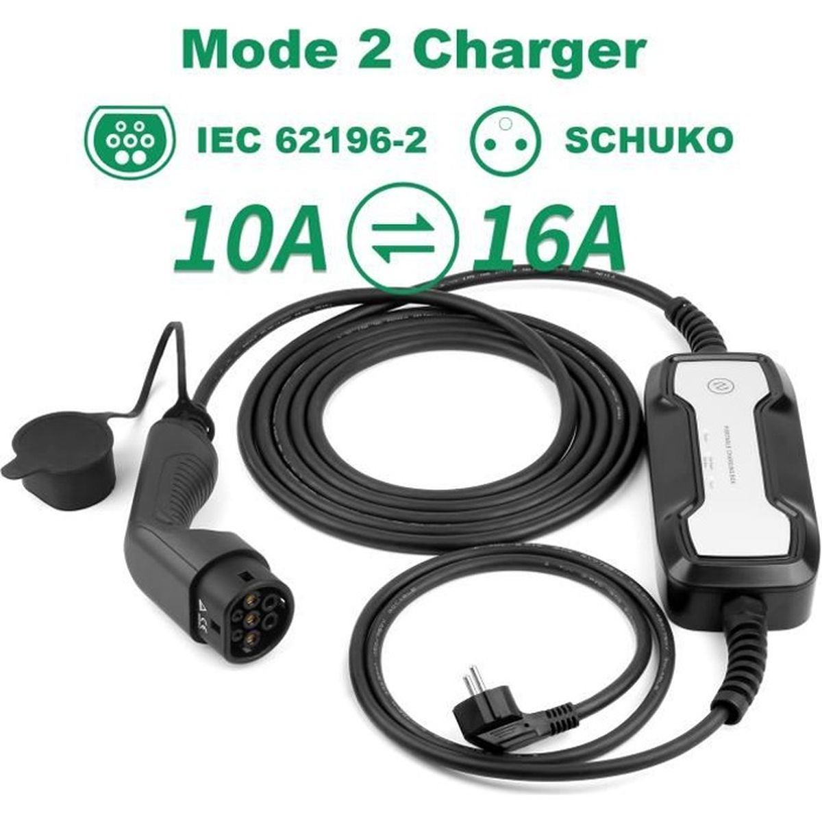 Il ne craint pas d'être exposé au soleil brûlant en été. Câble de recharge haute performance avec des matériaux premium : Le câble de recharge EVJUICION Type 2 (Schuko) combine des fils de cuivre sans oxygène et des contacts argentés pour une conductivité optimale. Lorsqu'il est connecté au véhicule électrique, la LED jaune s'allime constamment. Câble de recharge résistant à la chaleur, sûr et stable : Notre câble de recharge est fabriqué à partir de matériaux de haute qualité et bénéficie d'une conception optimisée. Lorsque le chargeur Type 2 est connecté à la source d'alimentation, la LED verte s'allume en permanence. Test : chargeur EVJUICION pour voiture électrique type 2 Garantie et service client : Ce produit bénéficie d'une garantie de 12 mois. Cliquez sur le nom du vendeur, allez sur la page de la boutique et sélectionnez Poser une question. Marque. Evjuicion · Couleur. Noir · Tension de sortie. 230 Volts (courant continu) · Note actuelle. 16 A · Ampérage. 16 A · Fabricant. Evjuicion Câble Recharge Voiture électrique 16 A Type 2 Ev Chargeur Câble De Charge Schuko 3,6 Kw 10 M Chargeur De Voiture Électrique Pour Câble Haute Qualité Cuivre Argent Une lumière rouge clignotante indique une erreur Avec 16A/3,68kW (230V), il recharge efficacement, réduit la résistance et prolonge la durée de vie – pour une charge plus rapide et stable avec une efficacité énergétique maximale. Rechargez rapidement votre véhicule avec cable de type 2 de la marque Evjuicion. Le câble de recharge voiture électrique Evjucion type 2 présente une compatibilité universelle, fonctionnant avec toutes les voitures électriques et hybrides rechargeables de type 2 en Europe Branchez et chargez : Un indicateur LED intelligent affiche l'état de charge en temps réel. Idéal pour une utilisation fréquente et à long terme Câble de charge pour voiture électrique type 2 Schuko La fiche Schuko a également subi des tests de haute température pour assurer une utilisation stable dans des environnements chauds et éviter les risques de surchauffe