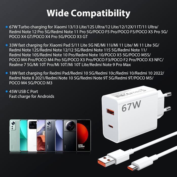 ⚡ Charge Rapide 67W : Chargeur turbo compatible avec les appareils Xiaomi, Redmi Note 14/13/12 Pro, Poco X6/X5 Pro, et autres modèles prenant en charge la charge rapide 67W 🛡️ Sécurité et Compatibilité Certifié CE, le chargeur intègre des protections multicouches (surchauffe, surtension). Chargeur super rapide] Adaptateur de charge USB 67 W pour charger rapidement les appareils Xiaomi Universel, multifonctionnel, compatible avec Xiaomi 67 W 33 W tous les modèles avec connecteur USB Type-C Compagnon de voyage parfait, compact, petit et puissant Parfait pour tous les modèles Xiaomi/Redmi/Poco récents. Le câble USB-C inclus supporte même le transfert de données à 480 Mbps. Et pas d'inquiétude pour la... 🔌 4 Pièces Premium : Comprend 2 chargeurs 67W (fiche EU) + 2 câbles USB-C 6A (2 mètres) pour une charge ultra-rapide et une durabilité optimale Présentation Du Nouveau Xiaomi Mi 67W SonicCharge : Chargeur Rapide Et Puissant Pour Ordinateurs Portables Et Téléphones Portables 📱 Compatibilité Large : Fonctionne avec Xiaomi 14/13/12, Redmi Note 14/13/12 Pro, Poco M6/X6, Black Shark, et autres appareils USB-C 🎁 2 Kits Complets : Idéal pour la maison, le bureau ou les voyages – chaque kit contient 1 chargeur + 1 câble longueur 2M Chargeur EU Compatible PD Huybaa 4PCS Chargeur Rapide 67W EU + 2 Câbles USB-C 6A (2M) Pour Xiaomi Redmi Note 14/13/12, Poco X6/X5 Pro - Chargeur Turbo Compatible 67W Xiaomi Charger Price *Temps de charge variable selon l’appareil et les conditions d’utilisation. Les câbles USB-C 6A inclus garantissent une transmission stable et ultra-rapide. 📦 Ce Que Vous Recevez 2 × Chargeur Rapide 67W (fiche EU) 2 × Câble USB-C 6A (2 mètres, résistance aux torsions) Emballage neutre et élégant.