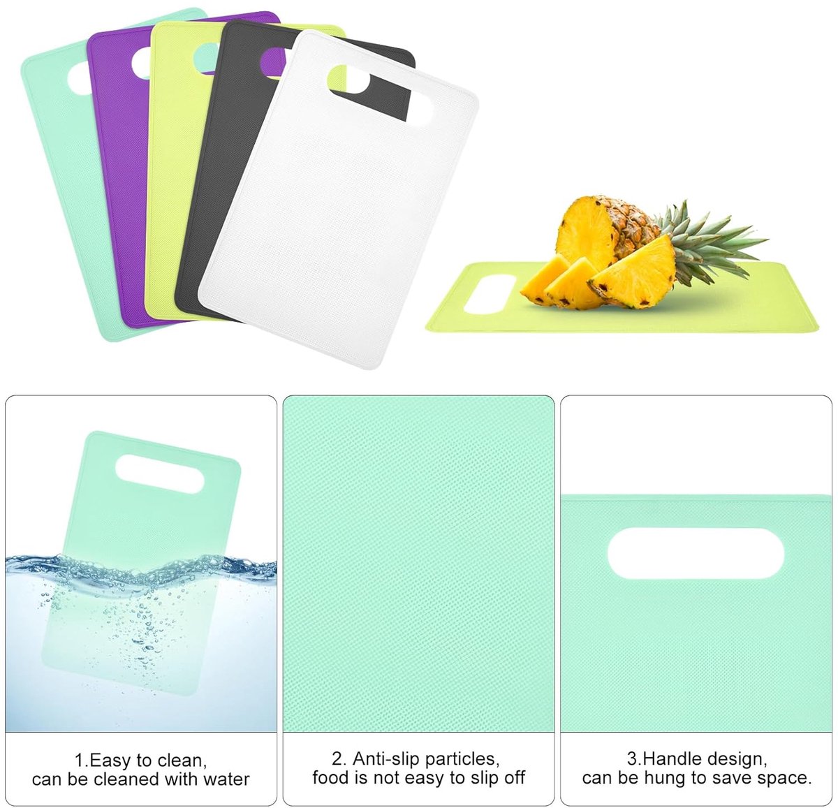 Pour une stabilité supplémentaire, placez un chiffon humide en dessous – parfait pour une utilisation sûre dans la cuisine Pour une stabilité supplémentaire, placez un chiffon humide en dessous – parfait pour une utilisation sûre dans la cuisine Rangement pratique: Facile à nettoyer au lave-vaisselle ou simplement à l'eau, ces planches sèchent rapidement. Marque. Viimples · Couleur. Noir · Dimensions du produit. 40L x 24,5l x 0,9Ép centimètres · Matériau. Polypropylène (PP) · Usages recommandés pour le produit Planche à découper antiderapante La planche à découper antidérapante est un accessoire indispensable dans votre cuisine pour découper vos aliments en toute sécurité. Dotée d'une surface texturée ou de picots en caoutchouc, elle offre une adhérence optimale pour éviter que les aliments ne glissent pendant la découpe Rangement pratique: Facile à nettoyer au lave-vaisselle ou simplement à l'eau, ces planches sèchent rapidement. Planche à découper durable en PP , sans BPA Équipées de trous de suspension, elles sont faciles à ranger et toujours à portée de main Utilisation polyvalente: Convient pour découper la viande, les fruits, les légumes et le pain. Planche à Découper à Vendre Planche à Découper En Plastique, Set De 5 Planches à Découper Plastiques Couleur Avec Poignée, Planche à Découper Antibactérien Antidérapant, Sans BPA, Lave-vaisselle, Pour Viande Légumes Fruits Équipées de trous de suspension, elles sont faciles à ranger et toujours à portée de main Utilisation polyvalente: Convient pour découper la viande, les fruits, les légumes et le pain. Set multifonctionnel: Ce lot de planches à découper colorées mesure 29 x 19 x 0,2 cm et est conçu pour la préparation de divers aliments. Ces planches à découper sont résistantes à la chaleur, durables et faciles à nettoyer, idéales pour une utilisation quotidienne et à long terme Design antidérapant: Les planches à découper disposent d'une texture antidérapante et de lignes croisées pour une sécurité accrue lors de la découpe.