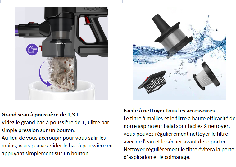 Aspirateur 45kpa Autonomie 50min Aspirateur Balai Sans Fil 550W, 45KPA, 65min Autonomie, 1.6L, Brosse Meilleurs Aspirateurs 2025 Le mode moyen peut être utilisé pendant 30 minutes, tandis que le mode basse vitesse permet de nettoyer toute la maison. Légers, maniables et polyvalents, les aspirateurs balais ne manquent pas d'atouts. Sans fil, ces appareils fonctionnent grâce à une batterie rechargeable 30 novembre 2025 8h57 580W/48KPA Aspirateur Balai sans Fil 65min, 1.6 L Aspirateur sans Fil Puissant avec Rechargeable Support Mural, Brosse Anti-Enmêlement Améliorée et OLED Écran Tactile, pour Sols Durs/Animaux/Voiture Amazon 139.99 € -26 La durée de vie de la batterie correspond aux différents modes d'alimentation: 25KPa-50min, 35KPa-30min, 45KPa-15min. Le mode haute vitesse est idéal pour les environnements les plus difficiles et les nettoyages rapides. Aspirateur balai sans fil flex rechargeable 22.2v - Livoo - DOH138V 【Trois Modes de Nettoyage】le mode basse vitesse jusqu'à 50 minutes réduit le temps de charge et évite les interruptions. L'aspirateur sans sac filtre complètement l'air inhalé, maintient les particules dans la couche filtrante, puis libère de l'air frais pour protéger votre santé et celle de votre famille. Chaque fois que l'aspirateur sans fil est démarré, l'aspirateur sans fil continue automatiquement avec la dernière vitesse de travail. 【Autonomie Maximale 50Mins & Batterie Amovible】 L'aspirateur sans fil est équipé d'une batterie amovible et rechargeable de grande capacité. 【45Kpa Aspiration Puissant】 L'aspirateur balai sans fil S10 est équipé du nouveau moteur sans balais 350W, qui peut produire une puissance d'aspiration maximale de 45KPa/140AW (mode de puissance à 3 niveaux). Cette conception conviviale peut vous aider à éclairer les crevasses dans l'obscurité et à améliorer l'effet de nettoyage. La batterie peut être chargée sur l'aspirateur à main, ou détachée et chargée séparément, ce qui est flexible et pratique. Buse Longue Plate Lumineuse