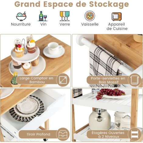 Les poignées latérales sont conçues pour suspendre des serviettes ou des torchons. Desserte roulante,chariot de cuisine avec 2 portes,2 tiroirs,étagères à Espace spacieux et trié : Ce chariot de service cuisine est conçu avec 2 larges tiroirs et 3 armoires debout, vous donnant beaucoup d'espace de stockage pour les ustensiles de cuisine triés. Matériau robuste et durable : Le meuble de cuisine est fabriqué en bois de chêne massif Une solution pratique et élégante pour votre espace culinaire ! ESPACE SPACIEUX : La desserte de cuisine dispose d'un large plan de travail et de 2 grands tiroirs, ce qui facilite l'organisation et le rangement de divers articles. Grand espace avec plan de travail, tiroirs, étagères ouvertes et poignées latérales. Utilisez-le comme chariot, bar ou table de petit-déjeuner, ou comme support pour vos appareils électroménagers. De plus, elle peut servir de support pour le micro-ondes ou d'autres appareils électroménagers de cuisine, répondant ainsi aux divers besoins de l'utilisation quotidienne de la cuisine. Description du produit Bienvenue chez KOMFOTTEU : Le chariot de cuisine multifonctionnel allie un design compact et élégant à une construction durable en bois naturel, apportant de la chaleur à votre cuisine. Meuble Cuisine Mobile étagères COSTWAY Chariot De Service Cuisine, Desserte Avec Roulette Universelle Et Plateau En Bois, 2 Etagère De Rangement,3 Tiroirs Blanc 67 X 37 X 83,5 CM Desserte Roulante Bois Mobilité facile grâce à 4 roulettes pivotantes en caoutchouc de haute qualité. DlandHoe Desserte à roulettes Cuisine Rangeent roulettes Buffet... Tenir hors de portée des enfants. SCÉNARIOS D'APPLICATION POLYVALENTS : Cette île de cuisine peut non seulement être utilisée comme chariot dans la cuisine, mais peut également être transformée en bar ou en table de petit-déjeuner, améliorant ainsi le confort et la commodité de la maison. Le bois de caoutchouc résistant est durable et facile à nettoyer. Utiliser avec précaution sur des surfaces inégales pour éviter le basculement. Les roulettes sont fabriquées en caoutchouc de haute qualité, ce qui garantit un déplacement silencieux et fluide. Les 2 étagères ouvertes dans la partie inférieure offrent un espace de rangement idéal pour les grands ustensiles de cuisine, tels que les casseroles et les plateaux. Assurez-vous que toutes les pièces sont correctement sécurisées avant utilisation. Avec un large plan de travail, 2 tiroirs et des étagères ouvertes, il facilite le rangement des ustensiles et des casseroles.