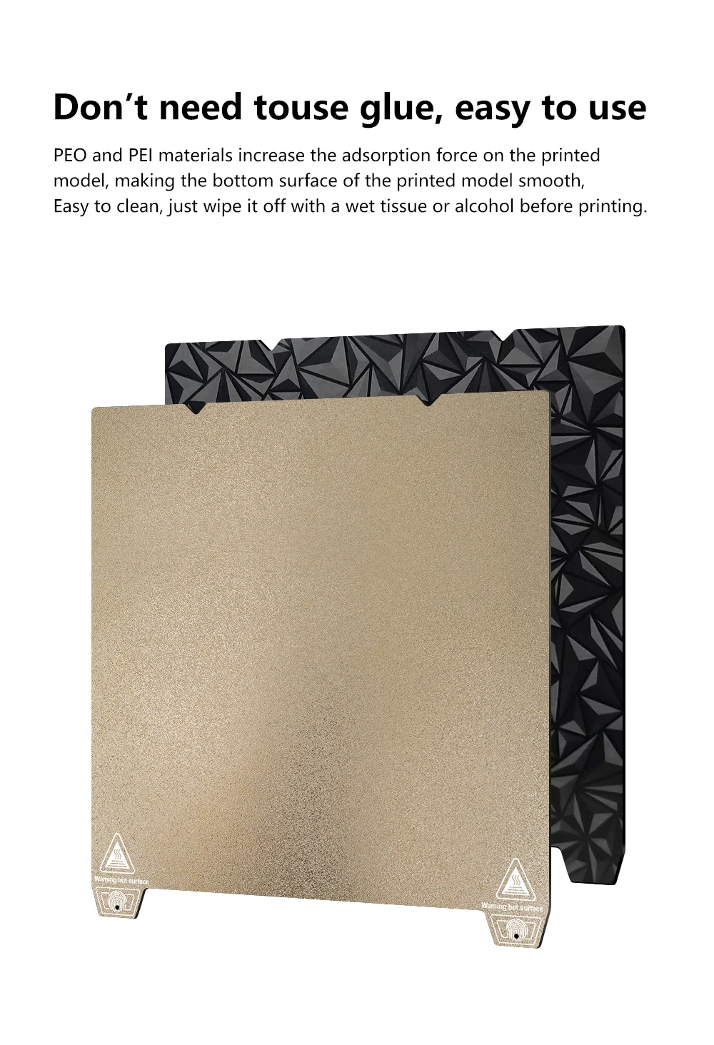 PEI pour imprimer PLA /PETG/PC/ABS/TPU/nylon, etc. Résistance maximale à la température : PEY-Smooth : max 180℃ Flocon PEF/étoile : max 180 ℃ PET/PEO : max 120 ℃. Modèle compatible : avec une taille de 370 x 370 mm, cette plaque de construction double face est adaptée pour K2 Plus, le produit imprimé sera exquis et beau Unique bottom effect: The front is a PEI build plate, and the back can be selected from PET fiber pattern, PEO diamond pattern, PEY starry sky pattern, and PEI frosted pattern Contenu : 1 plaque d'impression recto-verso Creality K2 Plus. Plaque de construction - RNCYN - Creality K1/H1H - 235x235 mm K2 Plus - Plage de températures élevées : PEI est max 300℃, PET/PEO est max 120℃, PEY est max 180℃ Démoulage facile : avec la base magnétique d'origine (vendue séparément), la plaque d'acier à ressort peut être facilement pliée et retirée après un léger refroidissement après impression Plateau Magnétique Flexible K2 Plus YUYUEMI Plaque De Construction Pour Creality K2 Plus PEI En Plaque Double Face Creality K2 Plus 370x370 Texture dorée PEI : max 300 ℃., 6., PEO/PET pour imprimer du PLA, du PETG. Caractéristiques : Dimensions : 370 x 370 mm. Compatible avec : tôle d'acier à ressort Creality K2 Plus., 4., Double face : les deux côtés peuvent être imprimés.