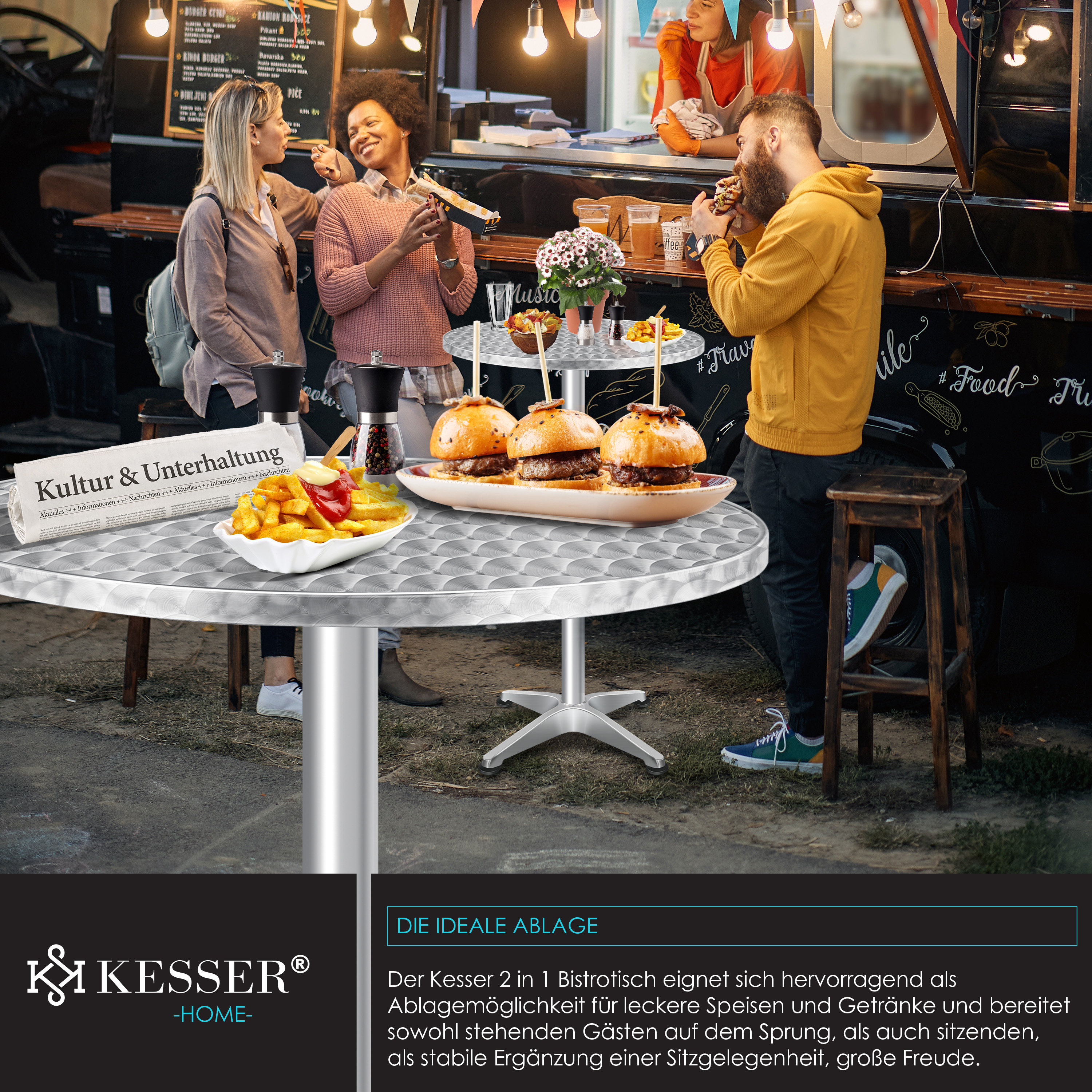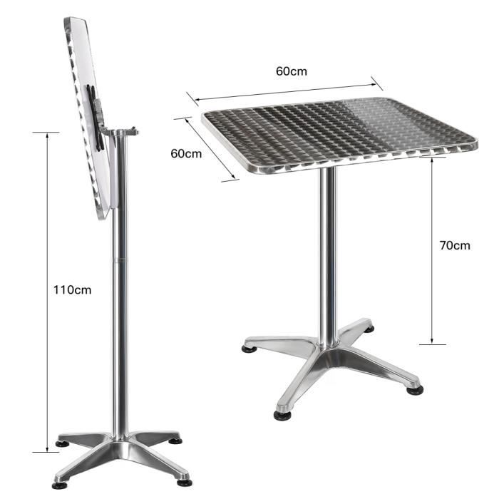 Grande stabilité grâce au pied à 4 croisillons. Que ce soit pour les fêtes d'entreprise, les fêtes, les mariages, les réceptions ou tout simplement comme table mange-debout pratique pour le club, ce meuble d'événement KESSER est facile d'entretien, robuste et fait tout simplement partie de tout équipement festif. Structure en aluminium résistant aux intempéries. Grande stabilité : la table pliante dispose de 4 pieds avec vis réglables pour compenser les irrégularités du sol Un support sûr et respectueux du sol est assuré par quatre pieds avec picots en caoutchouc. Bonne qualité(4713) Ensemble Table de jardin + 2 chaises, pliable, Ensemble à dîner d'extérieur Utilisez la table uniquement sur un sol plat et veillez à ce qu'elle ne soit pas laissée sans surveillance pour éviter les blessures ou les dommages. Pratique : la table de bistrot est facile à ranger ou à transporter grâce au plateau de table pliable. Lot de 1 table 2 bancs pliables rectangulaires Dès 131,78€ HT Table Fête Mariage Réception CASARIA® Table De Bar Bistrot Pliable Ronde Diamètre 60 Cm Hauteur Réglable 70 Cm / 115 Cm 2 En Table Fête Intérieur Extérieur Pieds en plastique pour éviter les rayures sur le sol. La table peut être utilisée à l'extérieur comme à l'intérieur. KESSER Table haute et table de bistrot pliable 2 en 1 en aluminium résistant aux intempéries, résistant aux intempéries, inoxydable, lavable et facile d'entretien et donc polyvalent La plaque résistante aux intempéries donne une impression élégante et est facile à nettoyer. Avertissement De Sûreté Attention : veuillez vous assurer que la table est correctement assemblée et ancrée pour éviter de basculer ou de se renverser. Description du produit KESSER Table haute et table de bistrot pliable 2 en 1 en aluminium résistant aux intempéries, résistant aux intempéries, inoxydable, lavable et facile d'entretien et donc polyvalent. Facile à utiliser : hauteur de la table comme table haute 115 cm | Hauteur de la table comme bistro 70 cm | Diamètre du tube : 6 cm | Matériau : aluminium | acier inoxydable | MDF